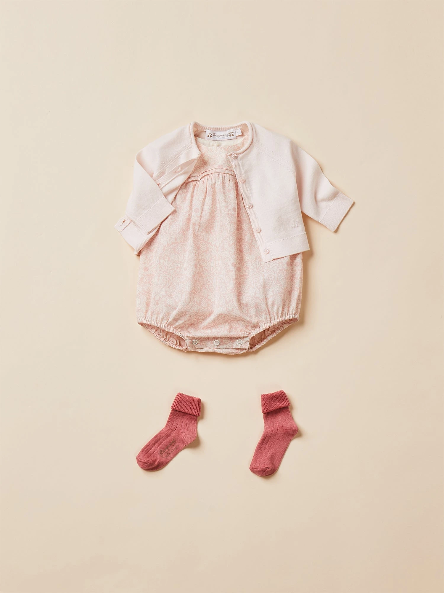 La barboteuse Florentina pour bébé sait se faire remarquer avec son joli tissu Liberty Tana Lawn. Ce modèle adapté dès la naissance s’agrémente de volants aux emmanchures.