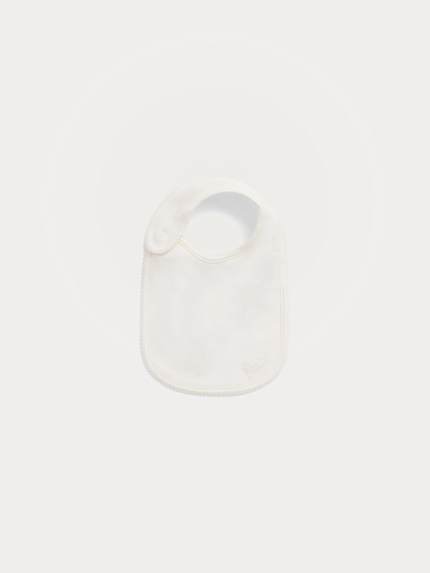 Ce bavoir pour bébé Avibis est très élégant avec ses finitions à picots et sa broderie Bonpoint en ton sur ton devant. Il est confectionné en tissu velours éponge.