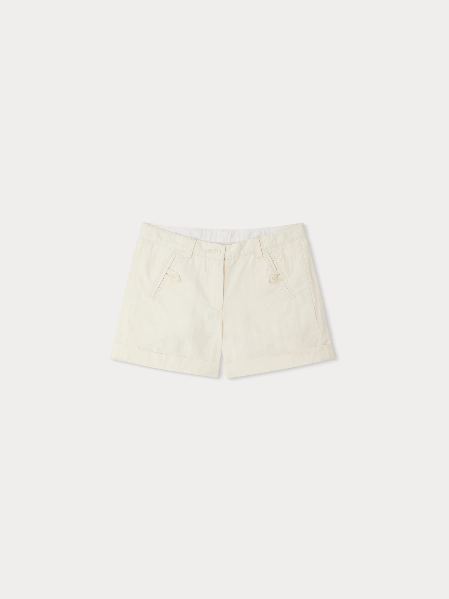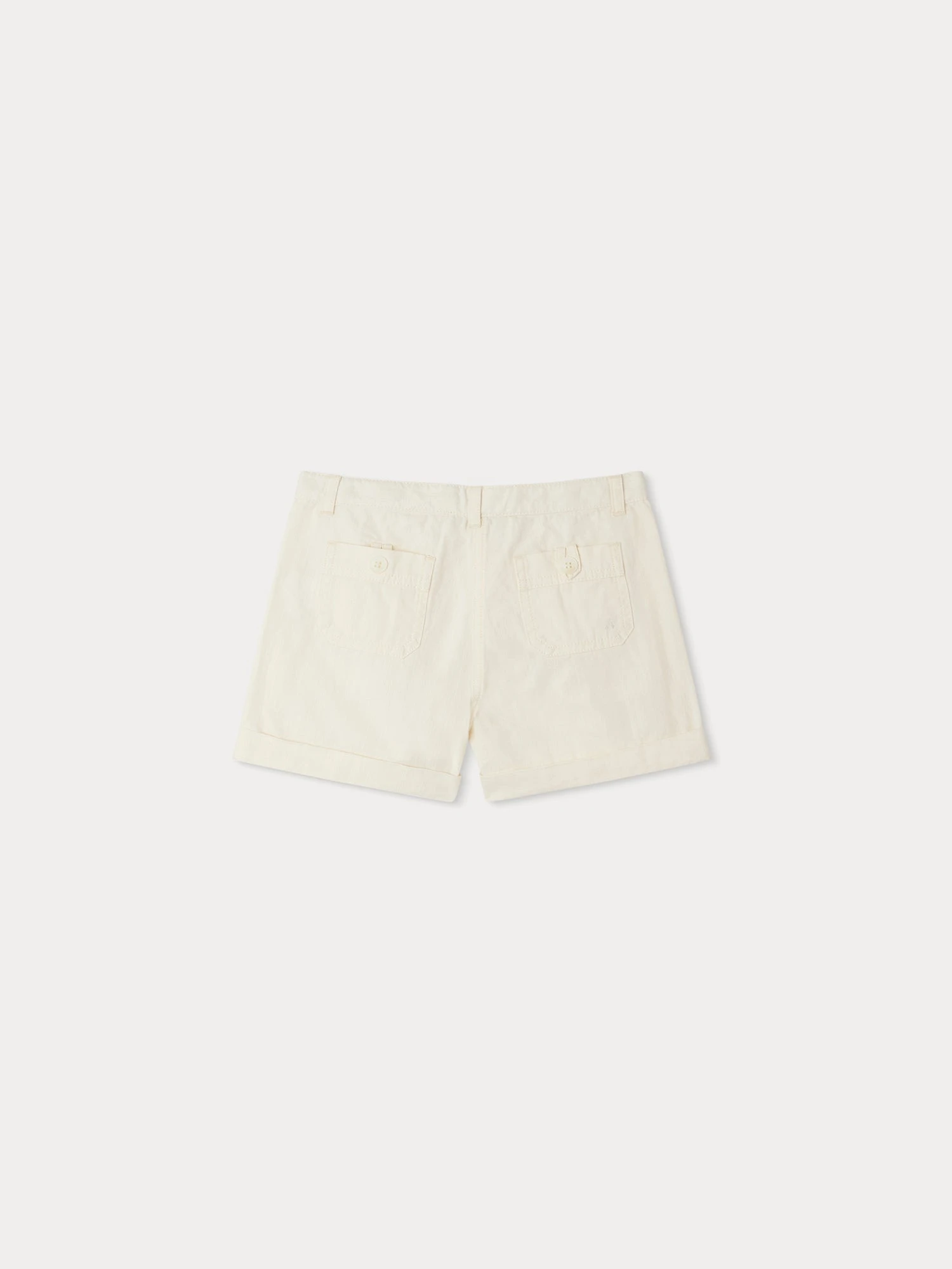 Ce bermuda pour fille Calista est un intemporel du vestiaire avec sa coupe droite courte. Ses poches passepoilées devant et plaquées au dos se ferment à l’aide d’un bouton.