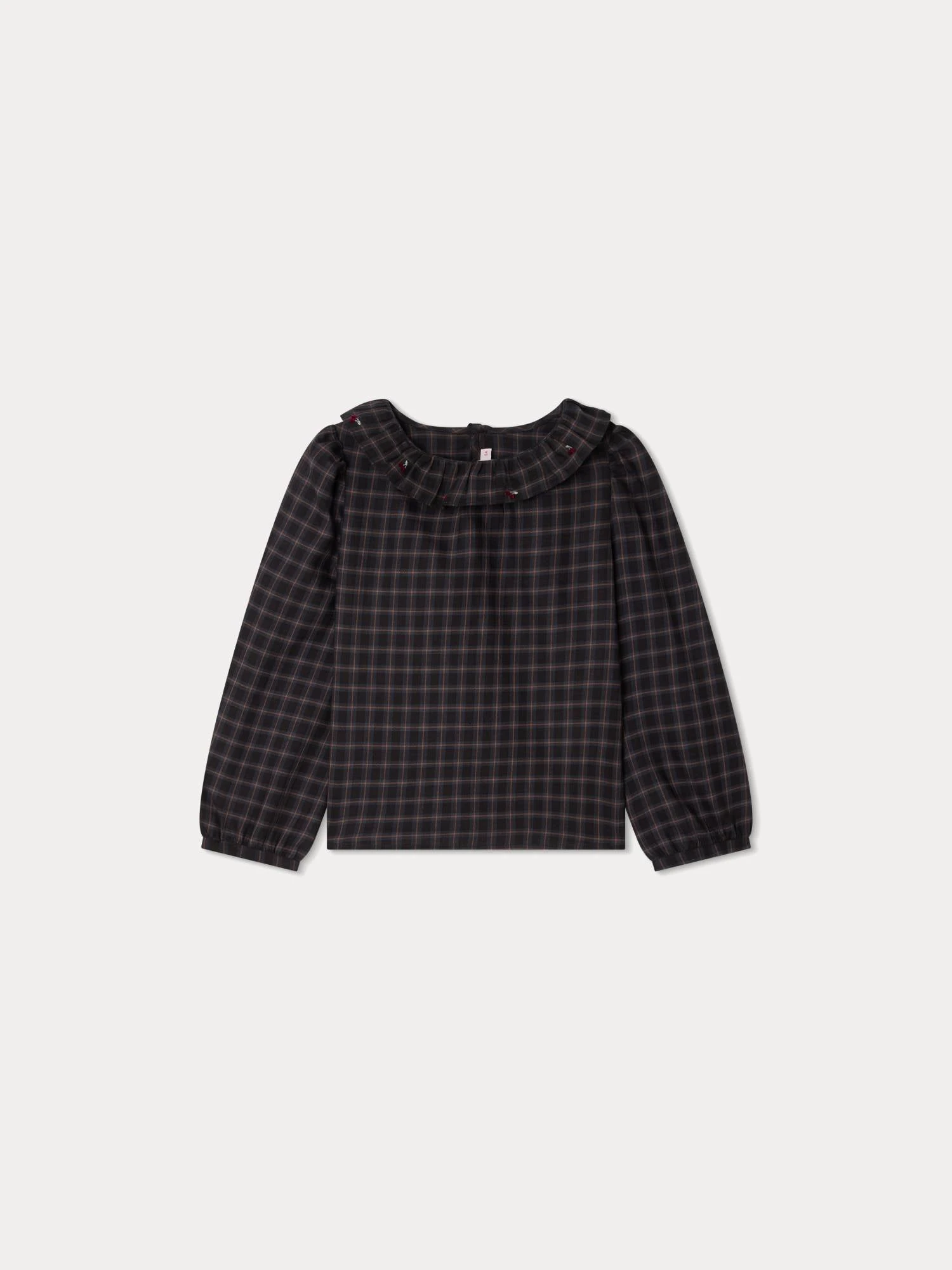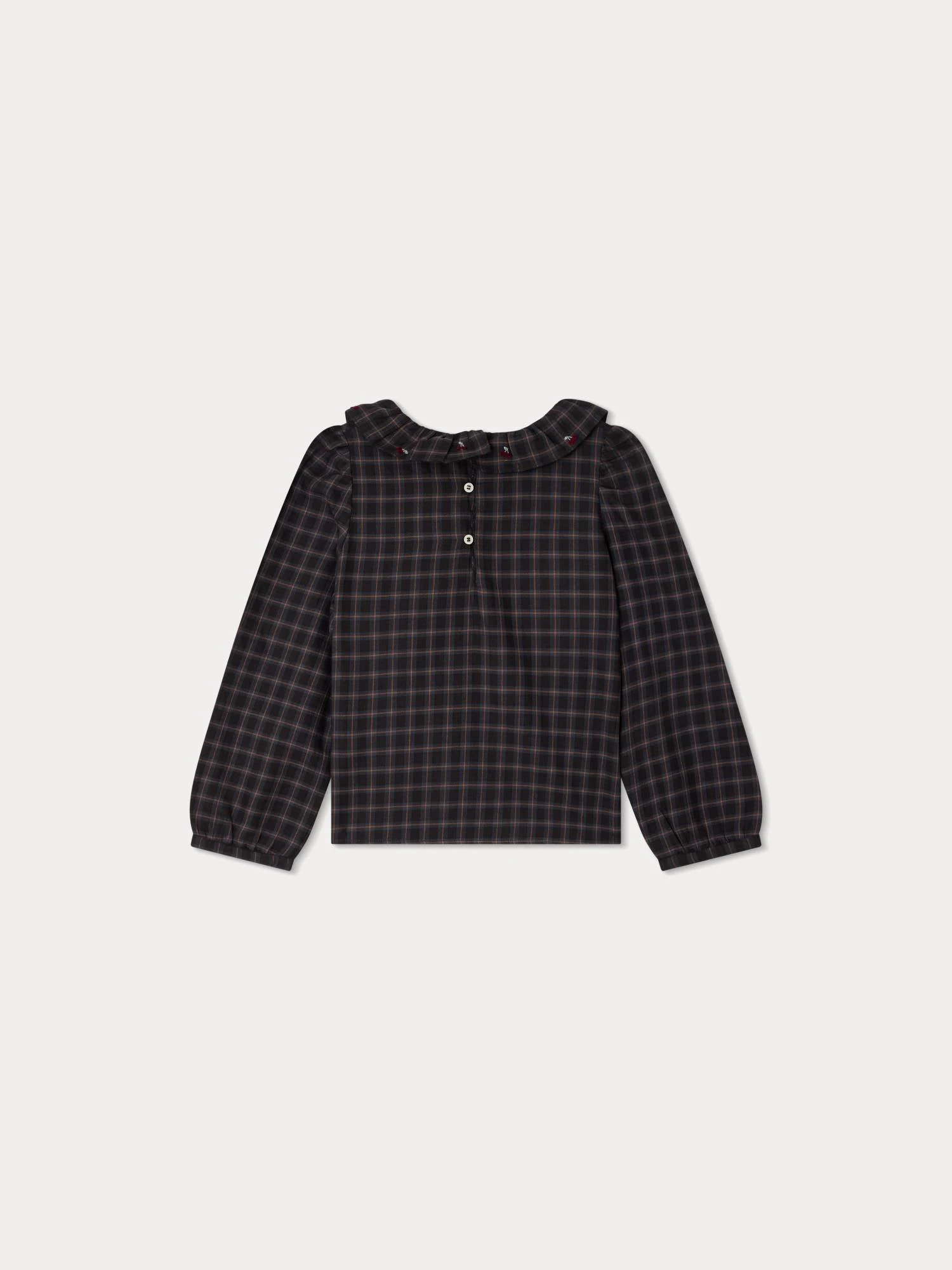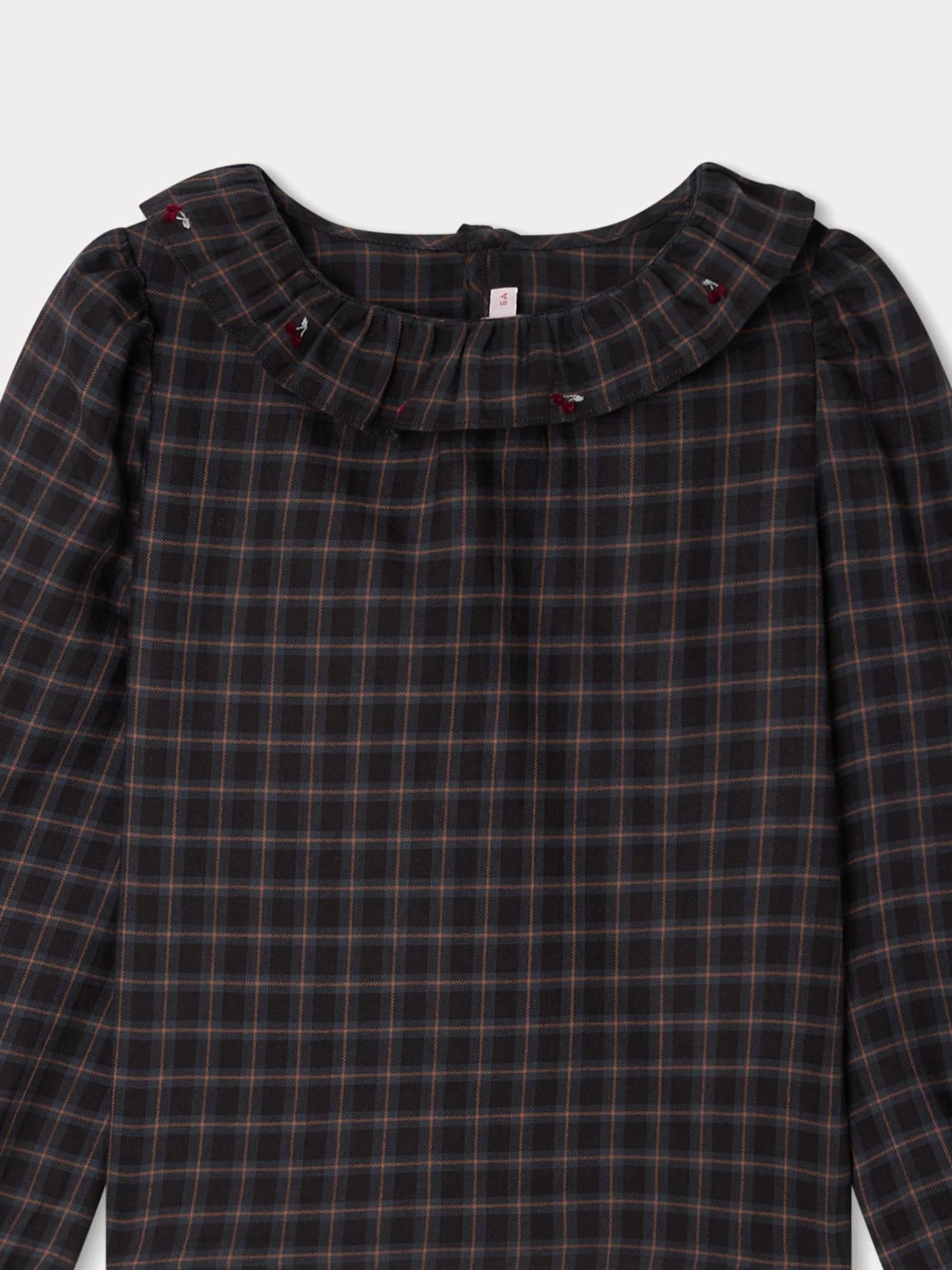 Ornée d’une collerette brodée de petites cerises, cette blouse à manches longues Timber pour fille se boutonne au dos par 3 petits boutons nacrés. Ce modèle iconique Bonpoint se décline ici dans un coton doux à carreaux.