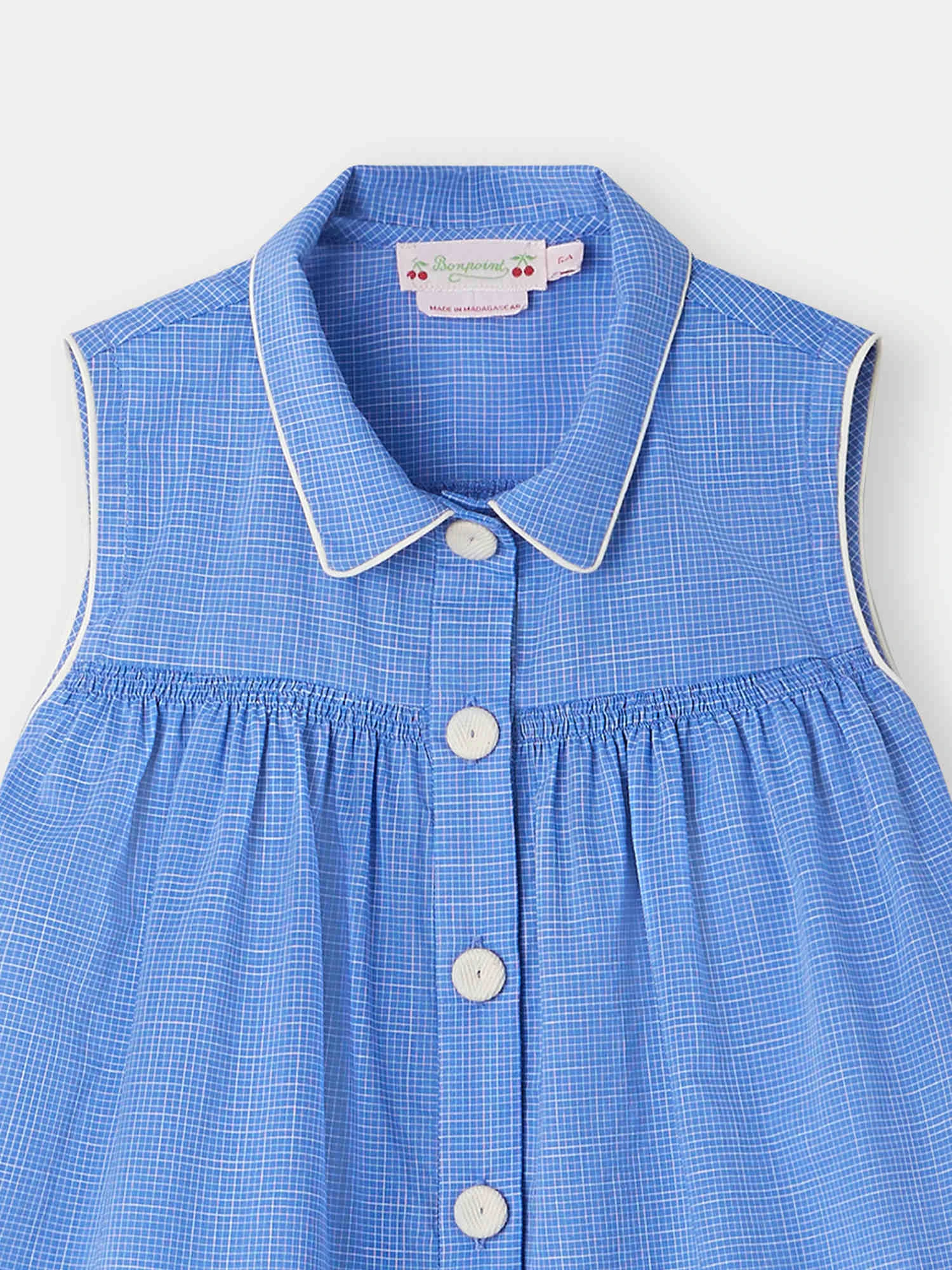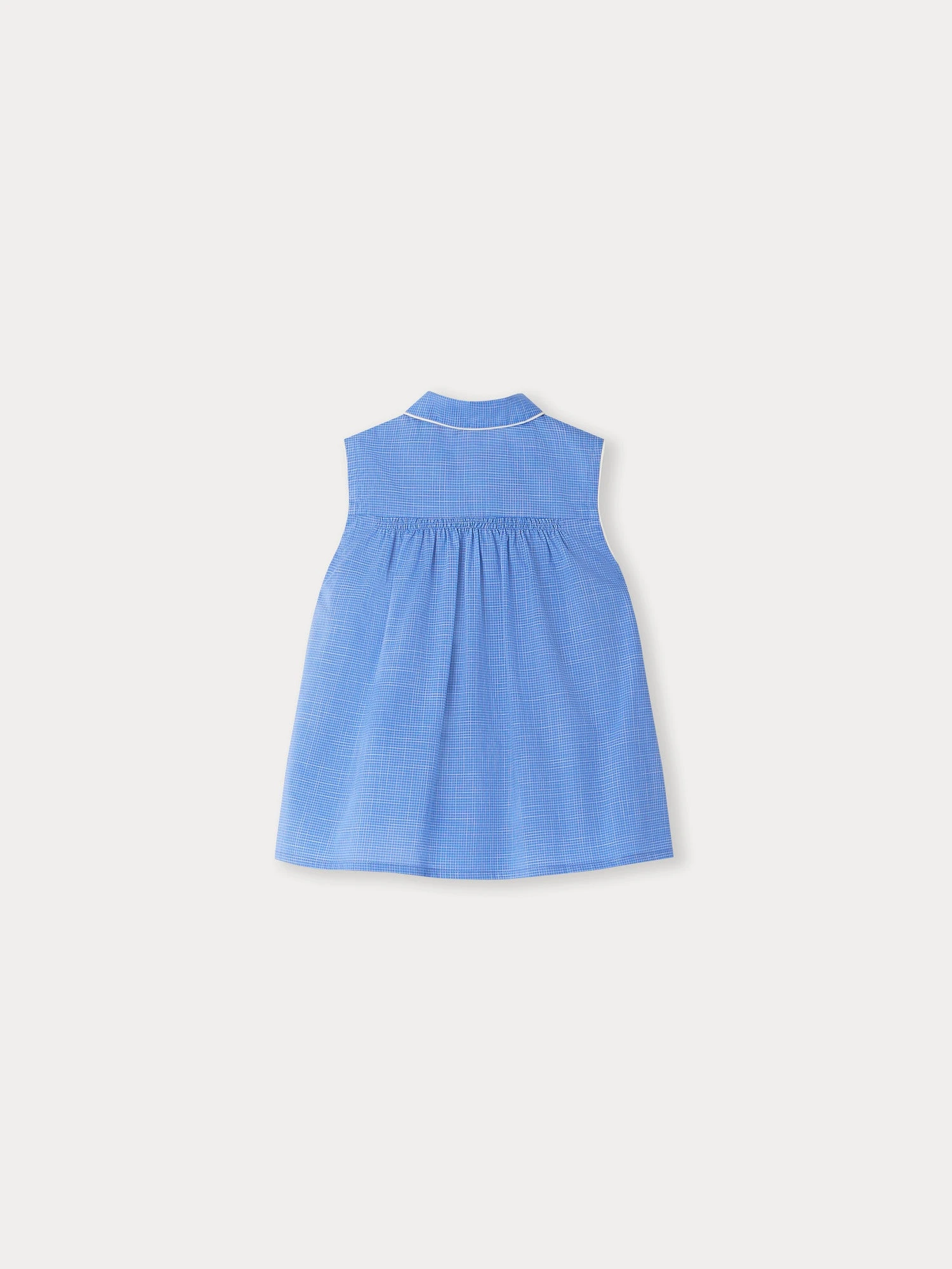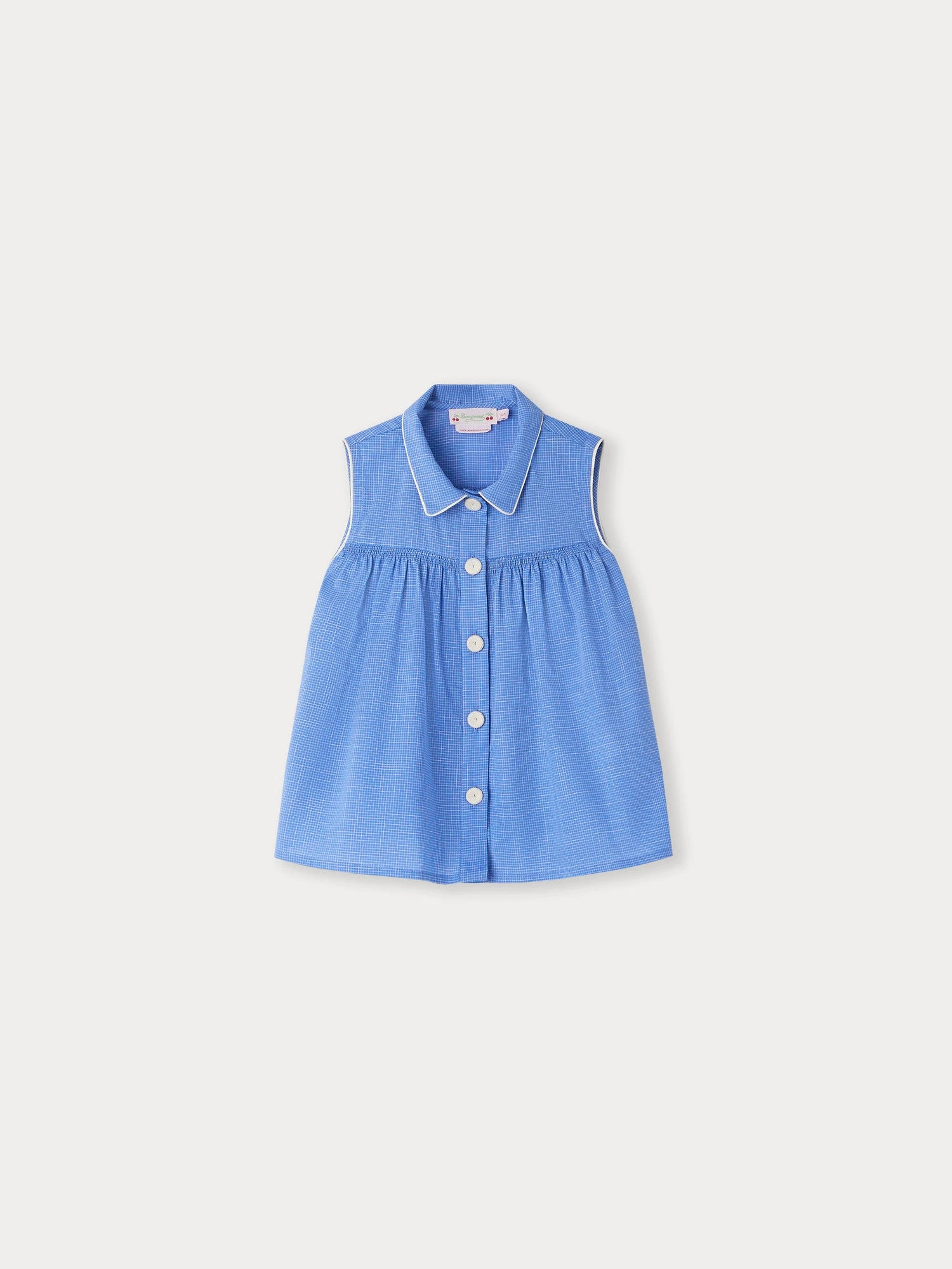 La blouse Fedra pour fille se distingue par son imprimé rétro bicolore aux tout petits carreaux. Un passepoil contrastant termine le bord du col à revers et des emmanchures.