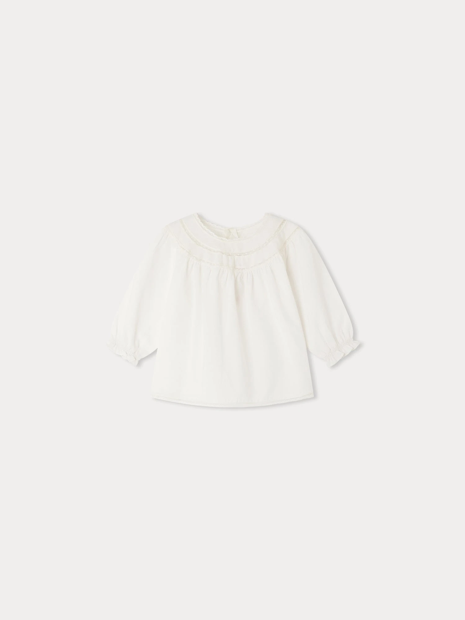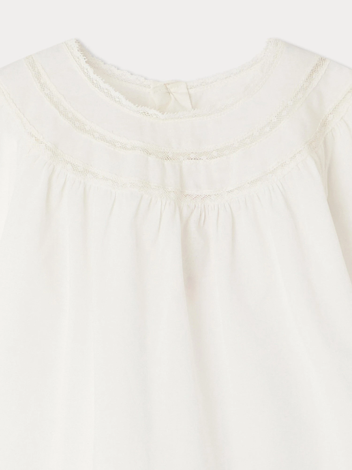 Confectionnée en voile de coton biologique, cette blouse pour bébé Felexi est élégante et agréable à porter. Elle est rehaussée de broderies faites à la main et d’empiècements en dentelle de Calais.