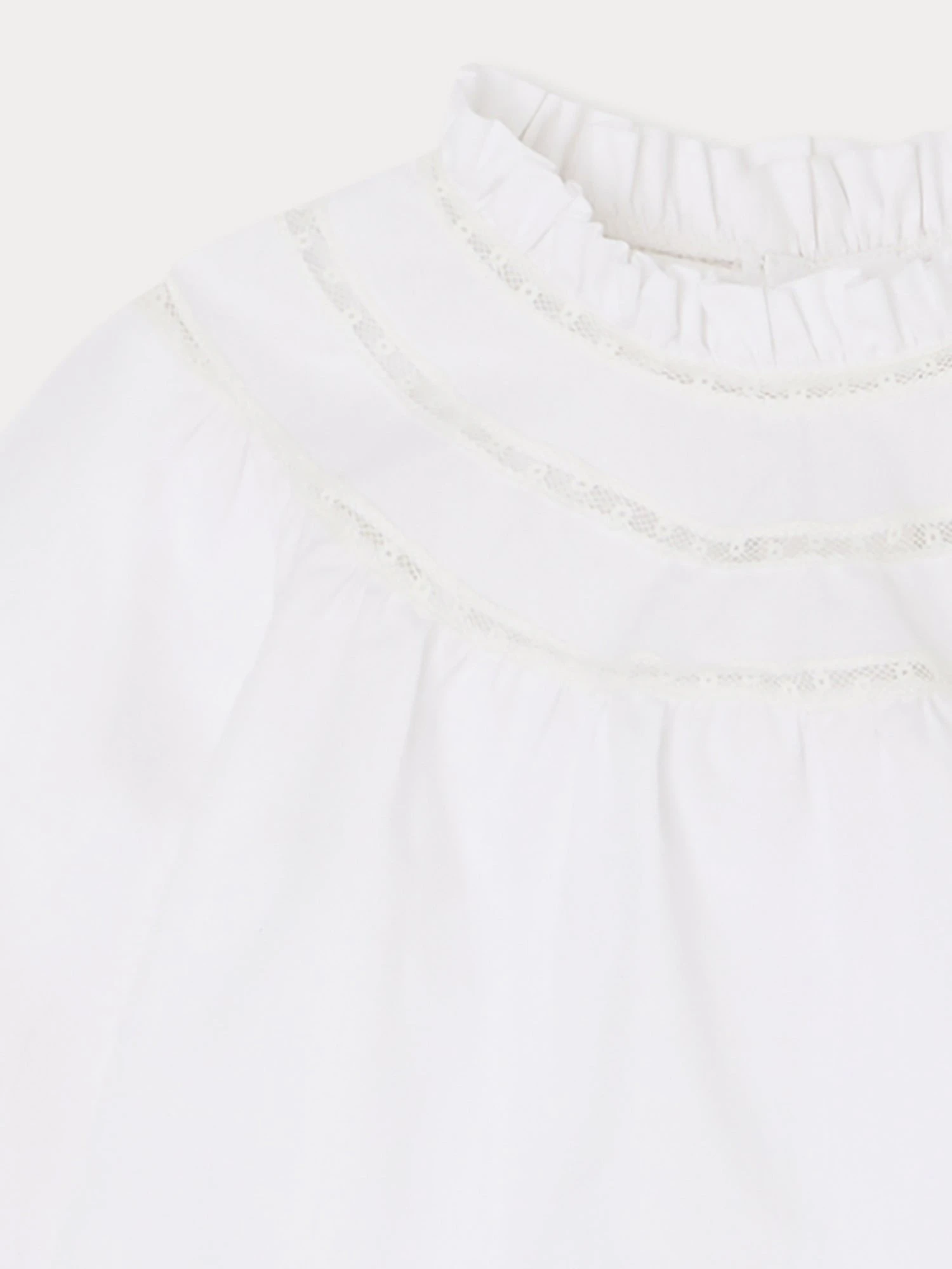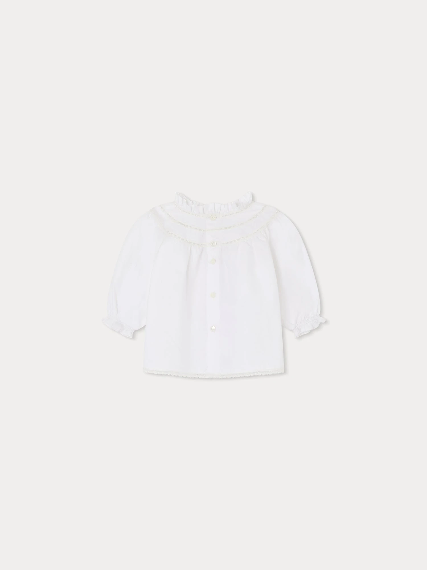 En coton biologique fin et doux, cette blouse unie Jelexi pour bébé s’orne d’un col et de poignets volantés. L’empiècement rond en corolle est rehaussé d’entre-deux de dentelle.