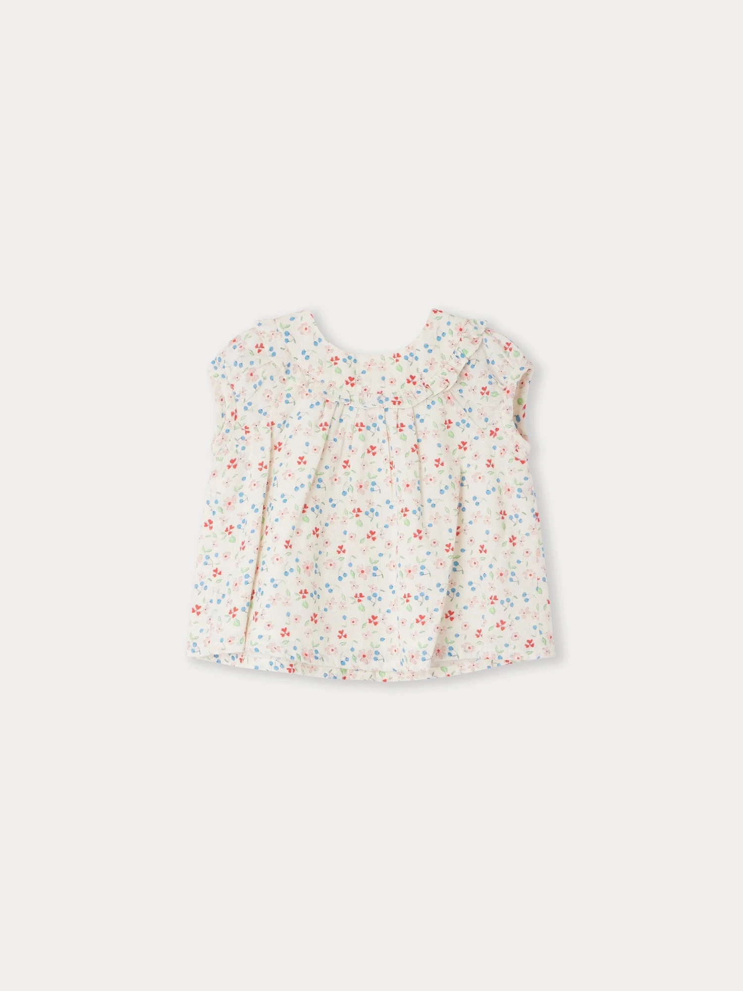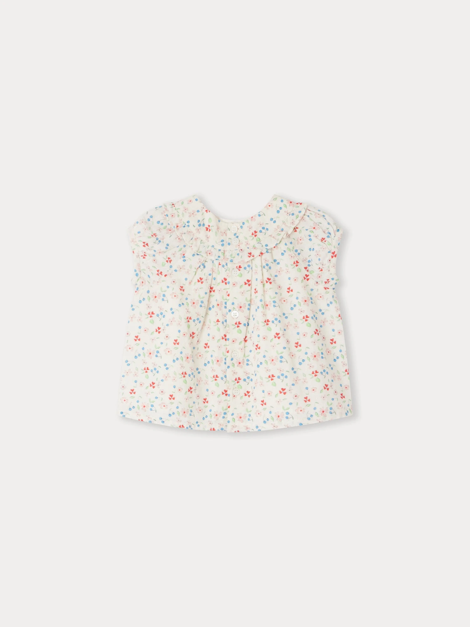 Des fleurs pleines de délicatesse décorent l’intégralité de la blouse Line pour bébé. Un empiècement arrondi fini d’un volant s’invite autour du col rond.