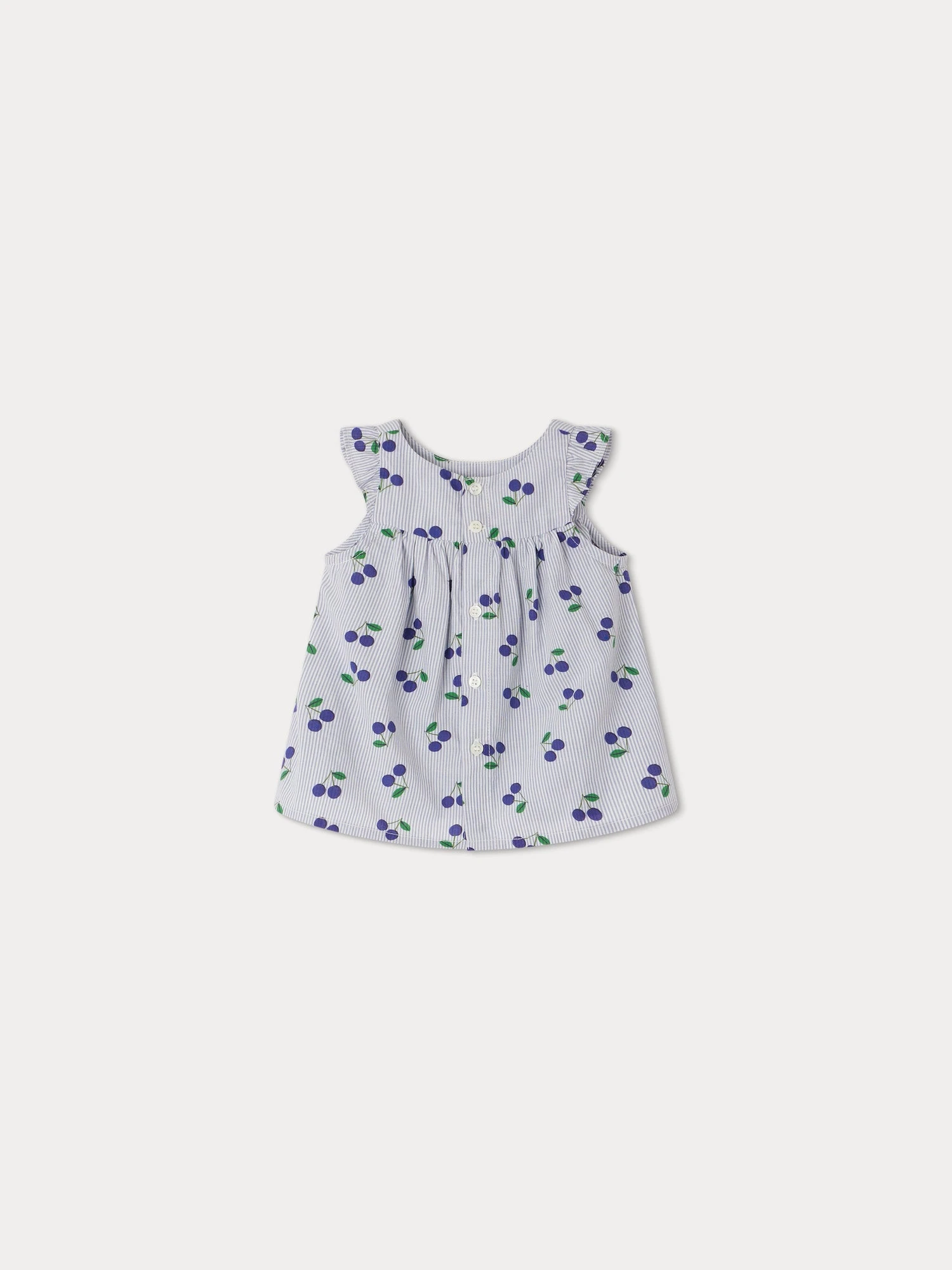 Les cerises emblématiques créent un contraste esthétique sur les rayures verticales imprimées de la blouse Lutine pour bébé. Les mancherons sur les épaules se composent d’un volant.