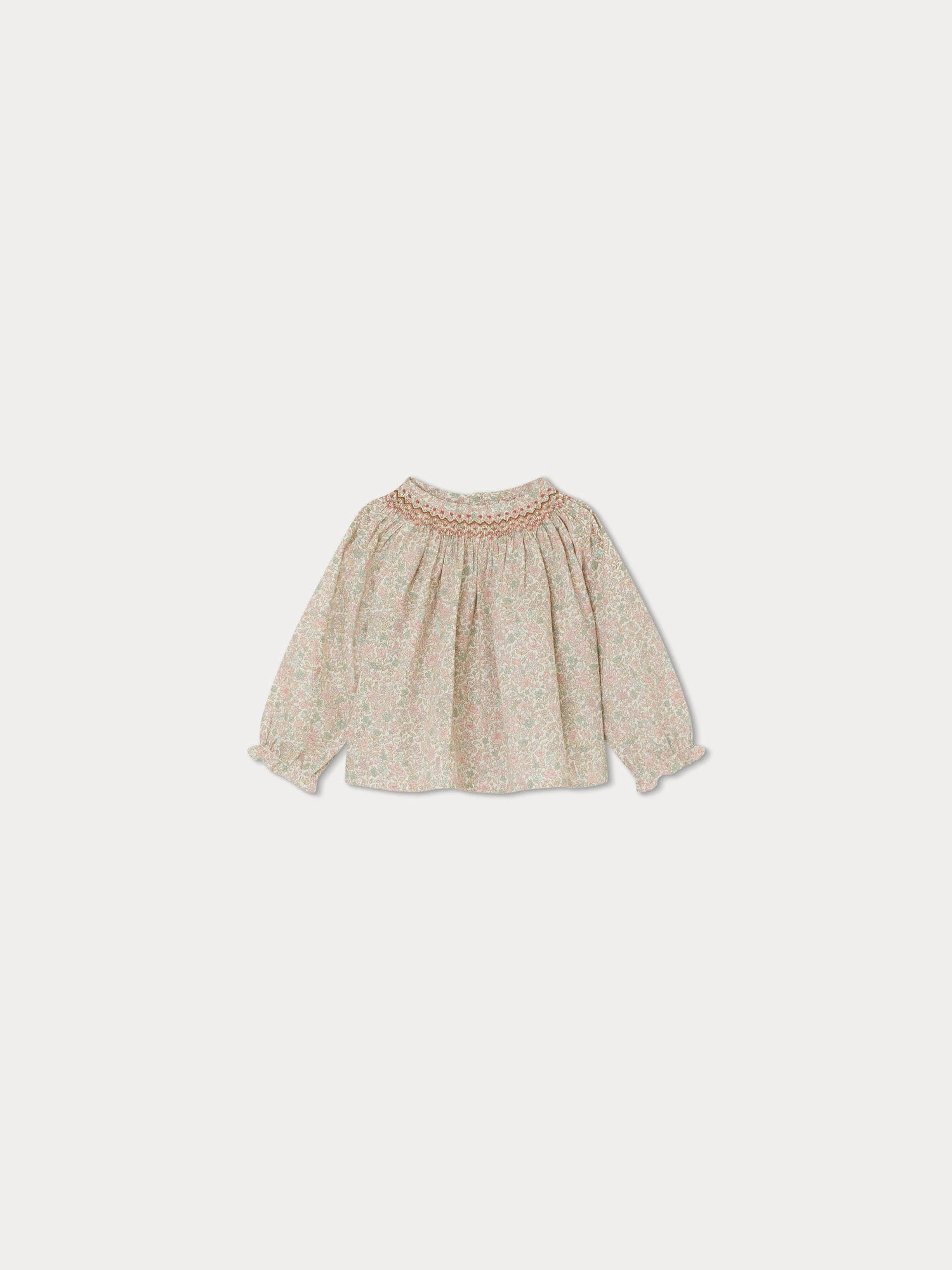 Caractérisée par ses smocks et ses broderies colorées autour de l’encolure, la blouse Griotte pour bébé est un essentiel de la Maison. Ce modèle fluide se décline dans un tissu Liberty à l’imprimé fleuri.