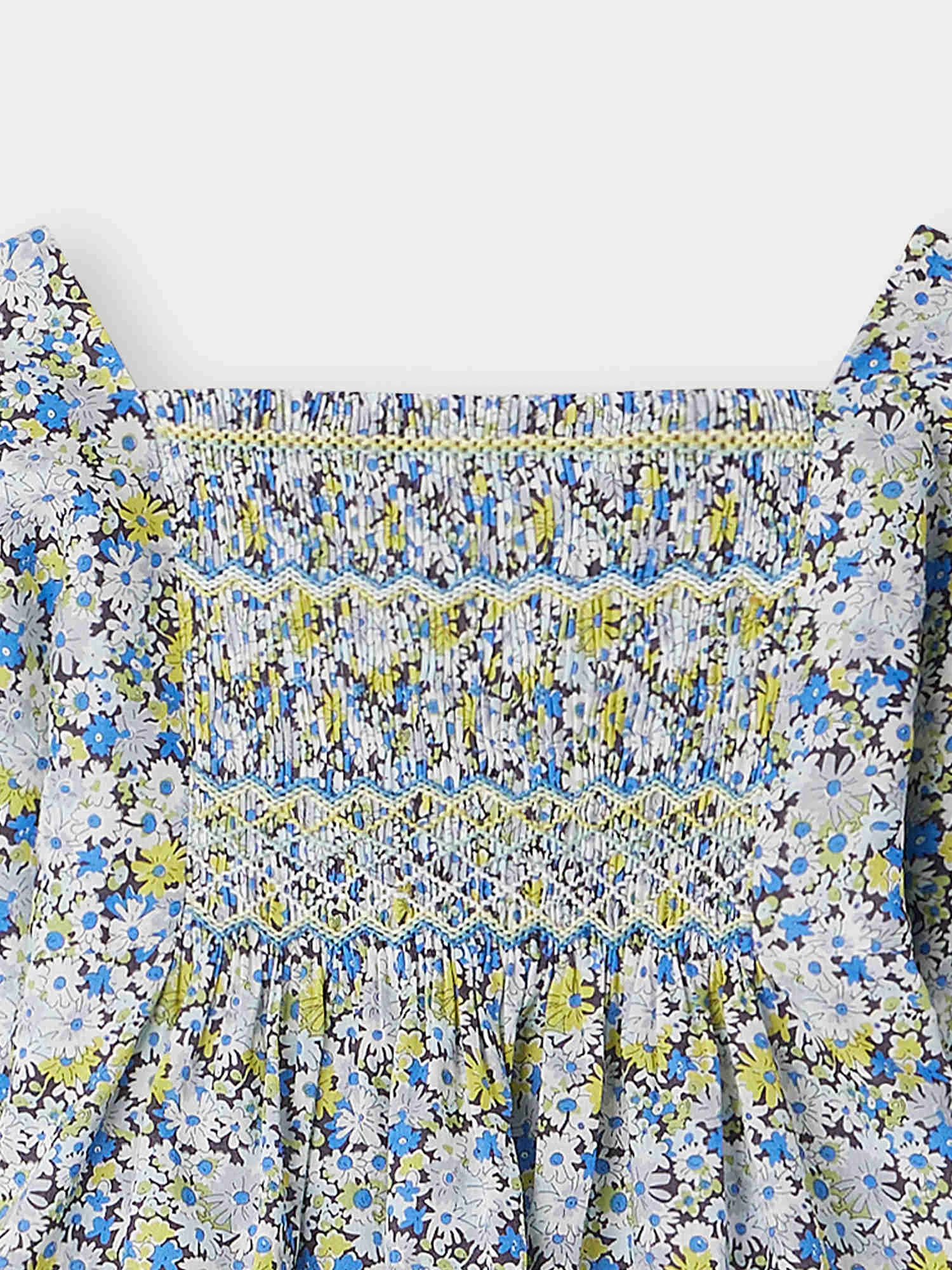 Confectionnée en coton biologique, cette blouse pour fille Pays séduit par son tissu Liberty aux motifs frais et colorés. Elle comporte des smocks brodés à la main sur le buste.