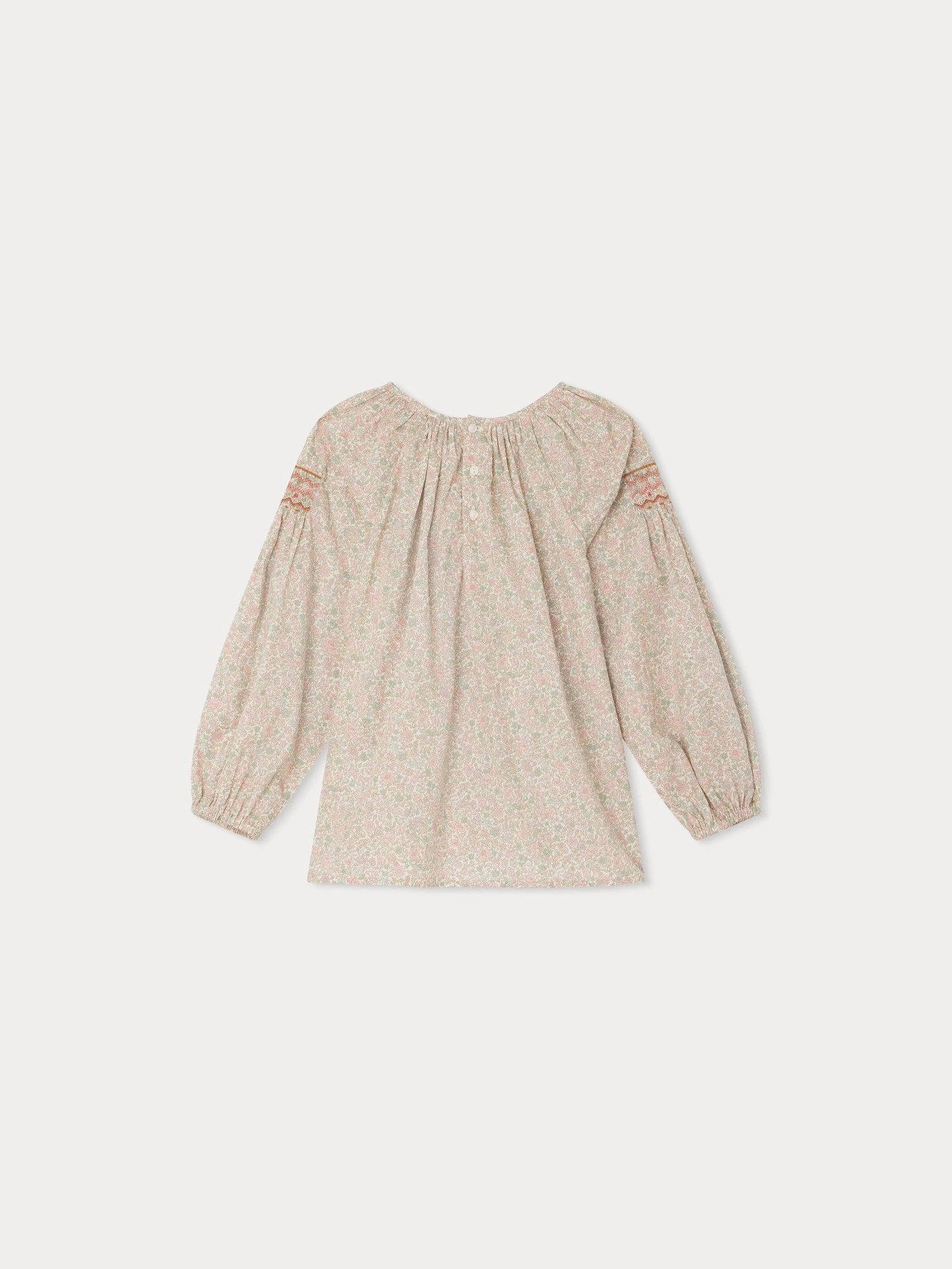 Dotée d’un joli volume en corolle avec détails smockés, l’iconique blouse Poldie pour fille s’habille d’un tissu Liberty aux motifs doux. Elle se ferme au dos par 3 petits boutons nacrés.