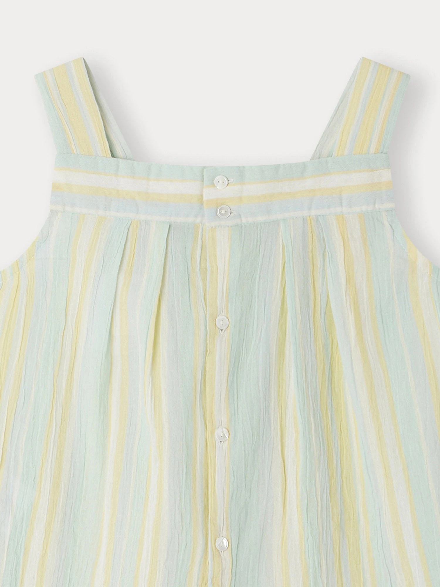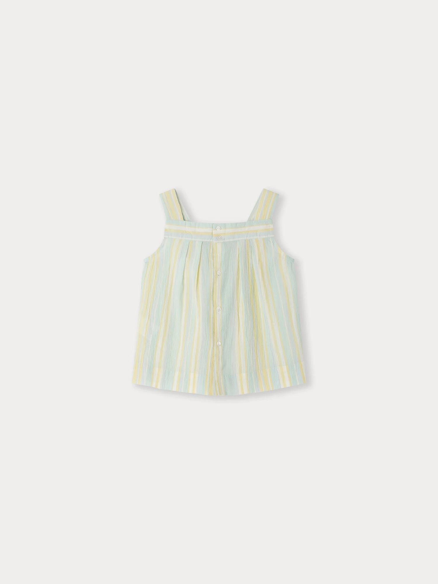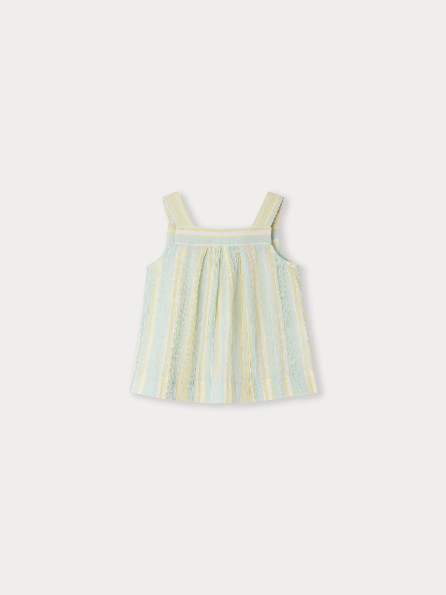 La blouse Soleil pour fille se démarque par ses rayures lumineuses aux multiples teintes tendres. Ce modèle fluide, à la coupe légèrement évasée, est agrémenté de larges bretelles tendance.