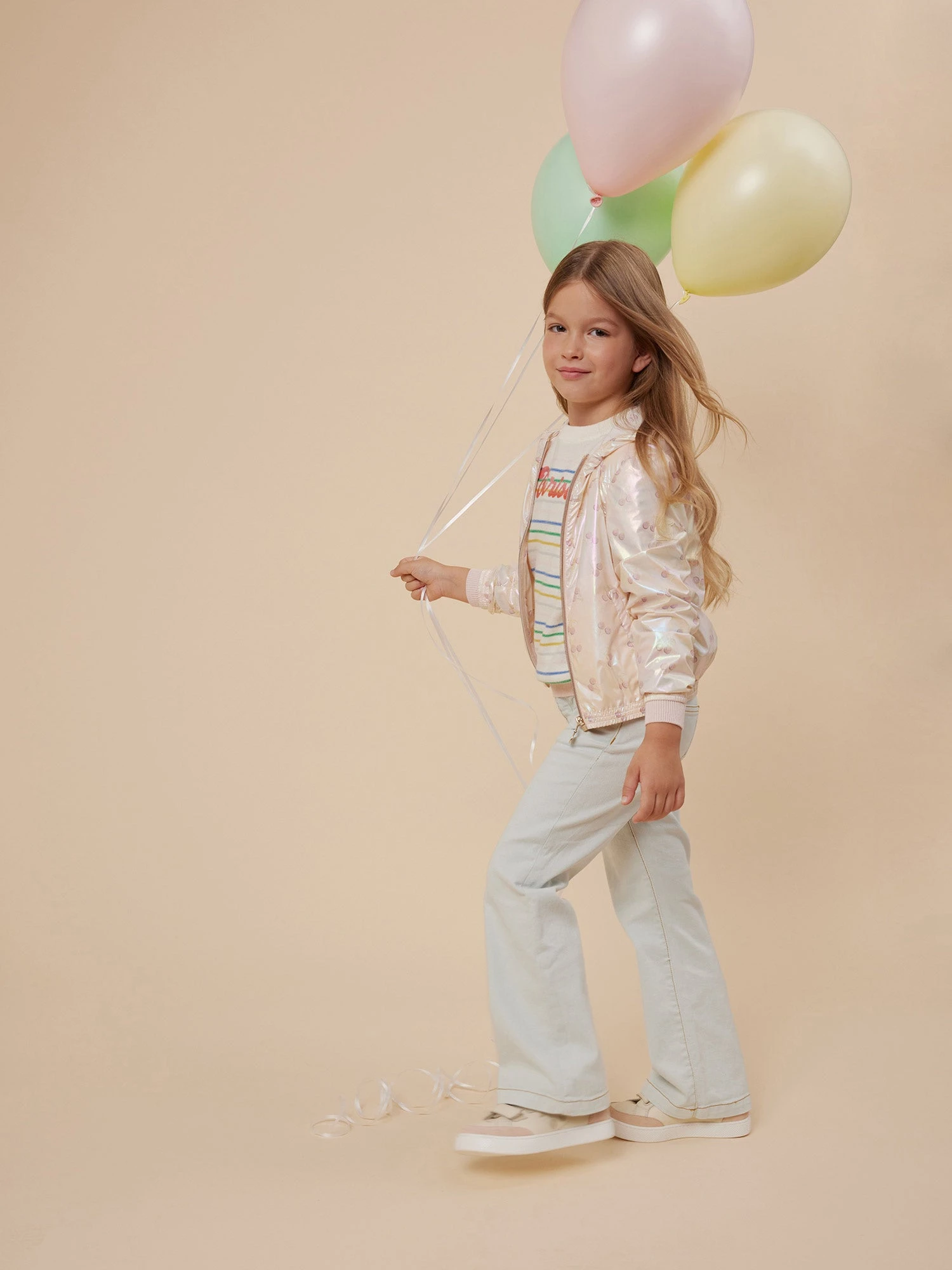 Le coupe-vent irisé à capuche Gytha pour fille, léger et déperlant, est imprimé de cerises sur l’ensemble. Capuche, poignets et base sont élastiqués pour protéger de la pluie.