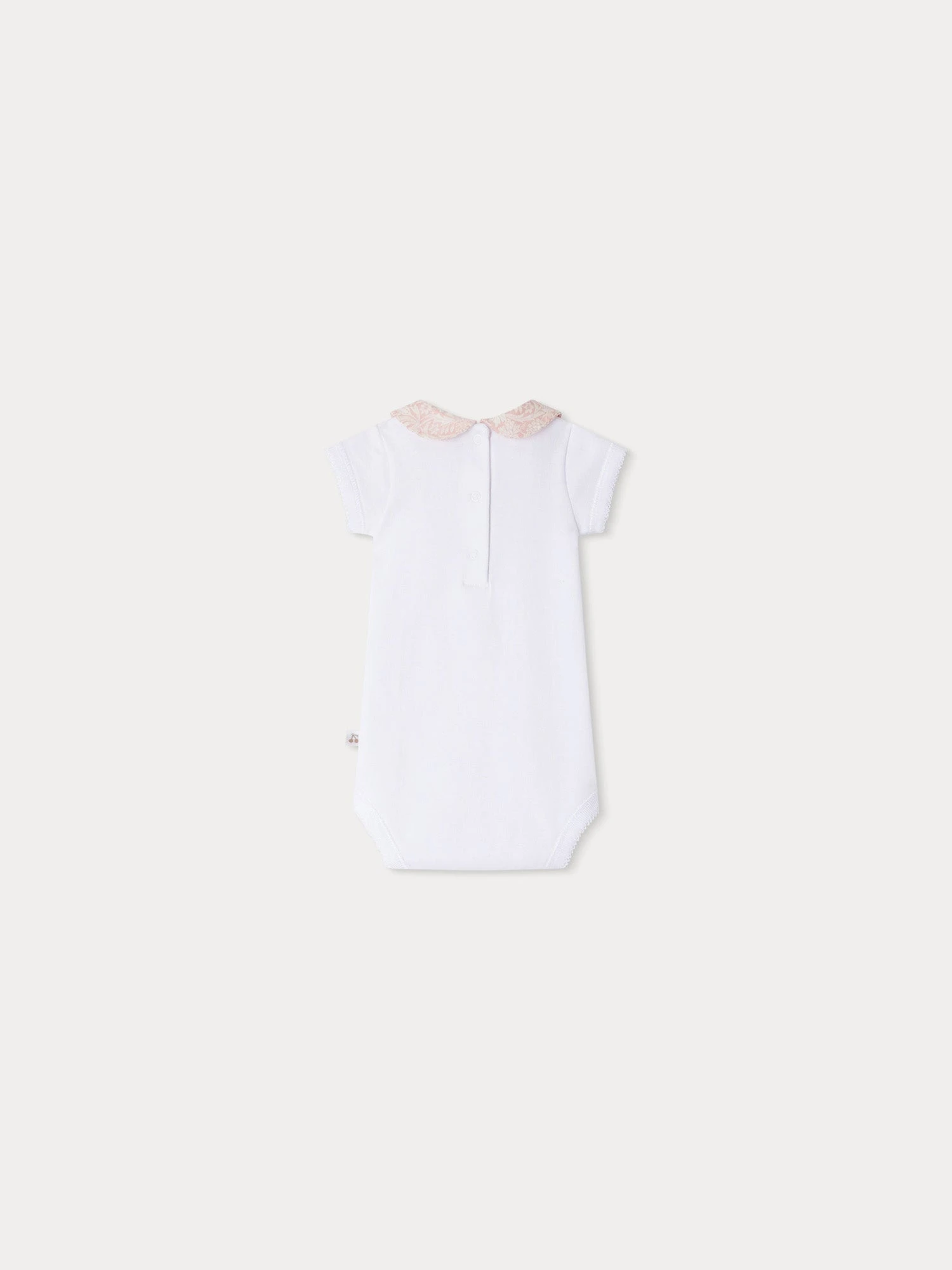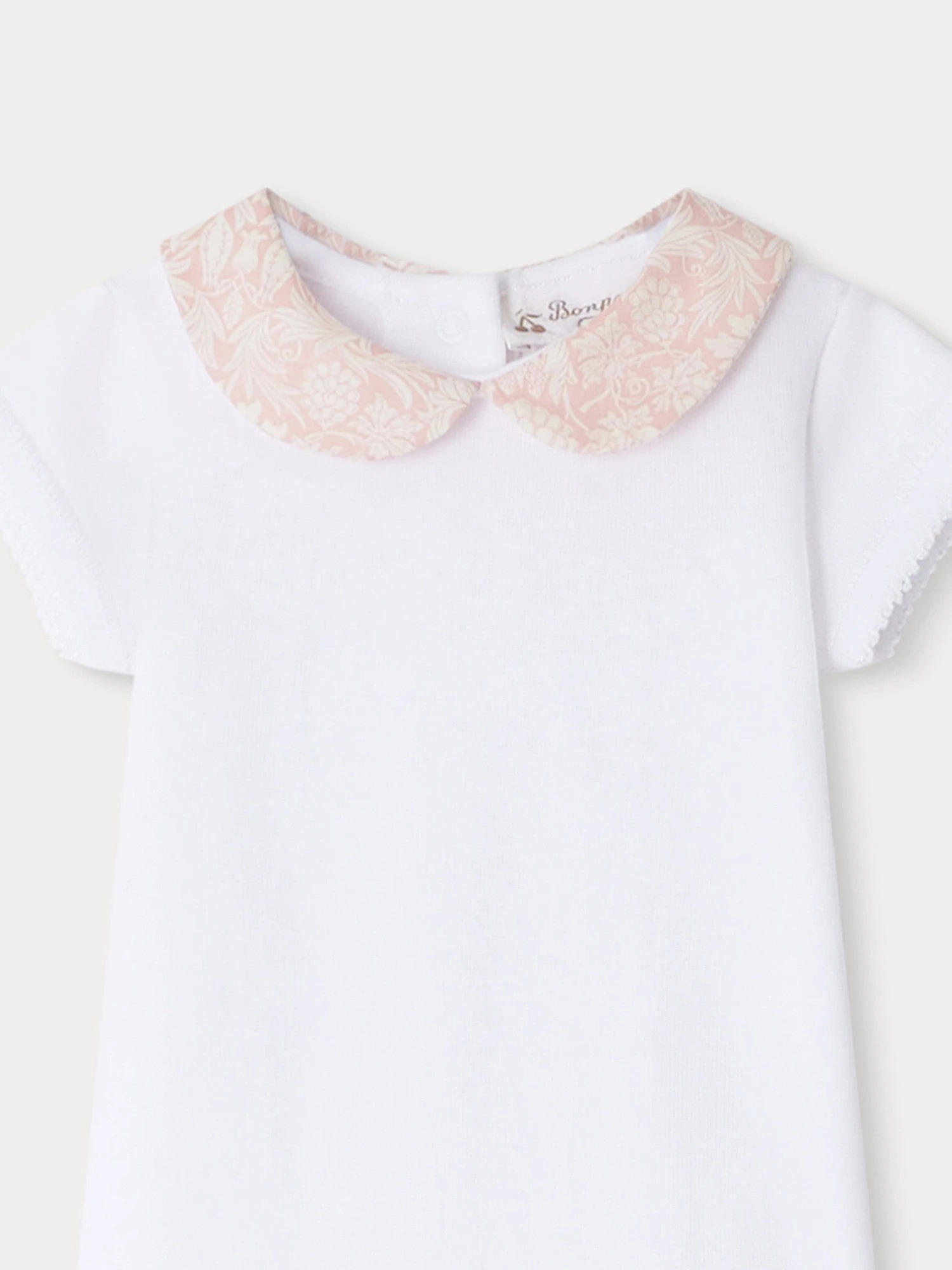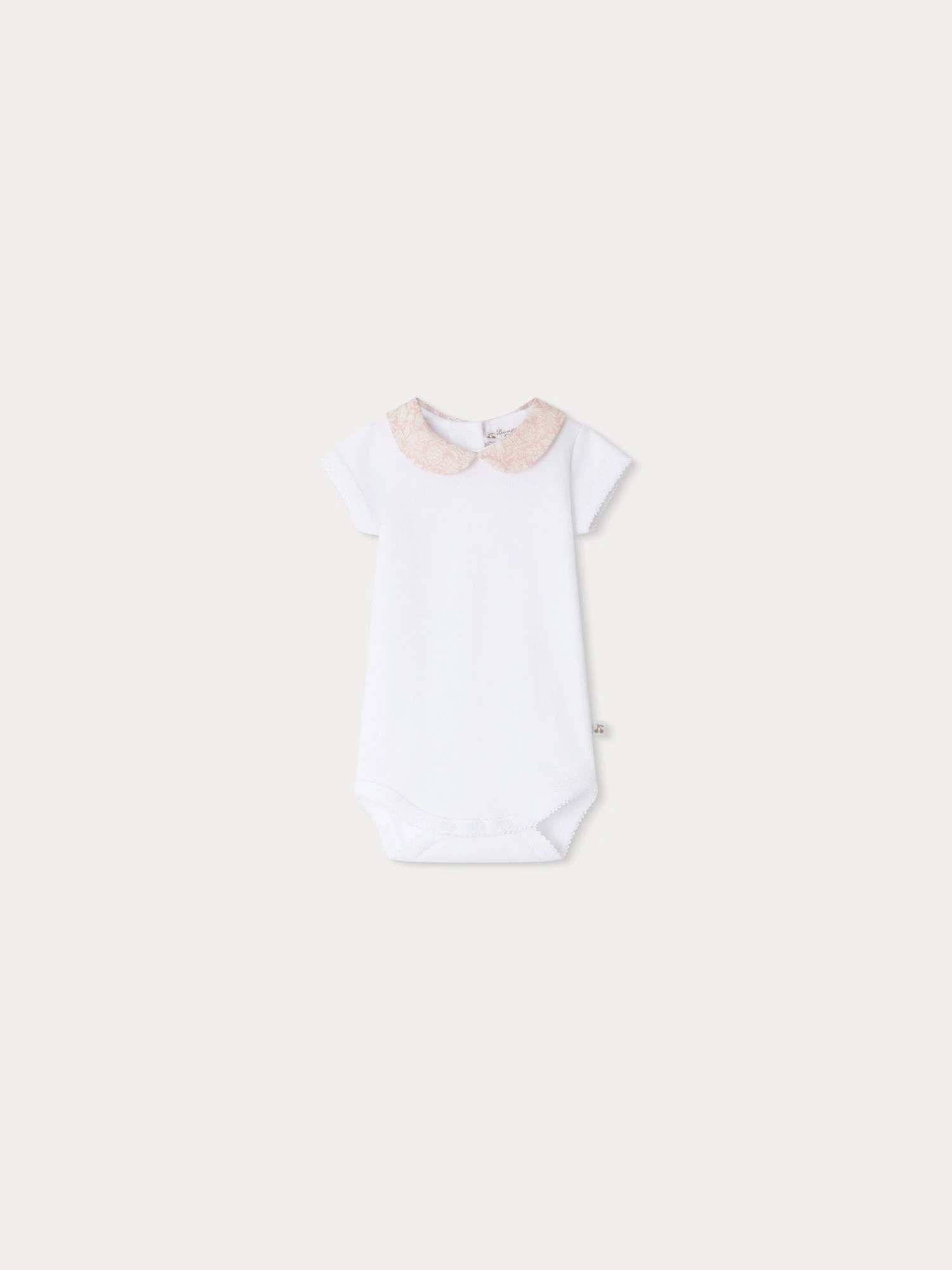 Très élégant avec son col en tissu Liberty, ce body Calix est le cadeau de naissance idéal. Confectionné en coton biologique, il se ferme à l’aide de pressions au dos.