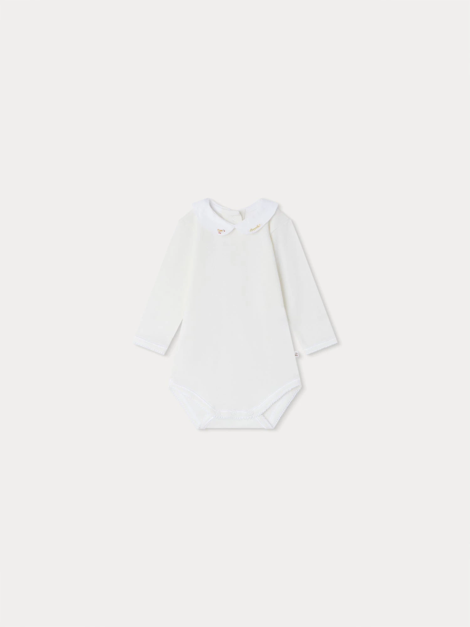 Ce body pour bébé Cygne se démarque par son ravissant col Claudine brodé à la main. Confectionné en coton biologique, il se dote d’une fermeture pressionnée discrète au dos, gage d’un enfilage aisé.