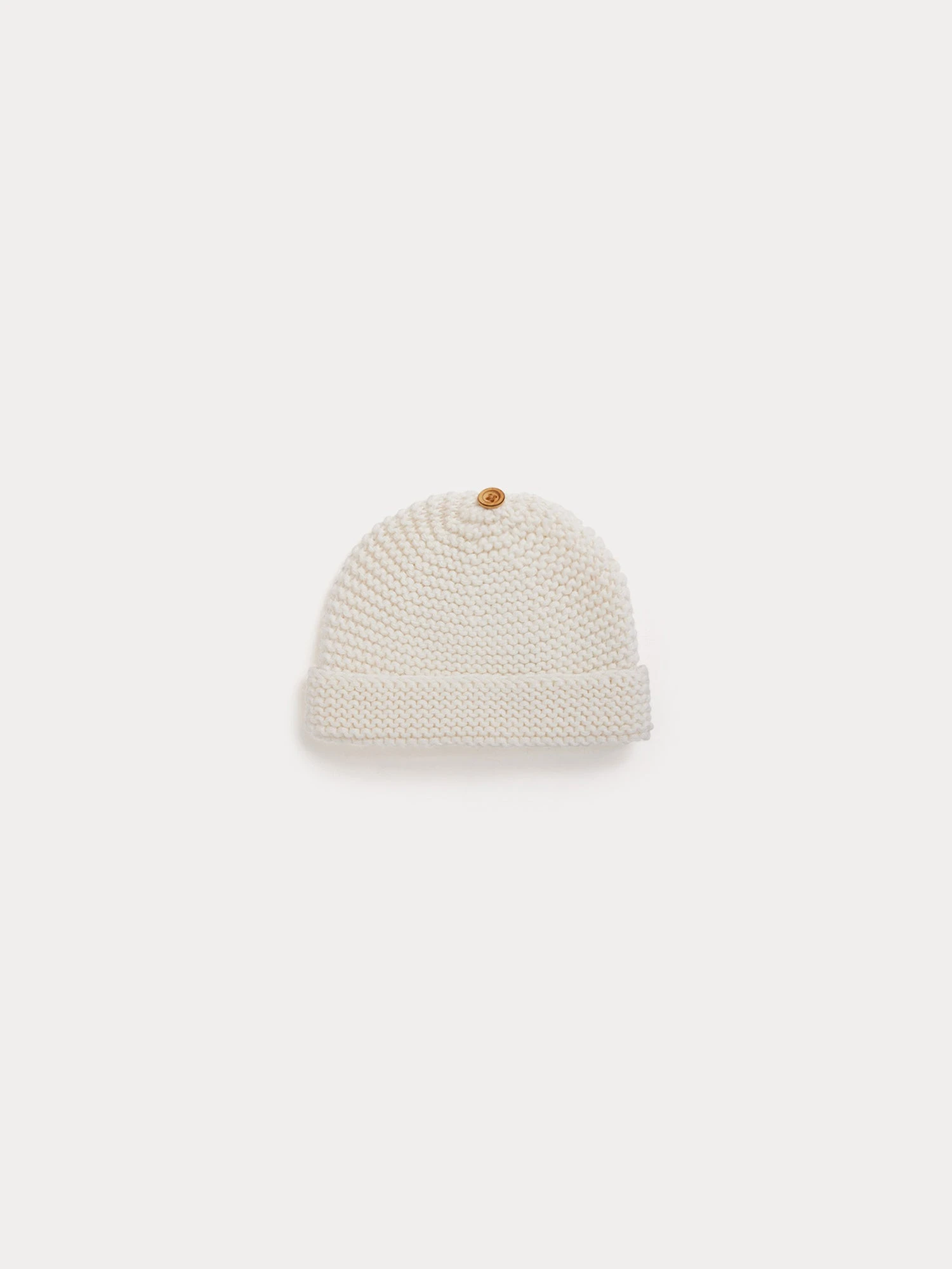 Couvrant la tête et les oreilles, ce bonnet Barbo en laine et coton aidera Bébé à conserver sa température. Il est fini de petits revers et d’un bouton top en bois.