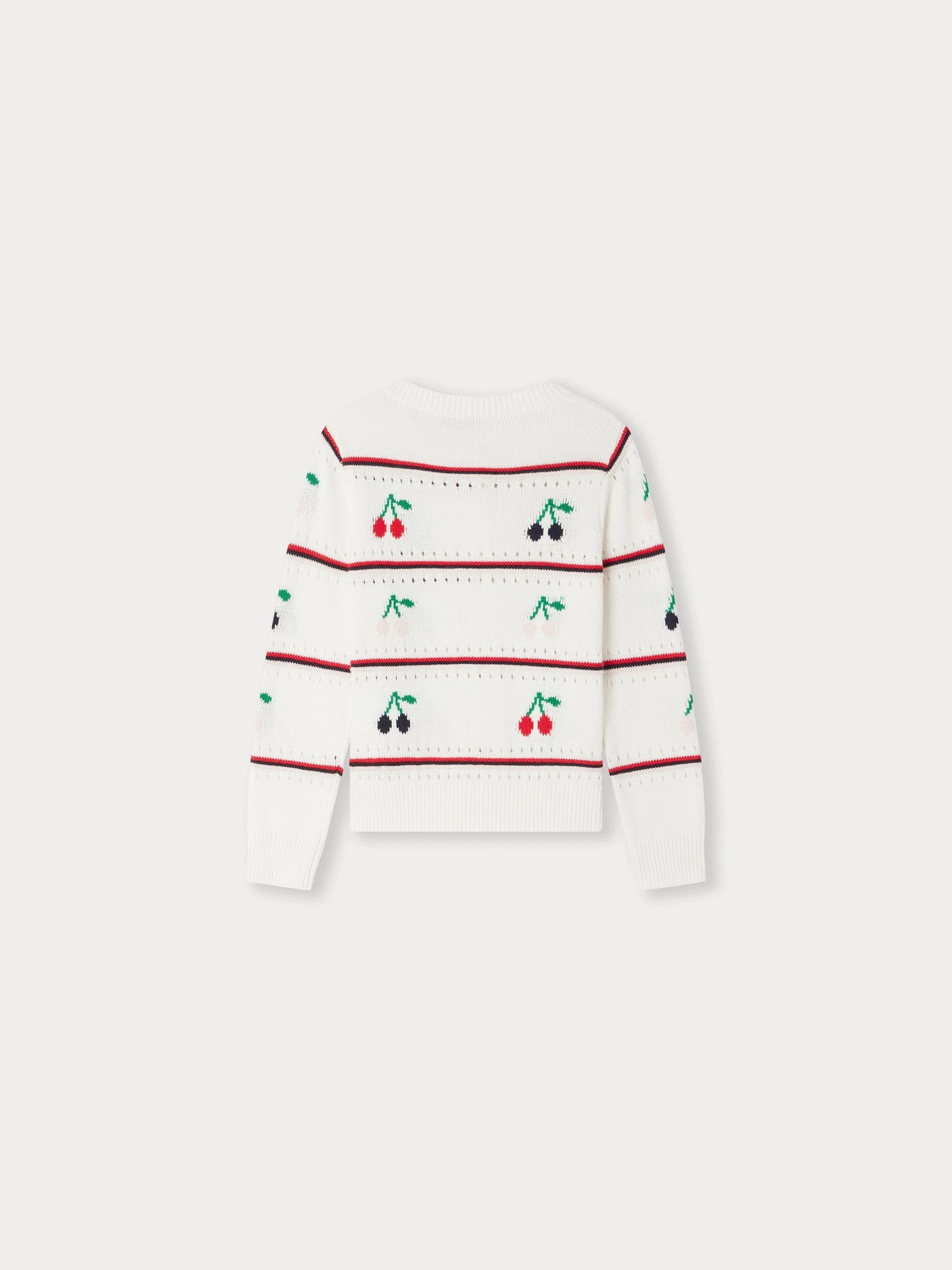 Le cardigan boutonné Armel pour fille ajoute une touche fraîche et colorée à la tenue, grâce à son motif cerise et ses fines rayures. Il est confectionné dans une fine maille de coton biologique.