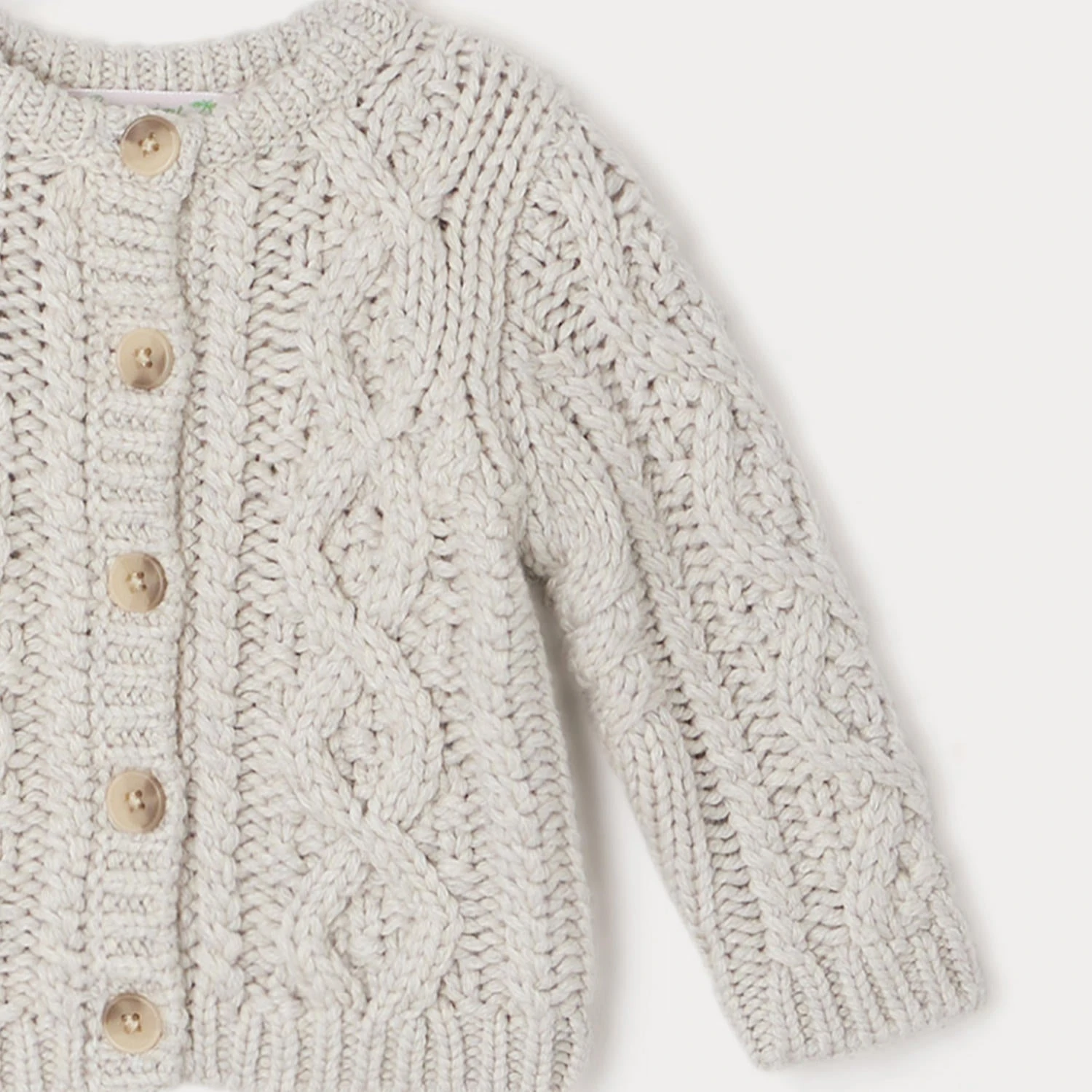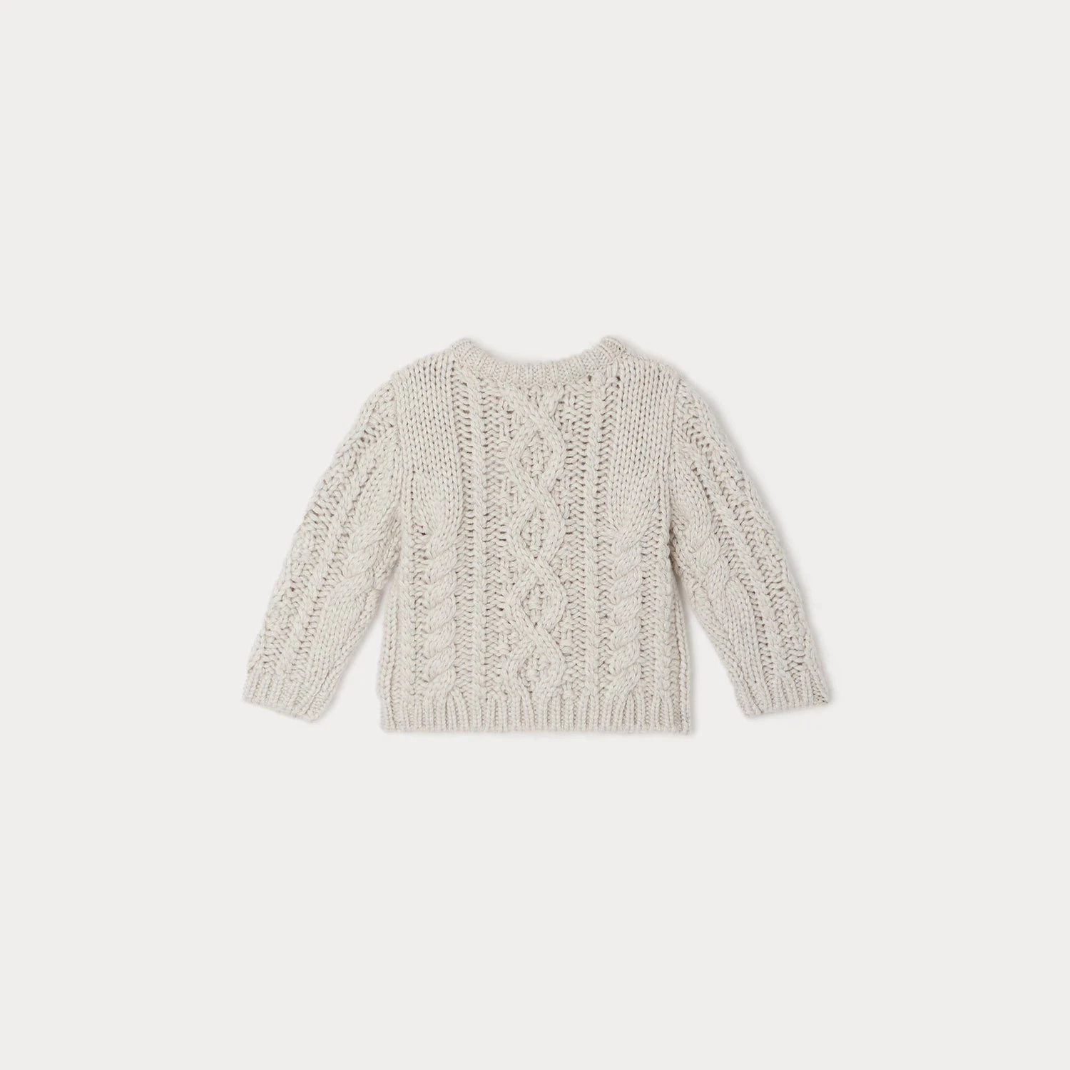 Le cardigan Bartolina pour bébé illustre le savoir-faire artisanal de la Maison avec sa maille à grosse jauge agrémentée de torsades. Des boutons contrastants forment l’ouverture devant.