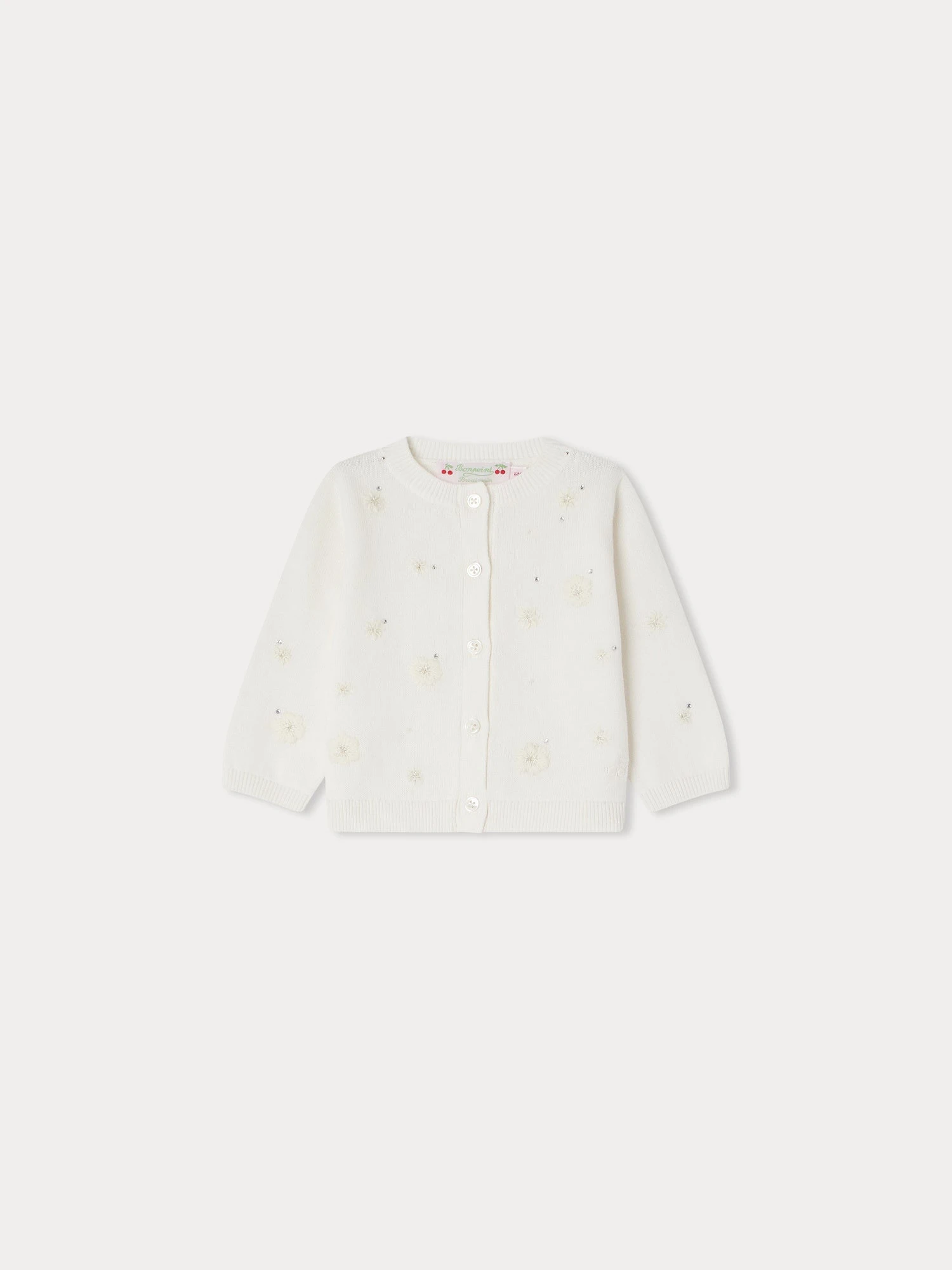 Les fleurs délicatement brodées à la main sur le devant du cardigan Claudie pour bébé en font un modèle sophistiqué, idéal pour une grande occasion. Il est également doté d’un col ras-de-cou.