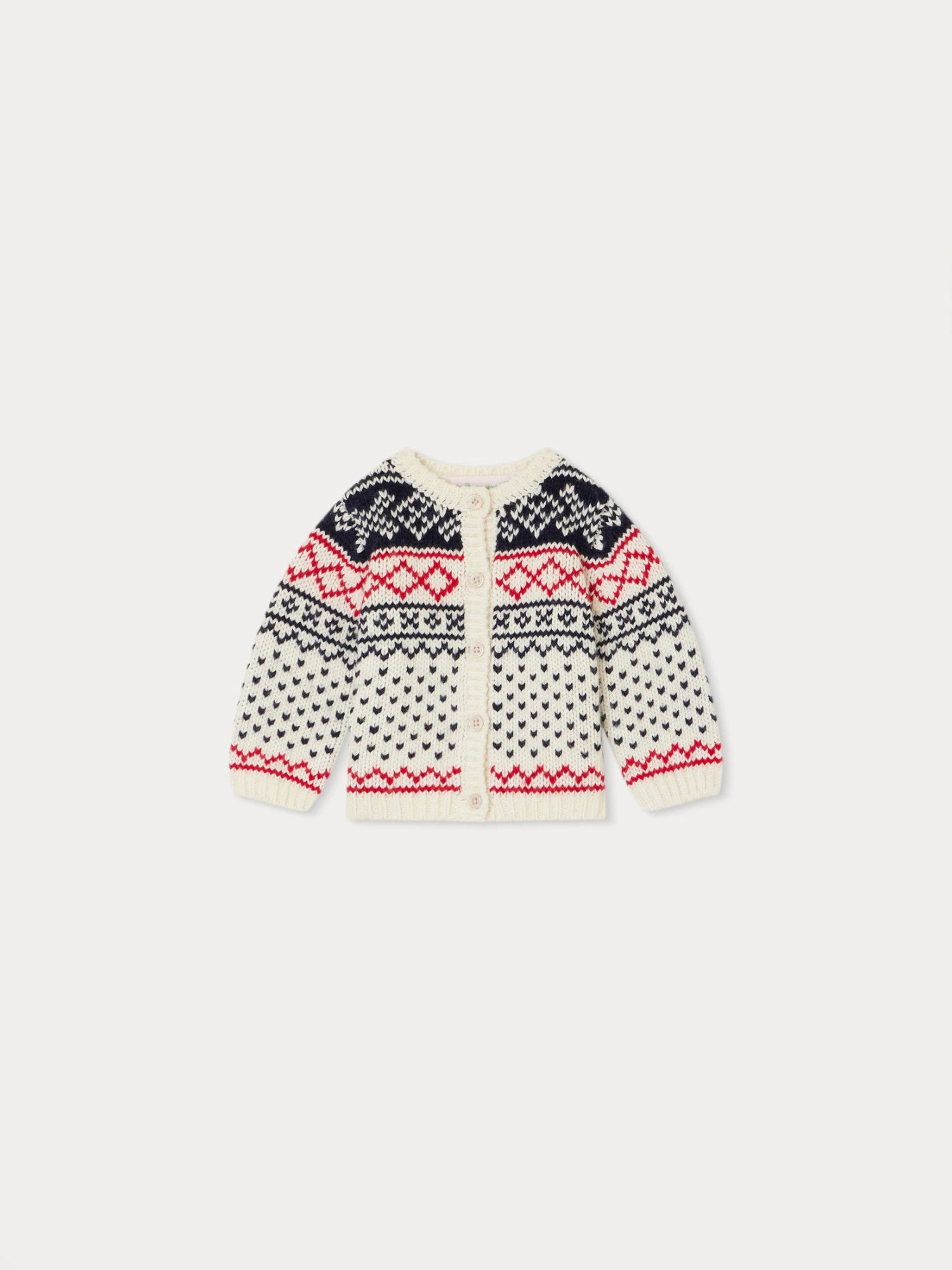 Le cardigan Dayana pour bébé joue avec les codes du pull de Noël avec ses ravissants motifs intarsia tissés en deux couleurs. Il se finit de larges bords-côtes confortables.