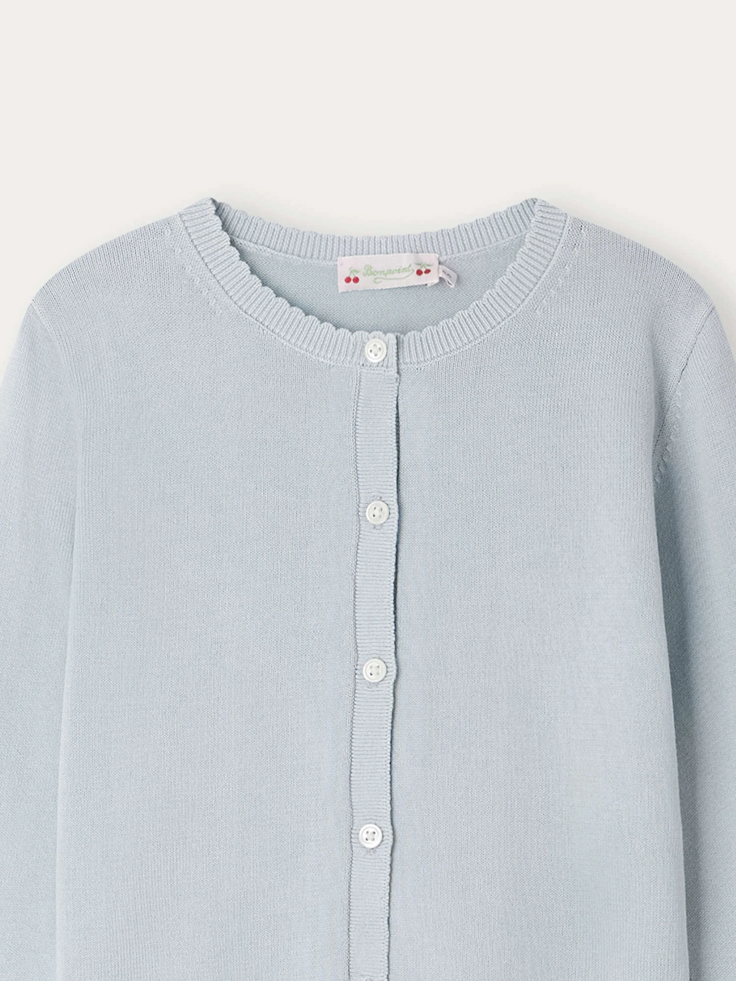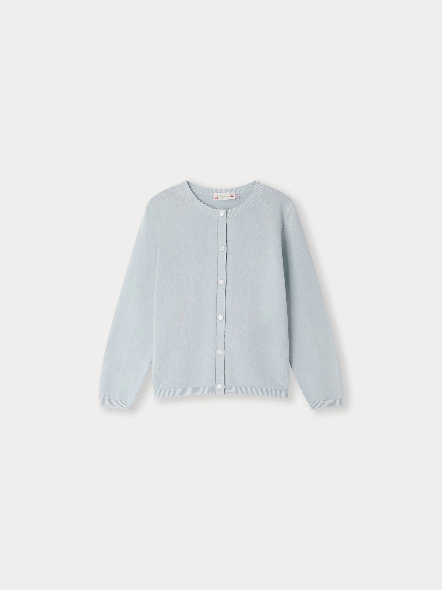 Le cardigan Fela pour fille est tricoté dans une maille de coton douce et ultra-fine. Les bords-côtes au col, sur les poignets, et à la base sont subtilement festonnés.