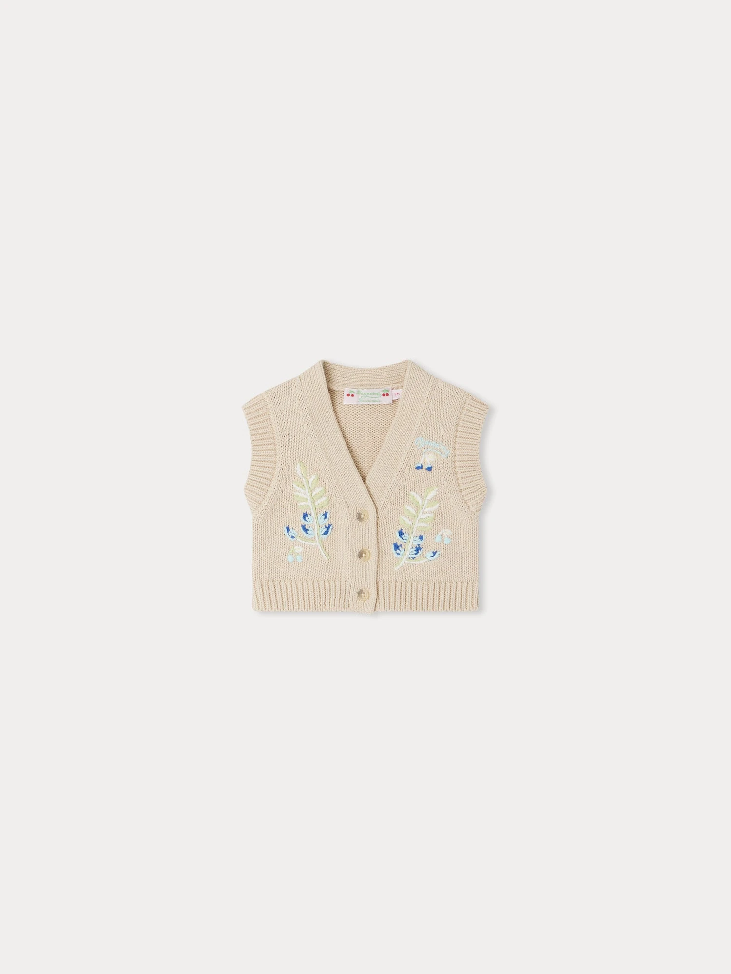 Confectionné en coton biologique, ce cardigan sans manches Ficiana est idéal pour ajouter une note rétro à la tenue. Il remporte tous les suffrages avec son motif et son logo cerise Bonpoint brodés à la main.