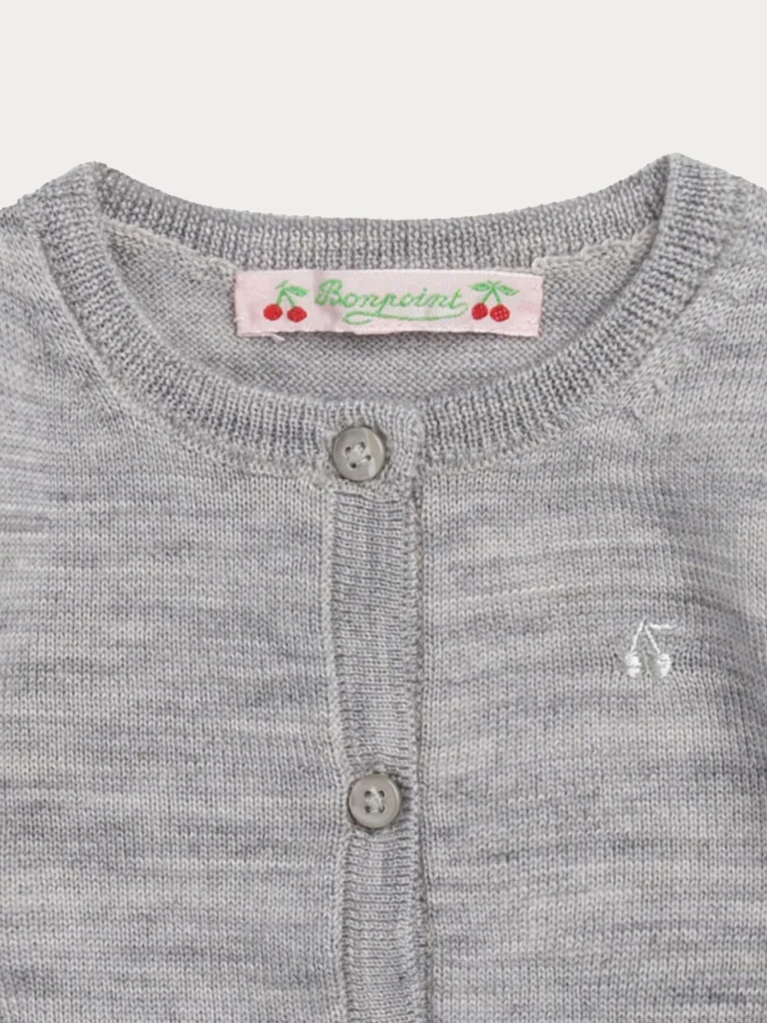 Tout le raffinement de ce cardigan en laine mérinos réside dans sa sobriété. Ce gilet gris chiné clair arbore un col rond. Il peut être porté seul au-dessus d’un body ou ouvert sur une robe ou une chemise.