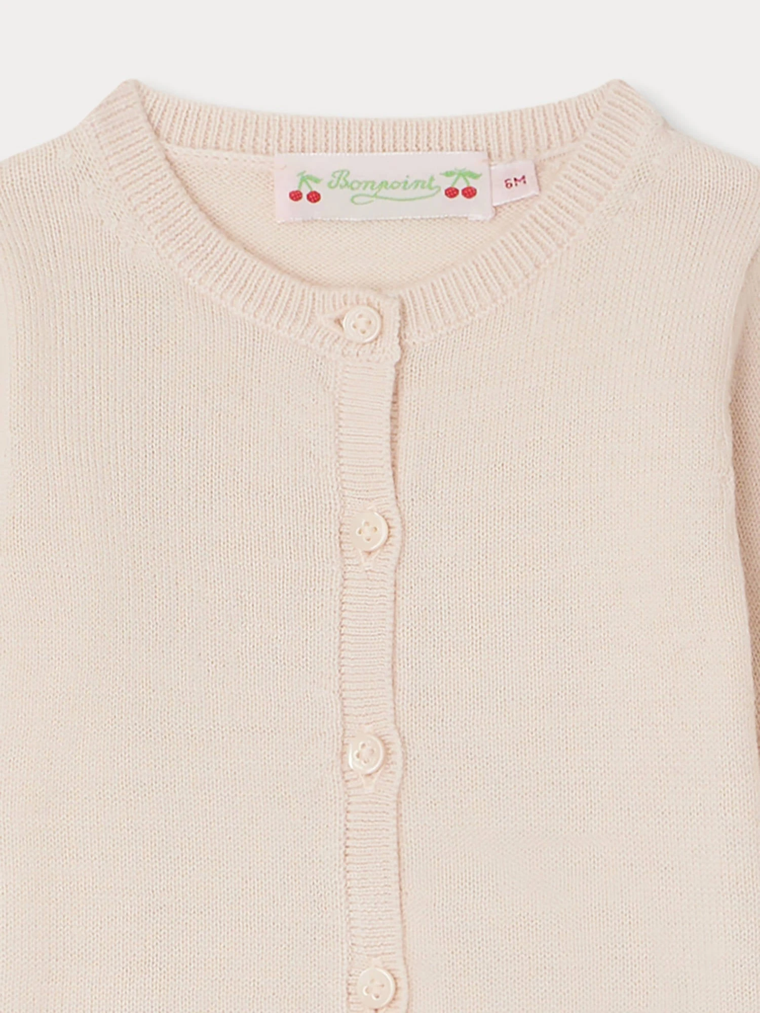 Ce cardigan pour bébé Teyana est un intemporel avec sa cerise Bonpoint brodée en ton sur ton à la base devant. Il est confectionné dans une maille douce et résistante.