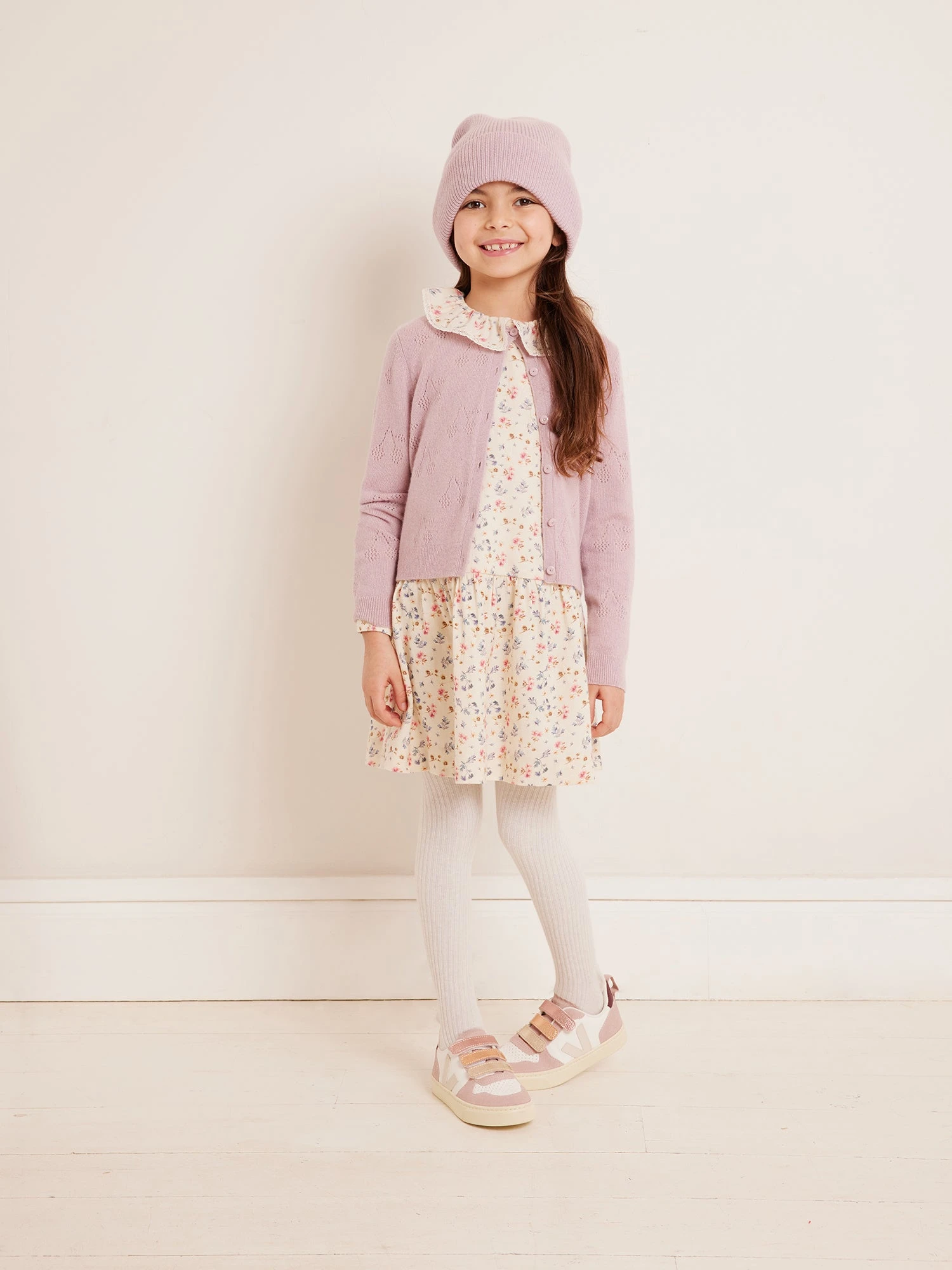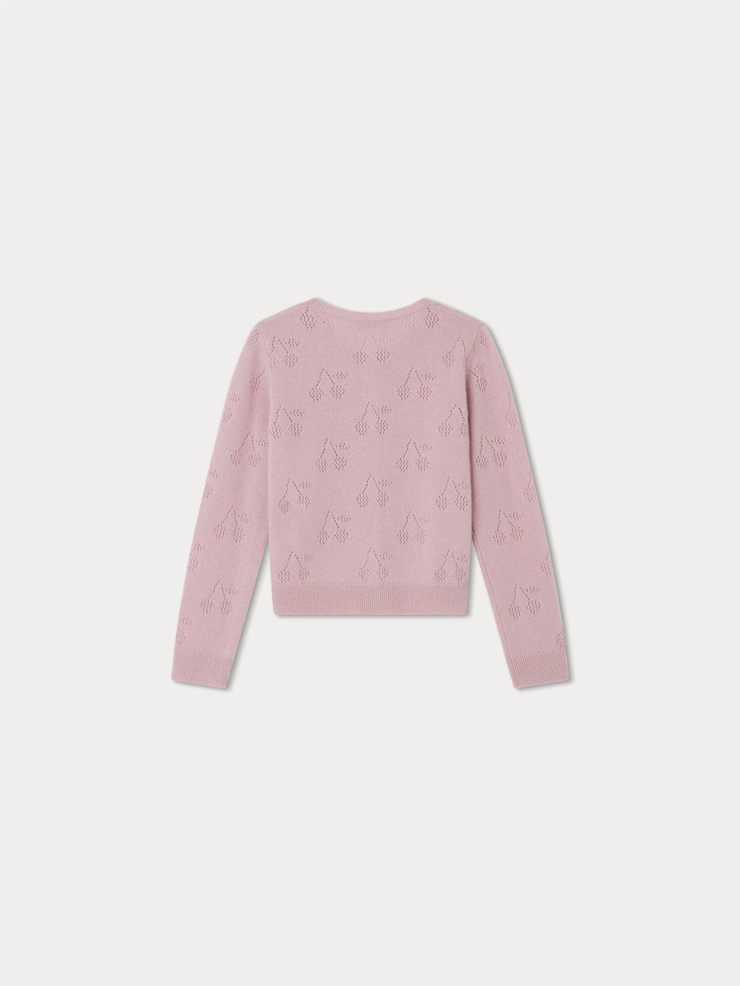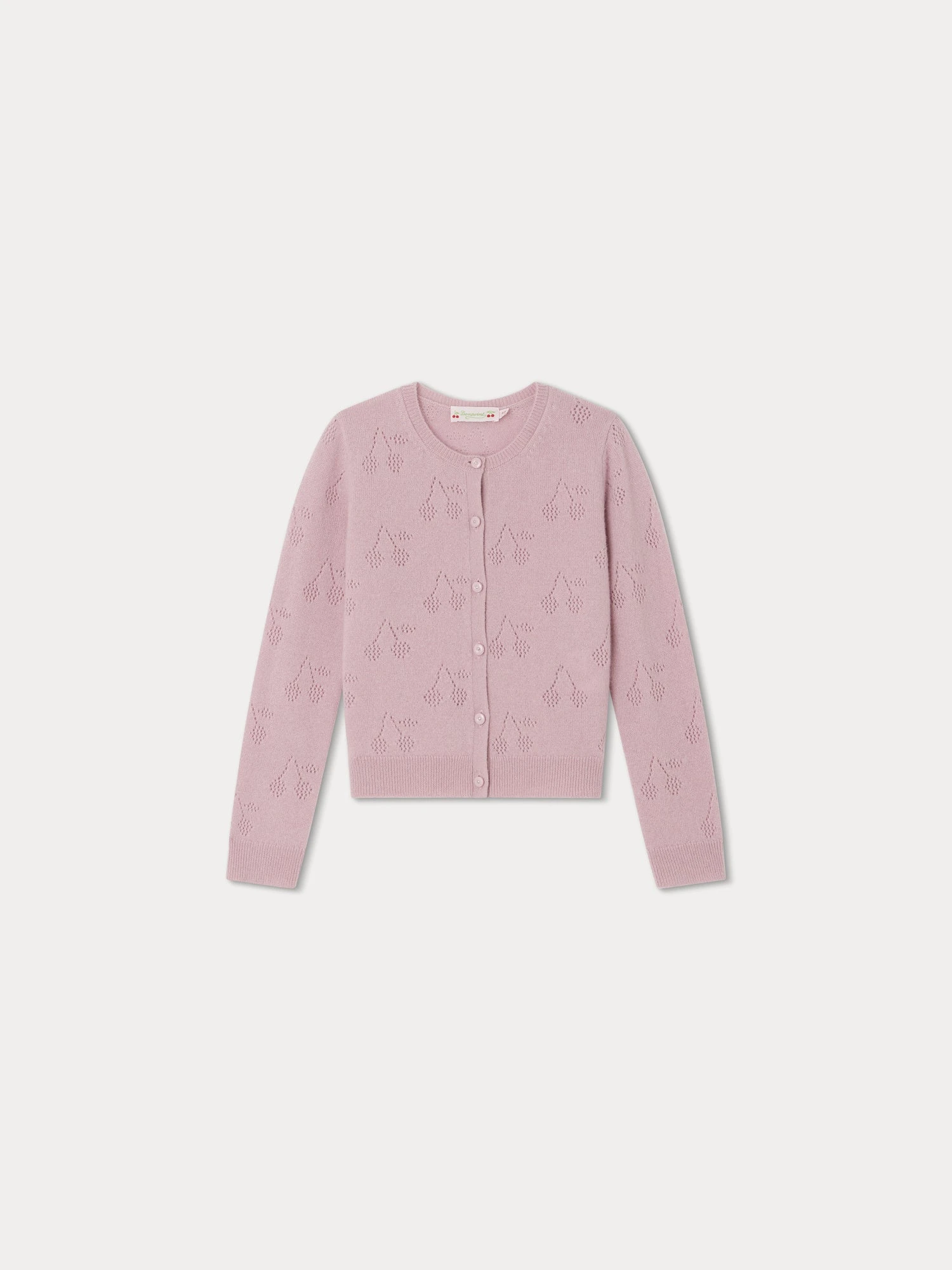 Le cardigan Thindra pour fille se démarque par sa teinte tendre et ses cerises ajourées partout sur le corps et les manches. Ce modèle doux se ferme par des boutons devant.