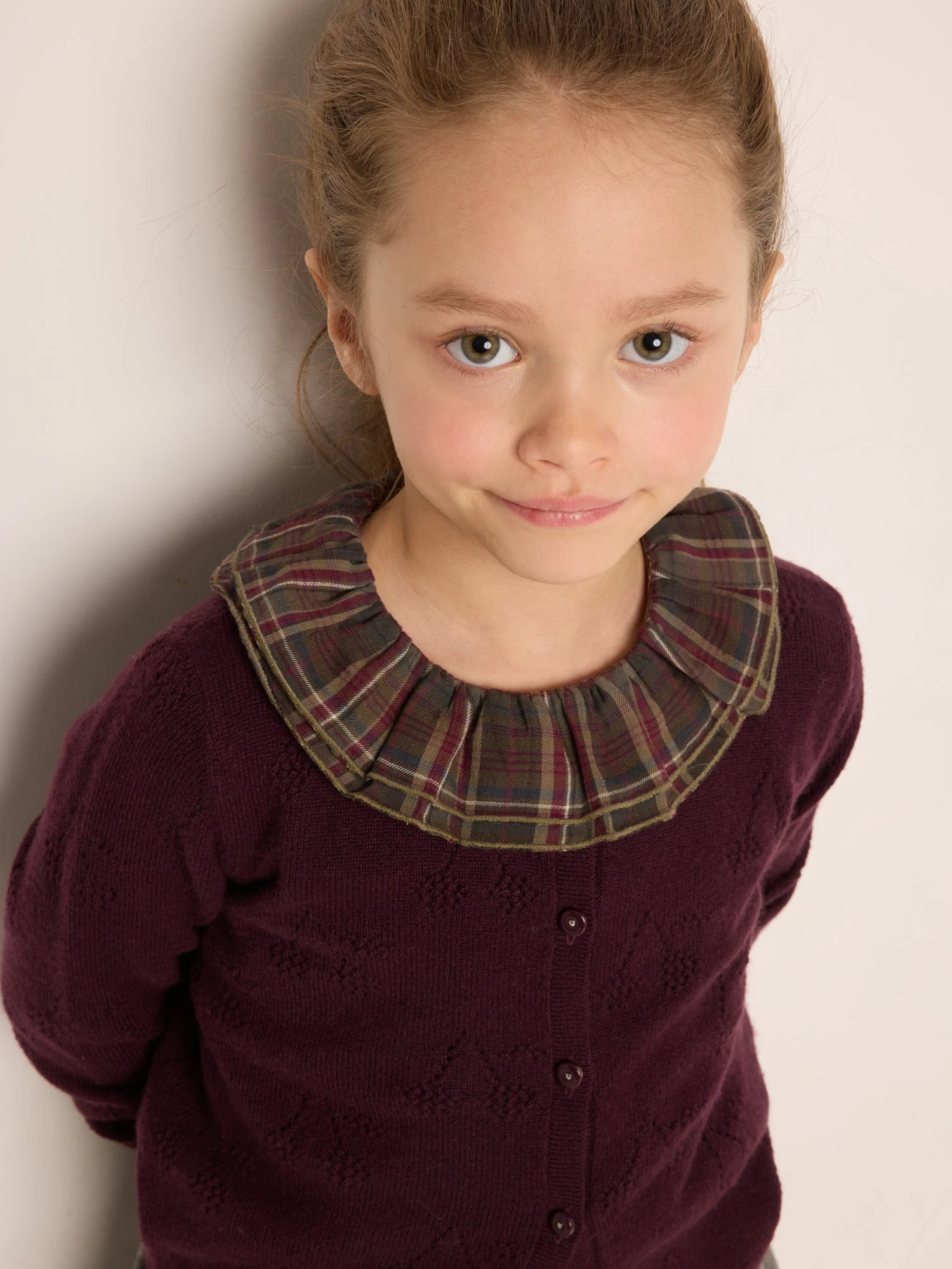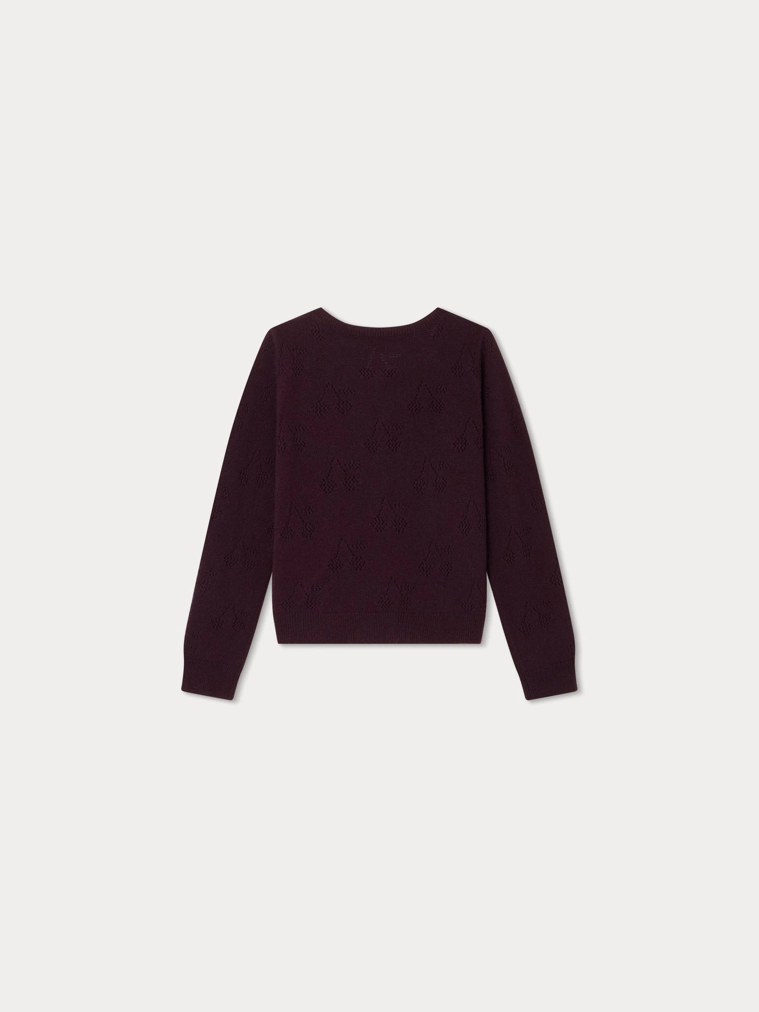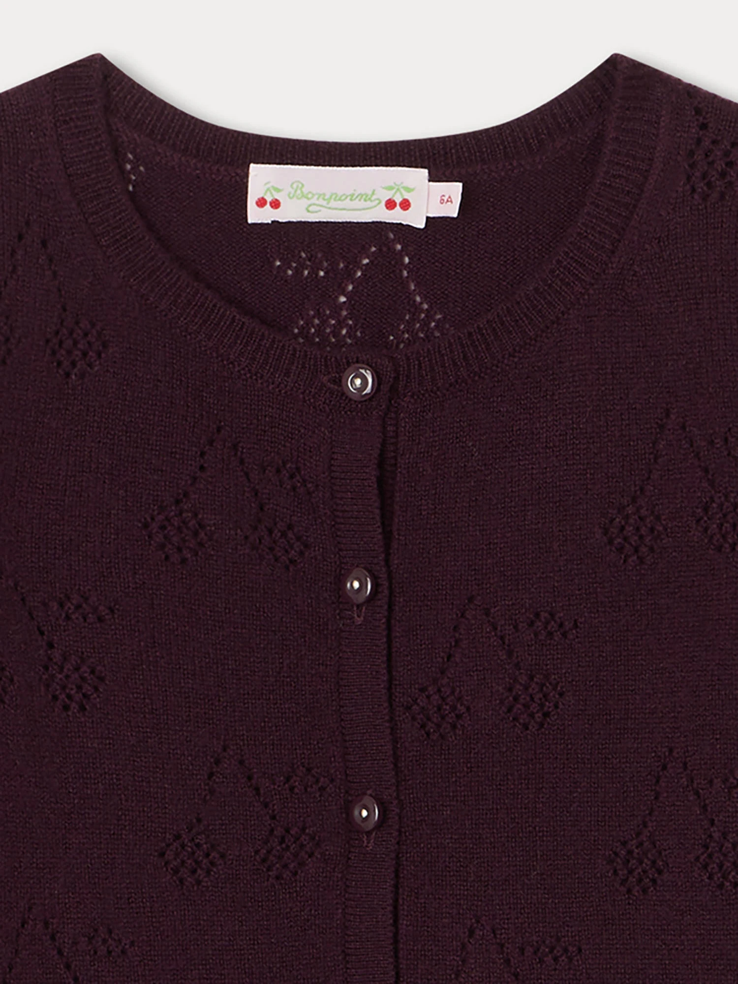 Les cerises sont à l’honneur sur le cardigan Thindra pour fille, avec des motifs ajourés sur l’ensemble. Ce modèle droit est coupé dans une maille cachemire agréable à porter.
