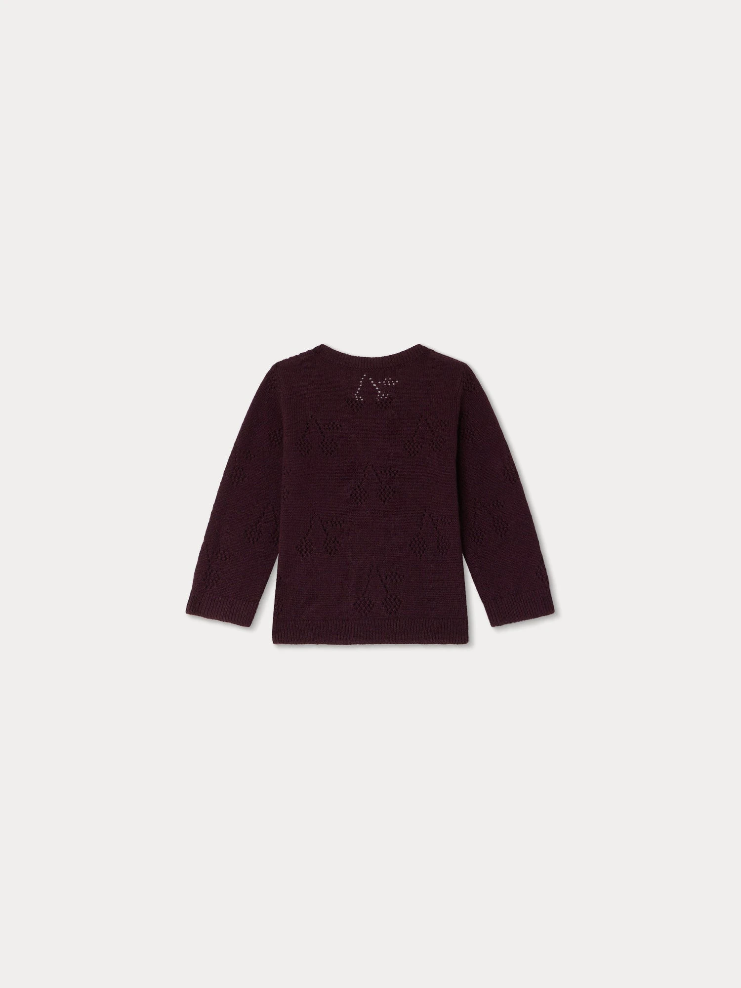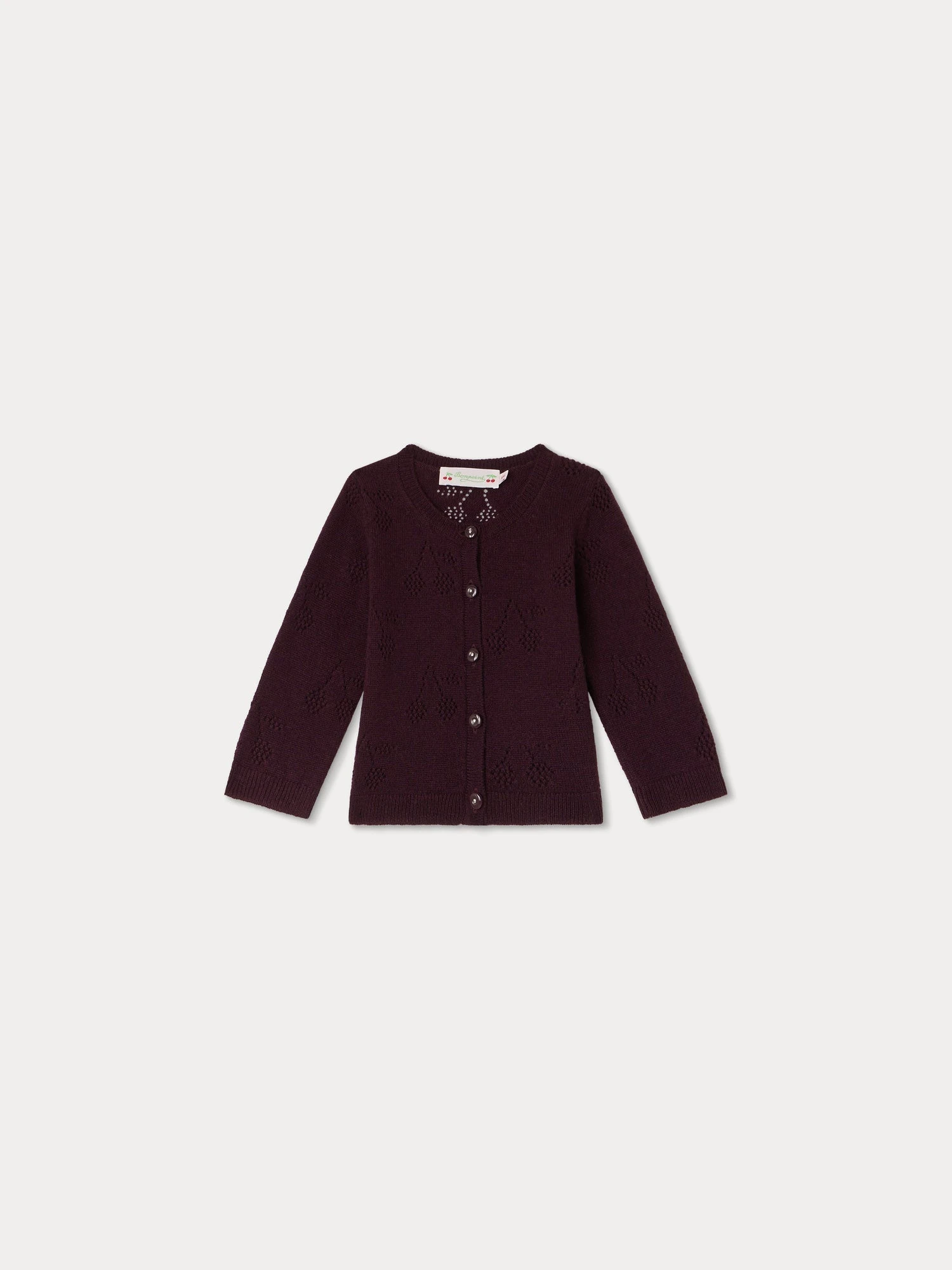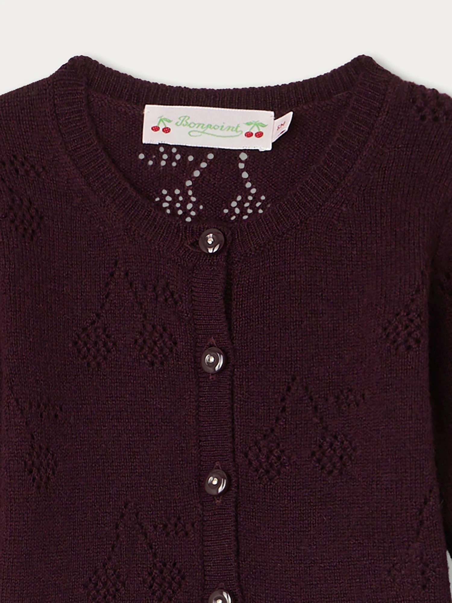 Ce cardigan à col rond pour bébé Tibile fait partie des essentiels avec son motif cerise ajouré en intégral. Il est confectionné en cachemire certifié qui garantit le bien-être animal.
