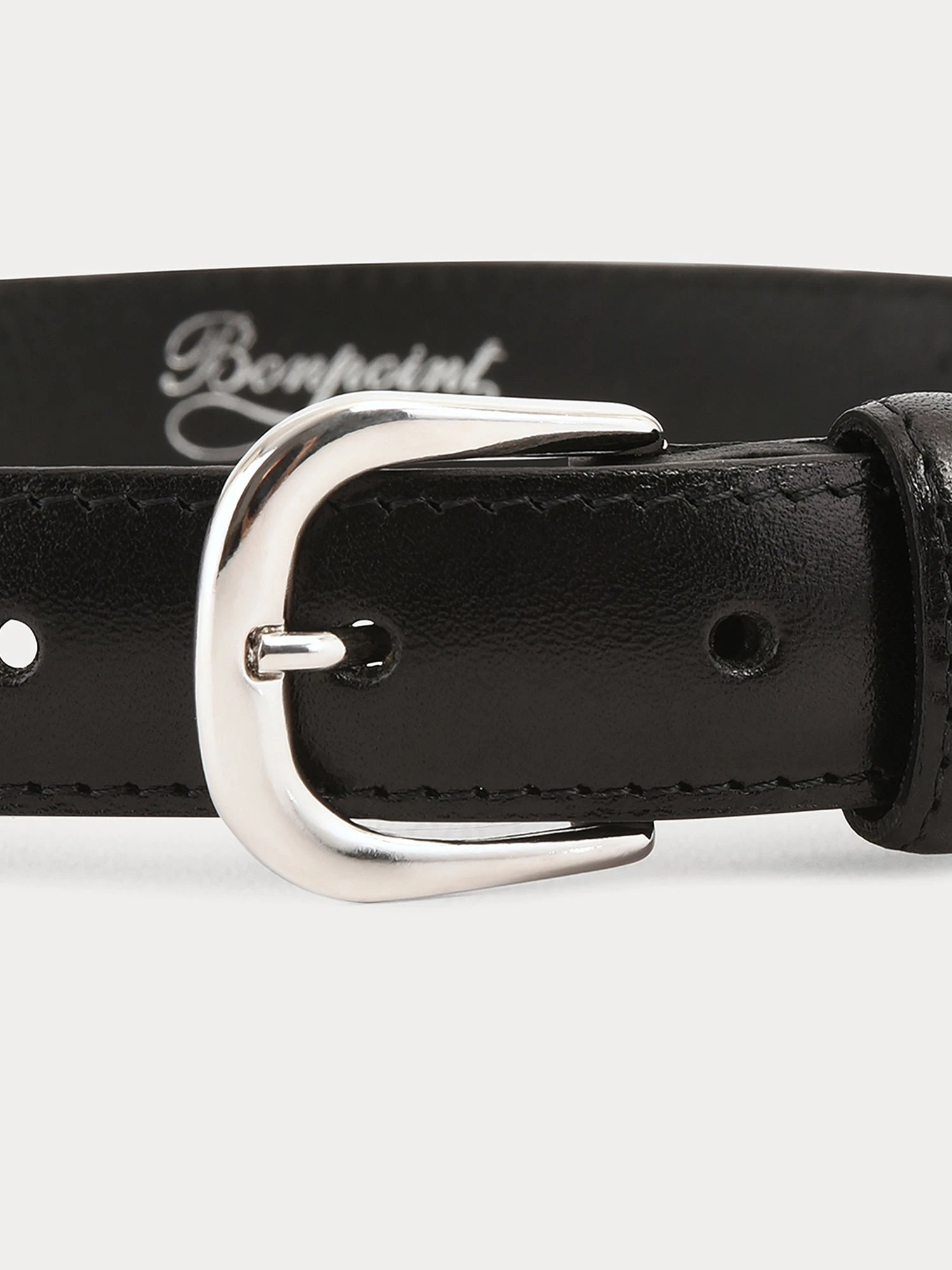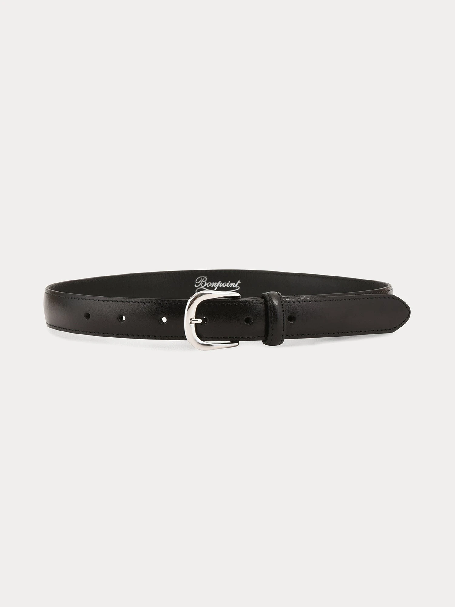 Élégante et intemporelle, cette ceinture en cuir grainé noir dispose d’une boucle à ardillon en métal argenté, aux contours arrondis, et de nombreux trous pour le réglage. Elle est imprimée Bonpoint à l’intérieur. On la marie avec un pantalon en velours.