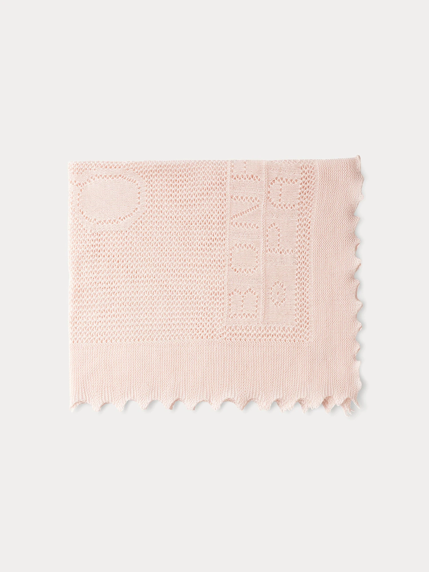 On aime la sophistication et la sobriété de cette couverture en coton et laine mélangés. Sa découpe en vague et ses motifs ajourés le rehaussent d’une note d’originalité.