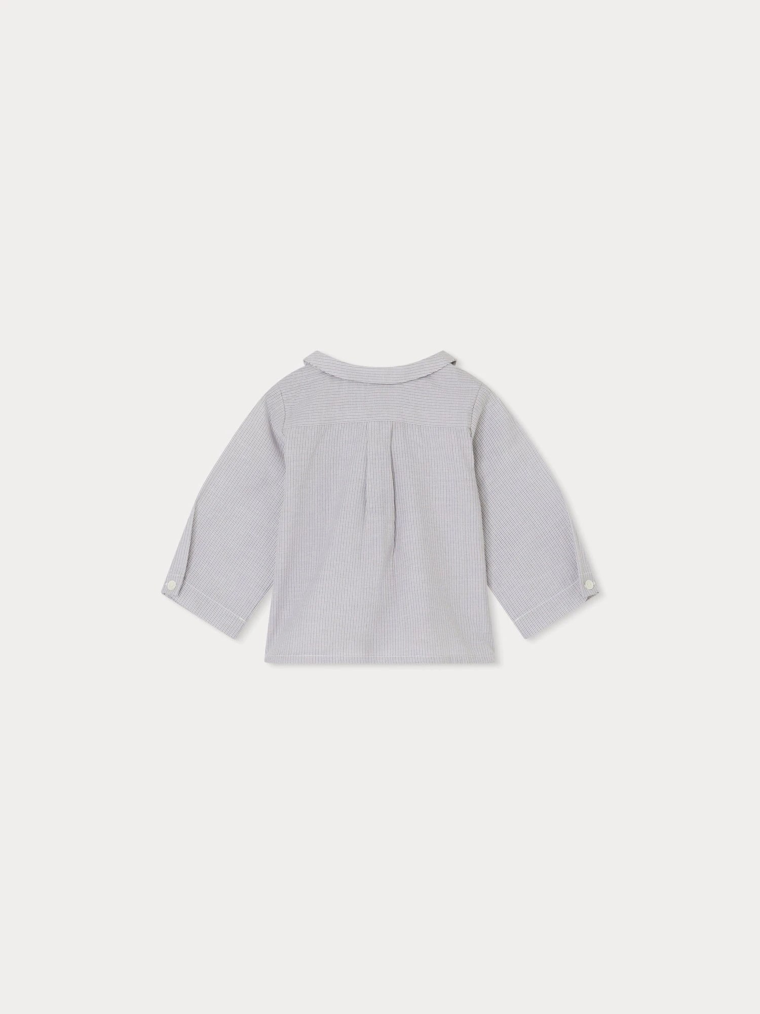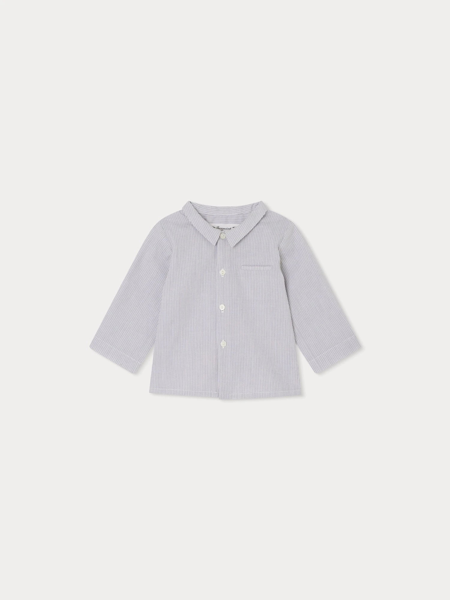 La chemise Boubou pour bébé s’habille de fines rayures verticales. Ce modèle légèrement évasé est coupé dans un coton issu de l’agriculture biologique.