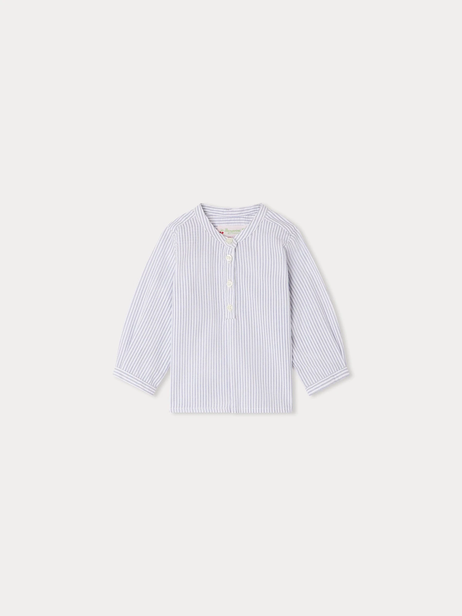 La chemise Polisson pour bébé se démarque par son ouverture boutonnée partielle à l’avant, placée sous le col rond. Son imprimé aux fines rayures lui confère un charme intemporel.