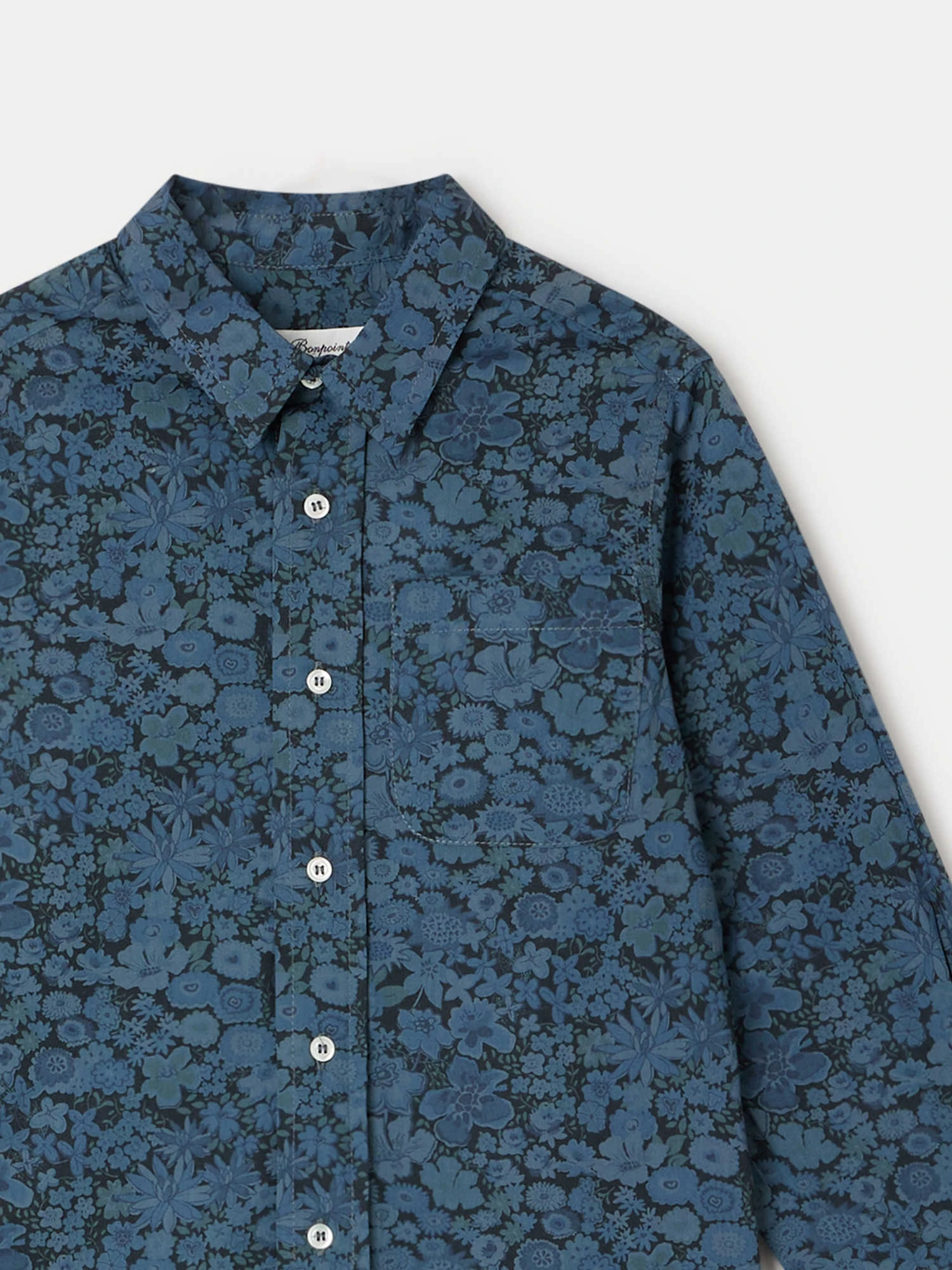 En tissu Liberty surteint issu de stocks Bonpoint, cette chemise habillée Tango pour garçon a été surcyclée. De coupe droite et fermée de petits boutons contrastants, elle dispose d’une poche poitrine et de poignets droits boutonnés.
