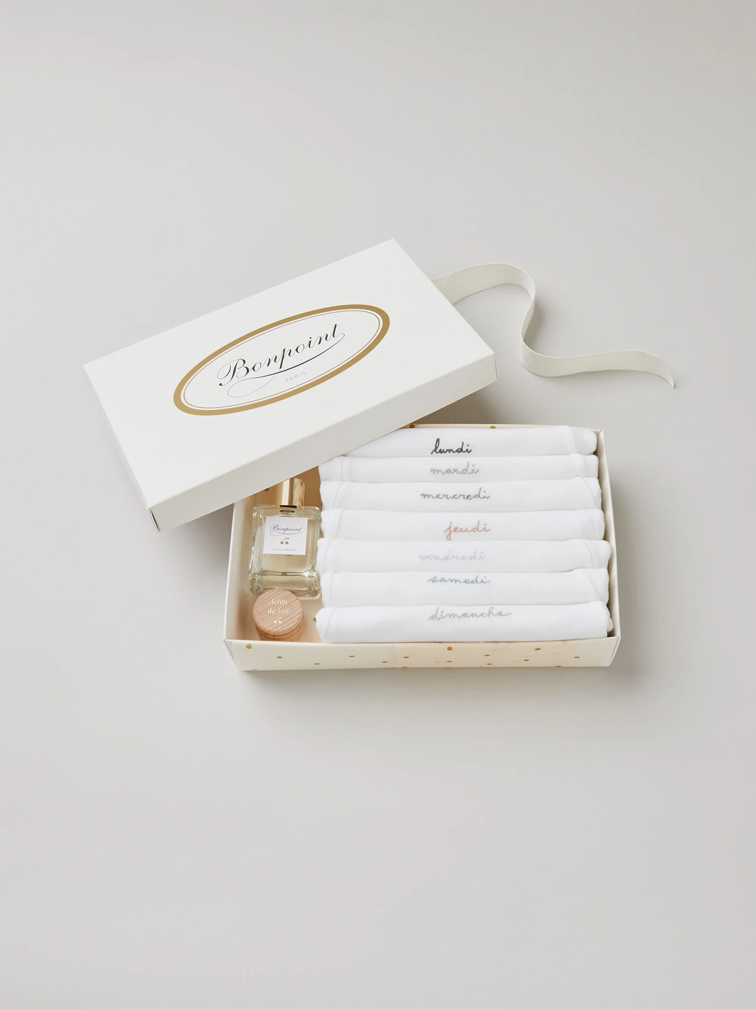 Avec le semainier iconique de 7 bodies à manches longues en taille 6 mois et l’eau de senteur fraîche et subtile à la note de fleur d’oranger pour les plus petits, Bonpoint souhaite célébrer l’arrivée d’un enfant.