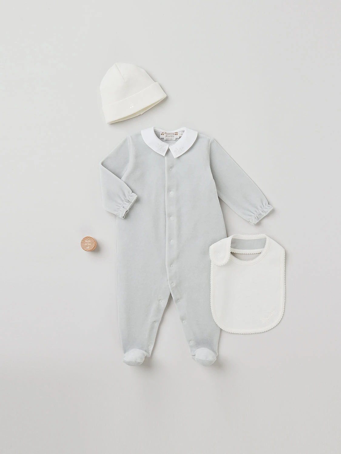 Ce coffret Prestige Prince contient tous les essentiels pour accueillir bébé : un bonnet de naissance en fine maille, un bavoir, un pyjama et une boîte à dents de lait.