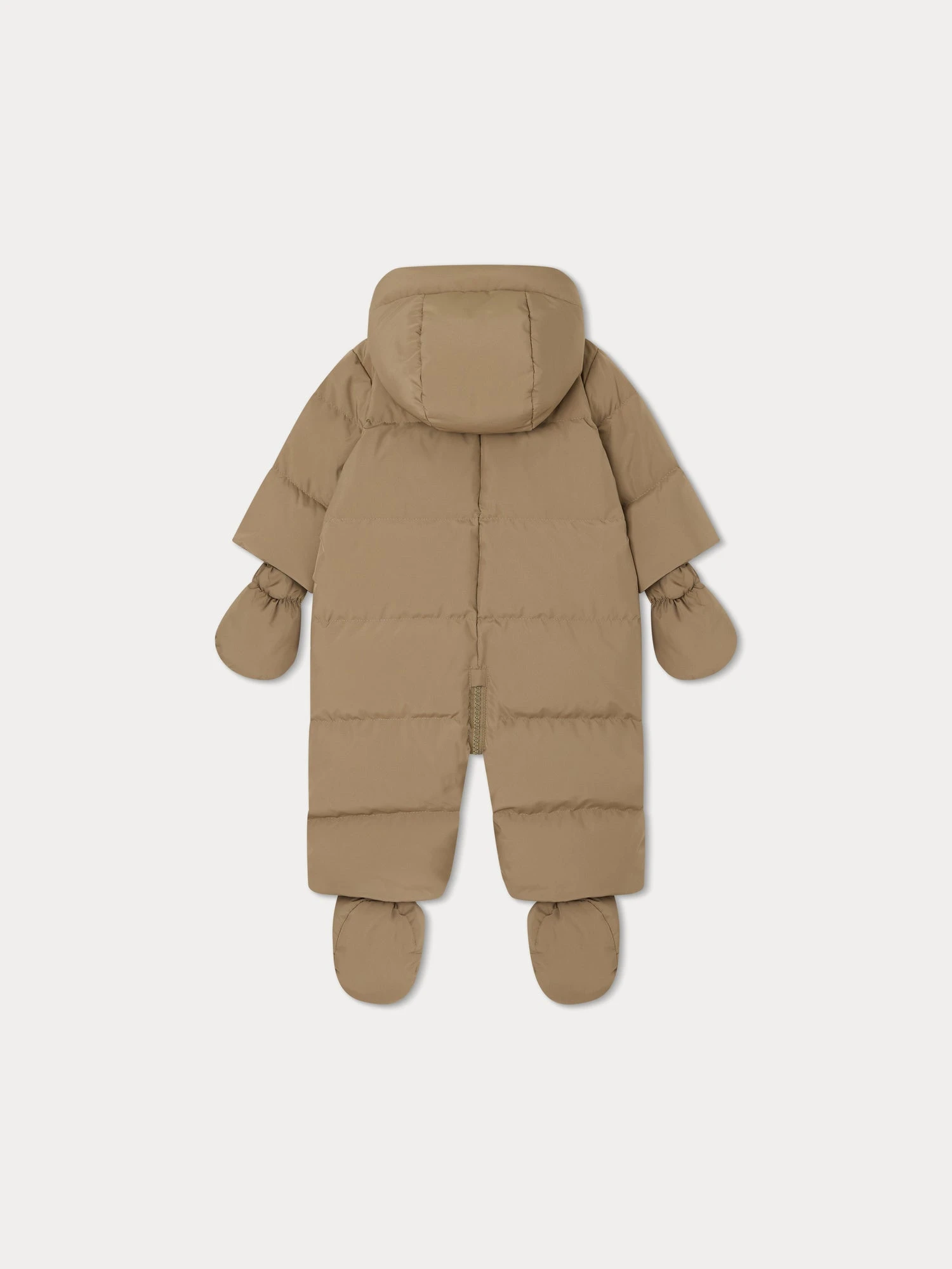 Cette combinaison pilote Tagonfly protège Bébé du froid avec son garnissage en plumes, sa large capuche et ses moufles et chaussons amovibles. Elle est confectionnée à partir de fibres recyclées.