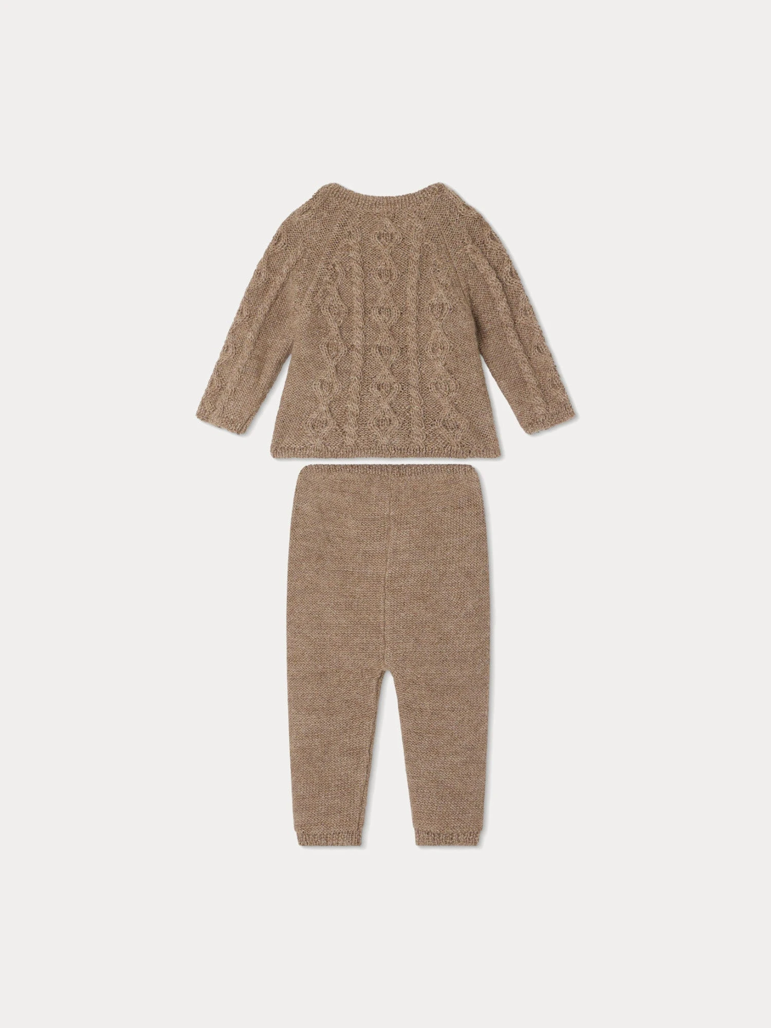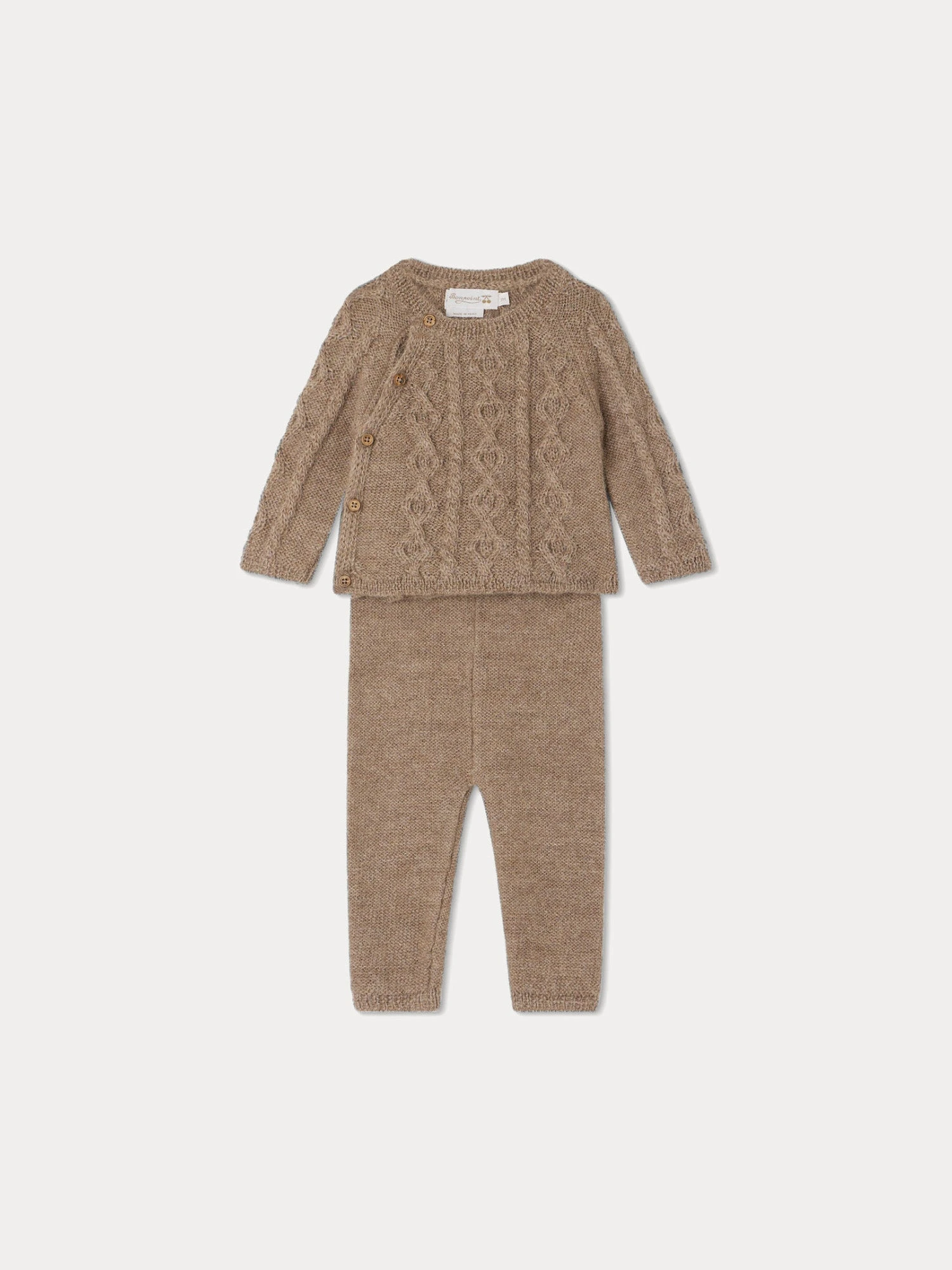 L’ensemble Bergamote pour bébé est gage de chaleur avec sa maille en laine majoritaire certifiée qui garantit le bien-être animal. Le haut se distingue par un très joli jeu de torsades.