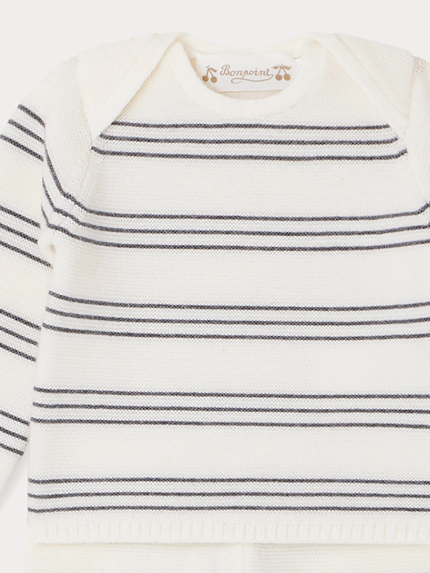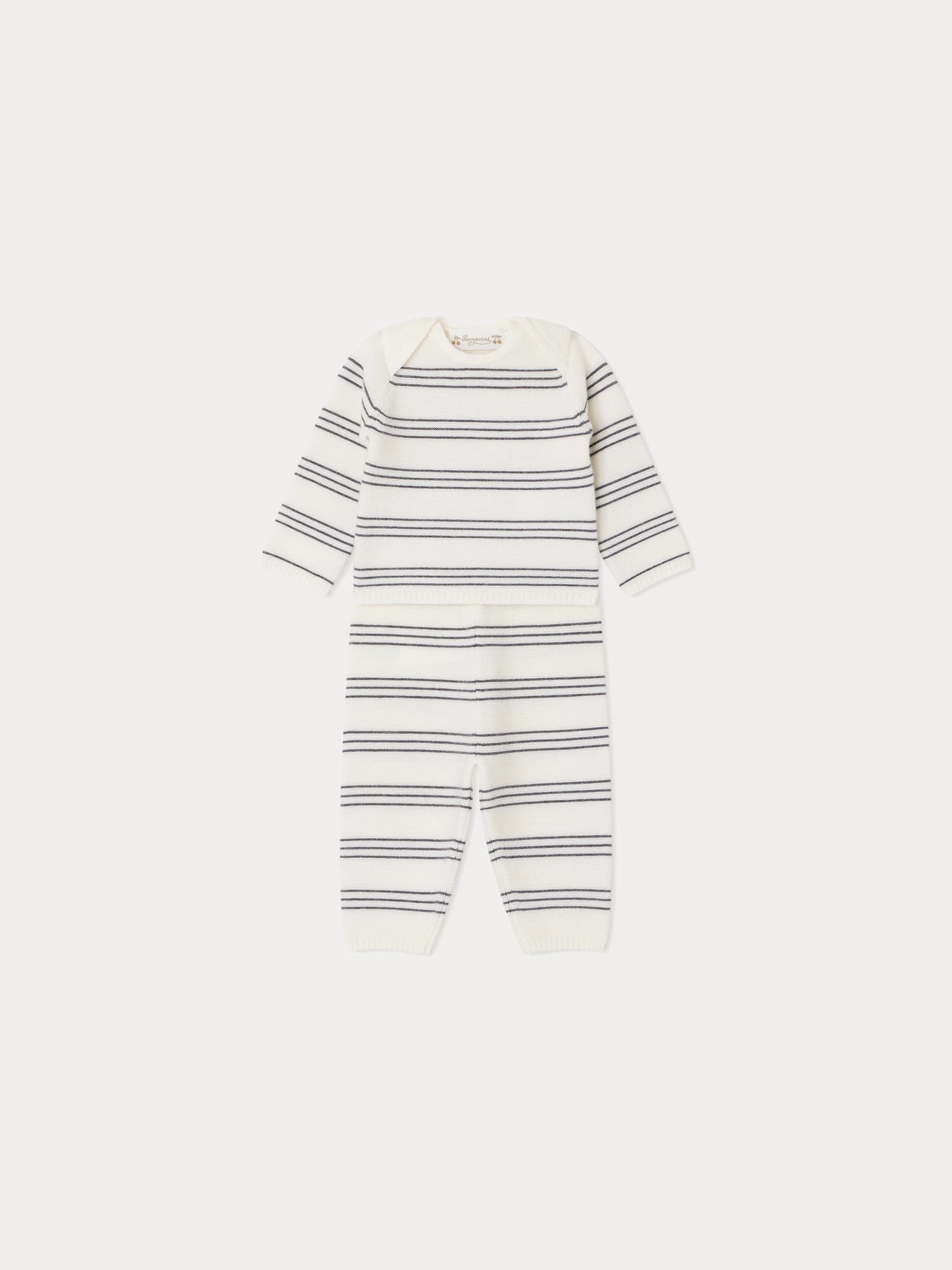 Cet ensemble pour bébé Dini séduit par ses rayures marinières intemporelles. Confectionné dans une maille douce et chaude, il est agréable à porter et garde les tout-petits au chaud.