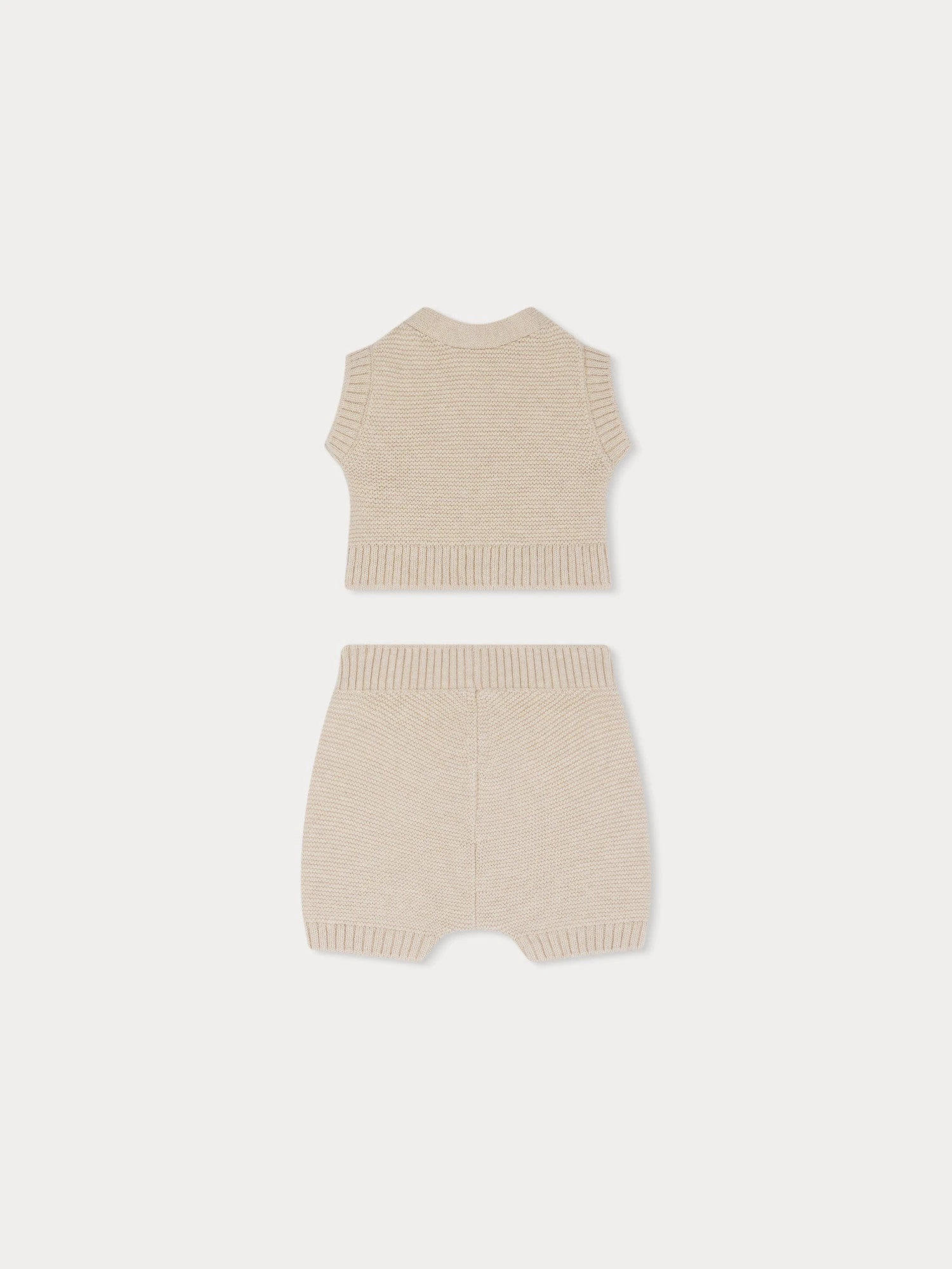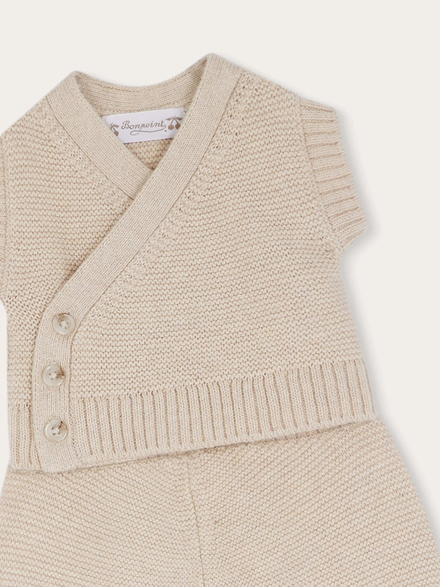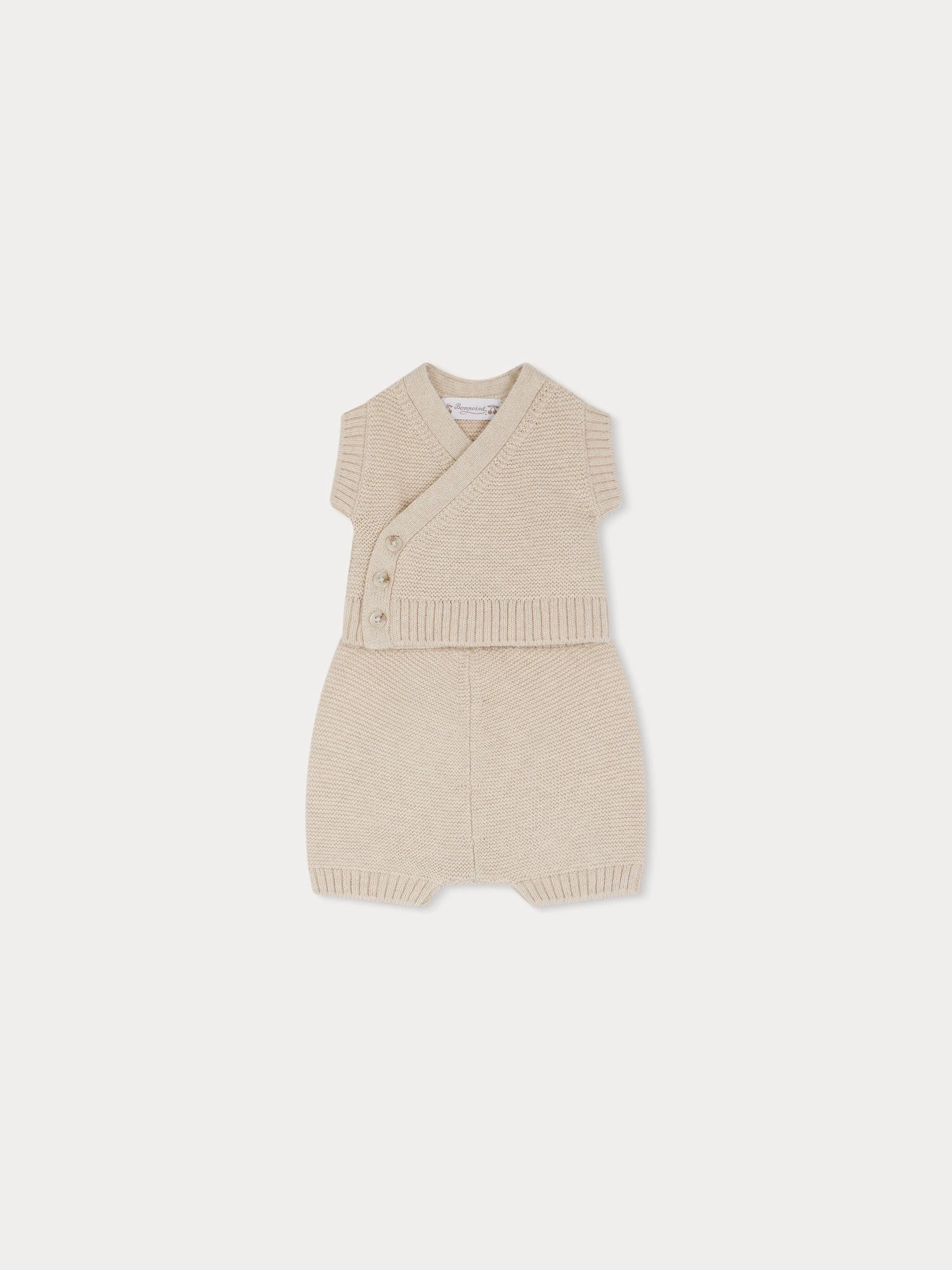L’ensemble Foe, entièrement en maille unie, est conçu pour les bébés dès la naissance. Il comprend un haut à ouverture boutonnée croisée et un bloomer assorti.