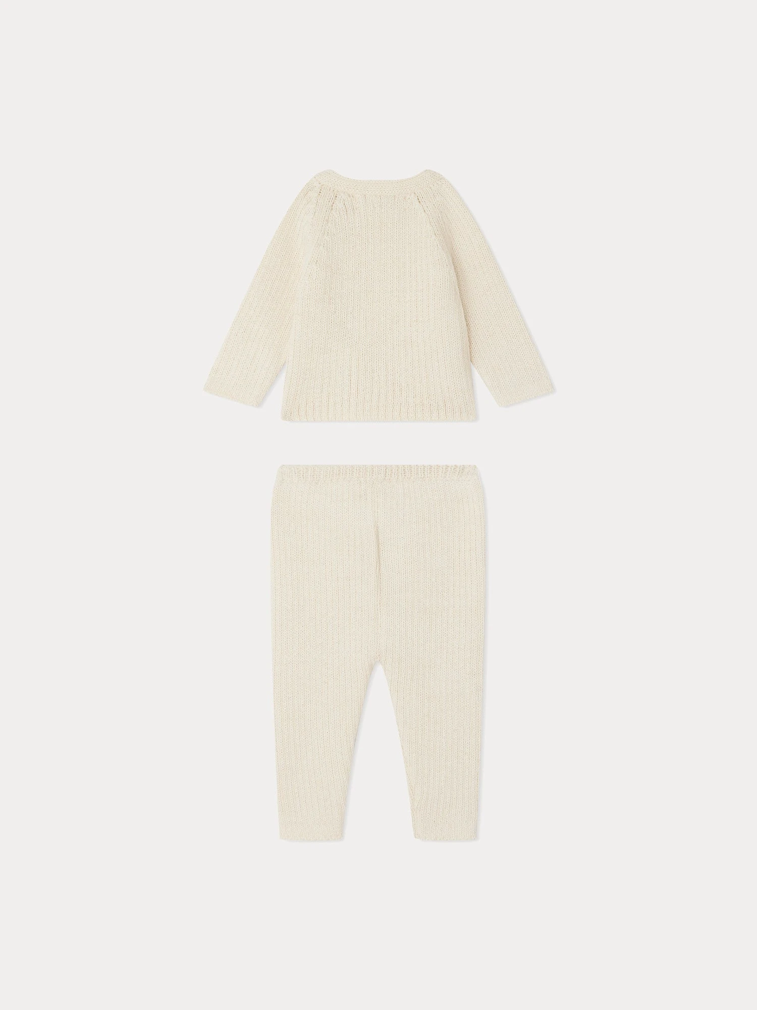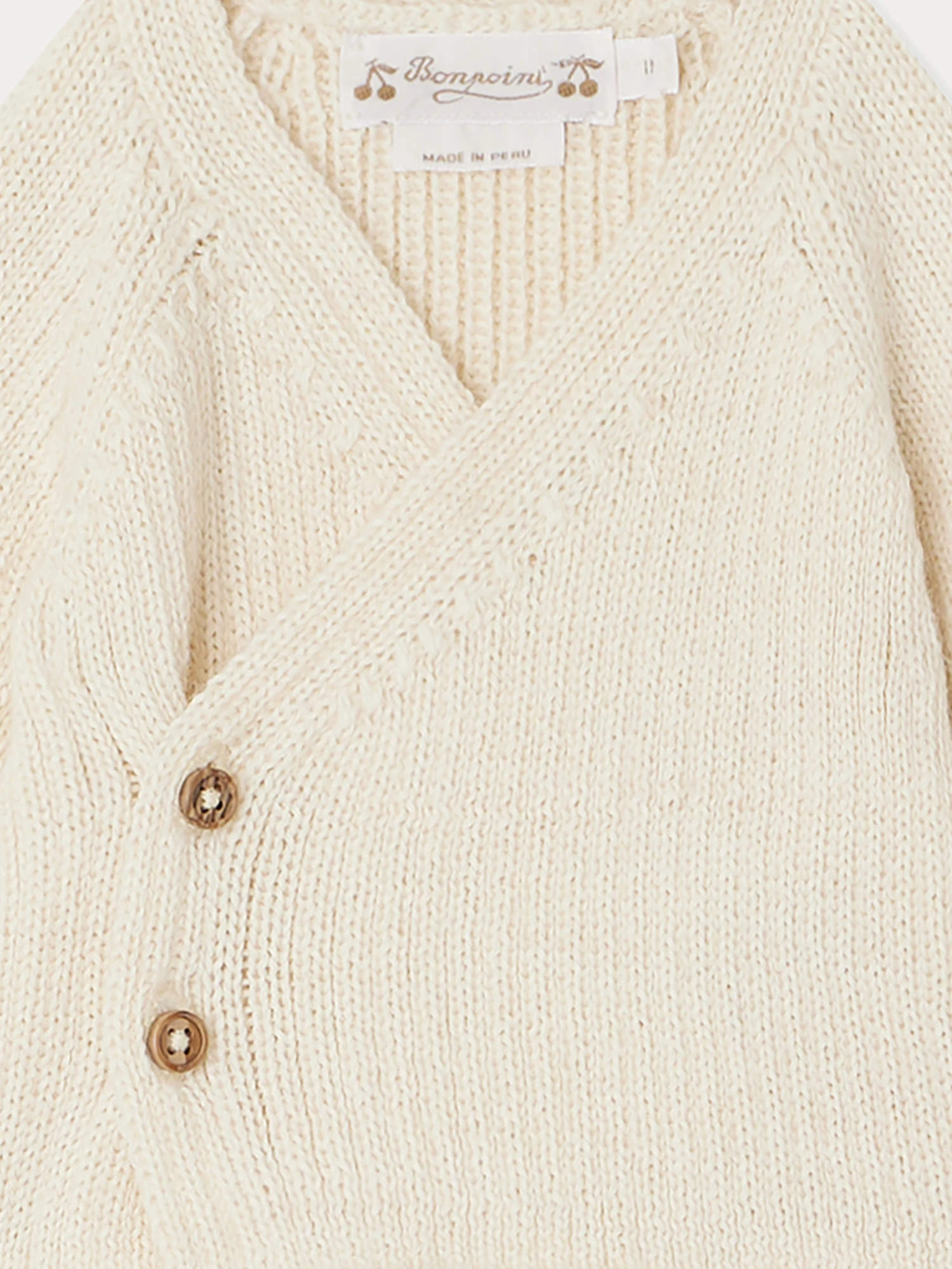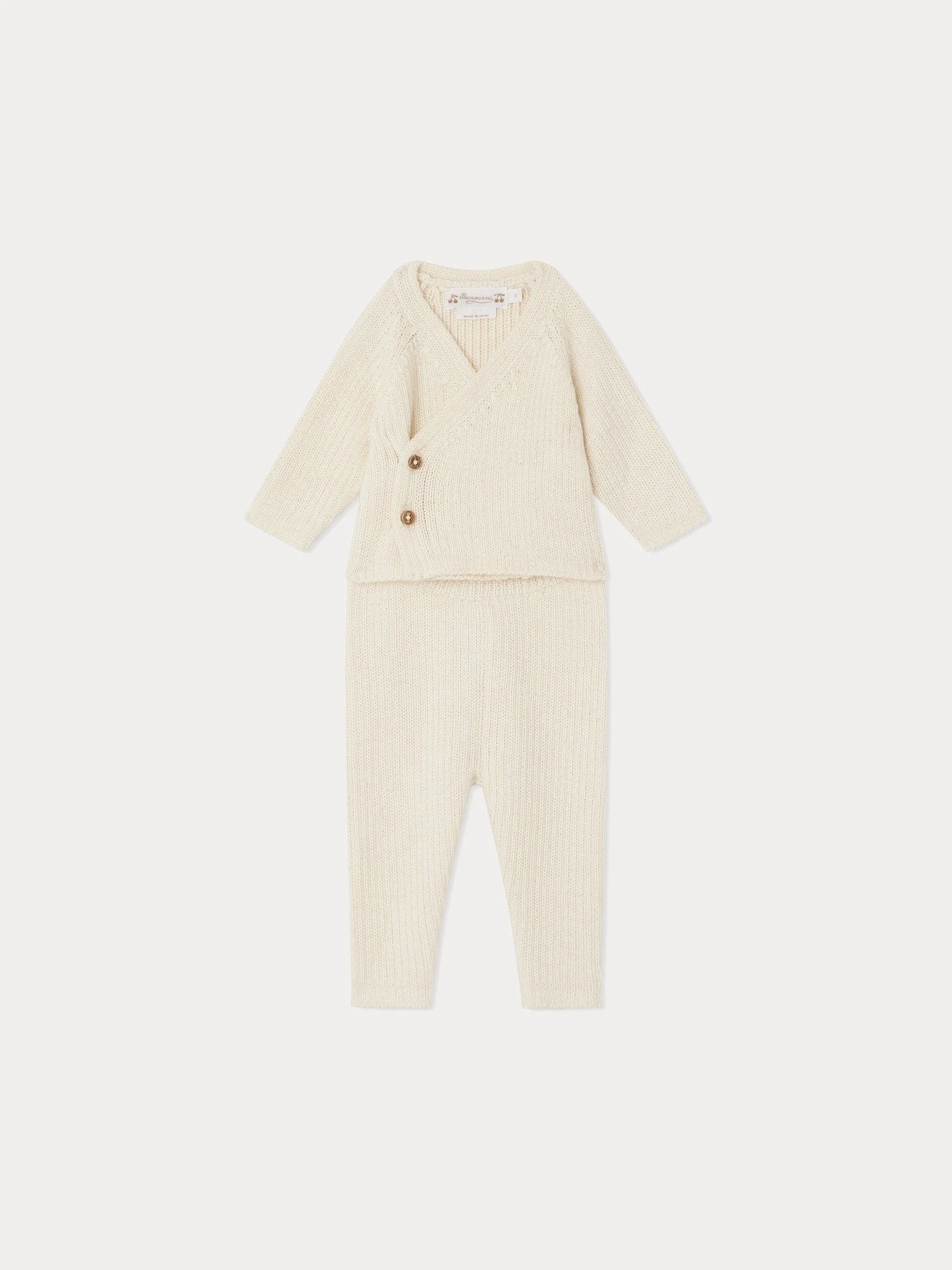 La douceur est au rendez-vous avec l’ensemble Theva pour bébé entièrement tricoté en alpaga agréable à porter. Le haut possède une ouverture croisée devant à deux boutons façon bois.