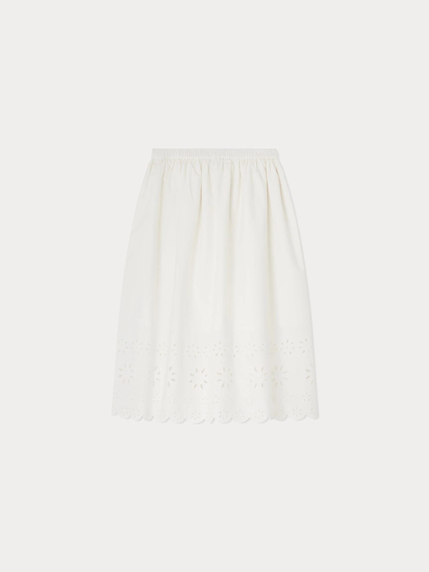 La jupe Flora habille les filles pour les cérémonies avec sa coupe longue à la base festonnée. Des détails fleuris en broderie anglaise subliment le bas de ce modèle uni.