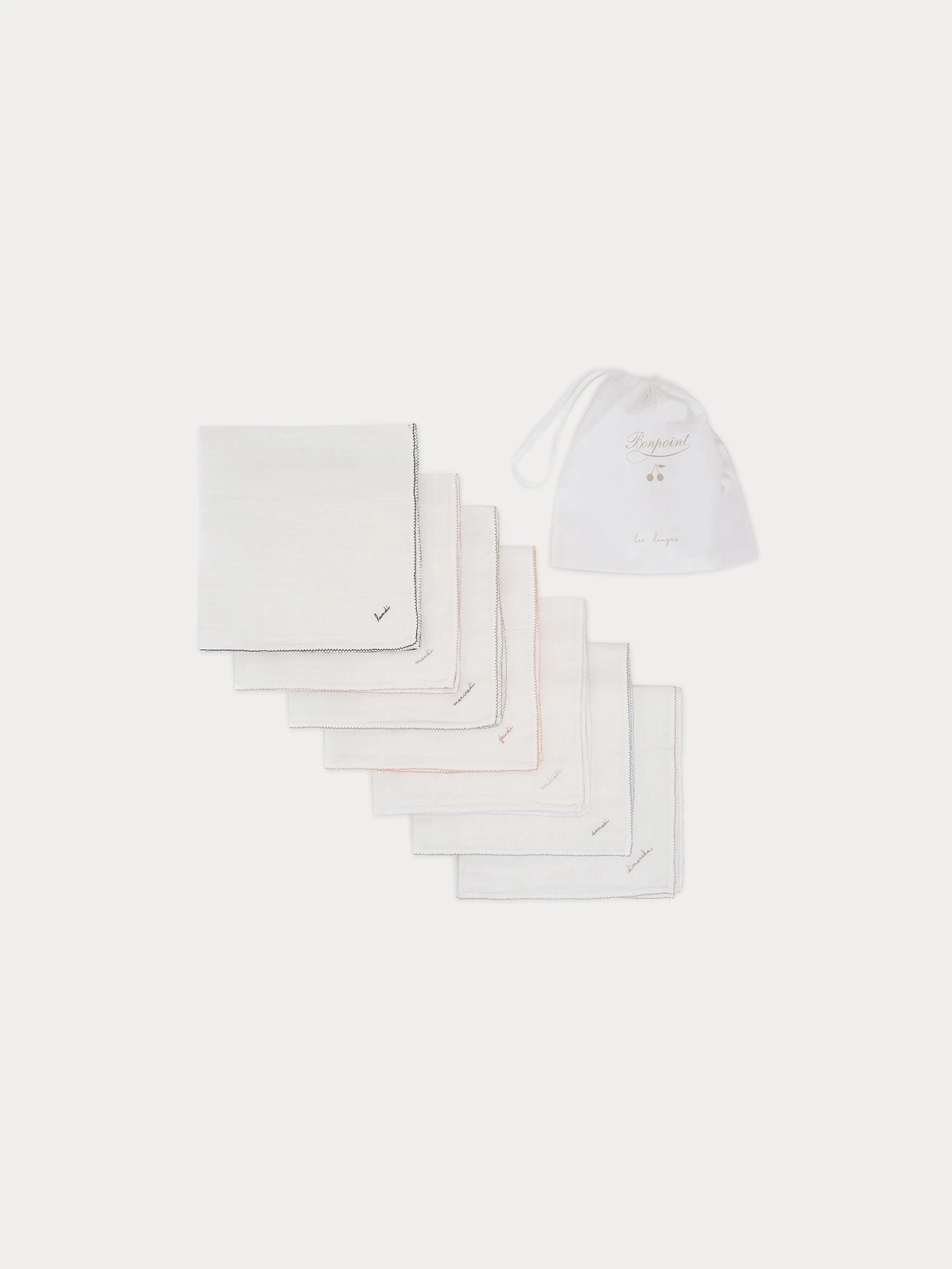 En coton tout doux, le lot de doudous Langes pour bébé est un iconique Bonpoint. Ces modèles unis sont chacun brodés d’un jour de la semaine en couleur contrastante.
