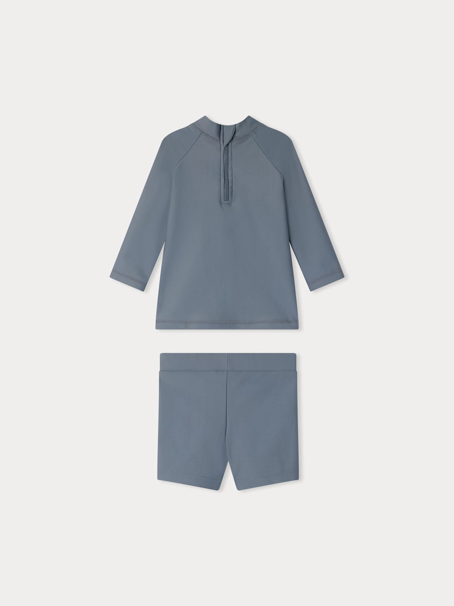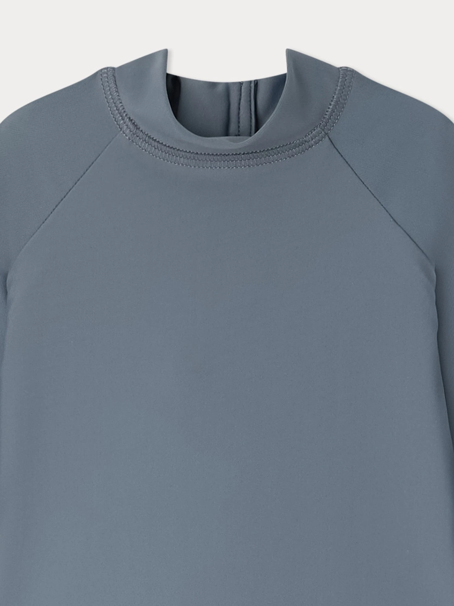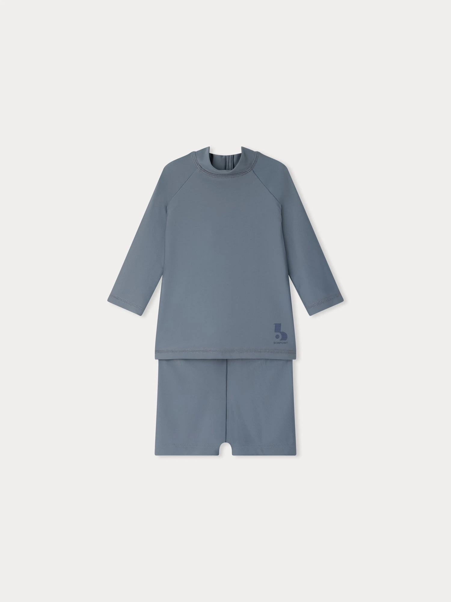 Ce maillot de bain Aldwin avec un indice de protection 50, est parfait pour bien protéger bébé à la plage ou à la piscine. Le logo Bonpoint est imprimé en bas de l’avant.