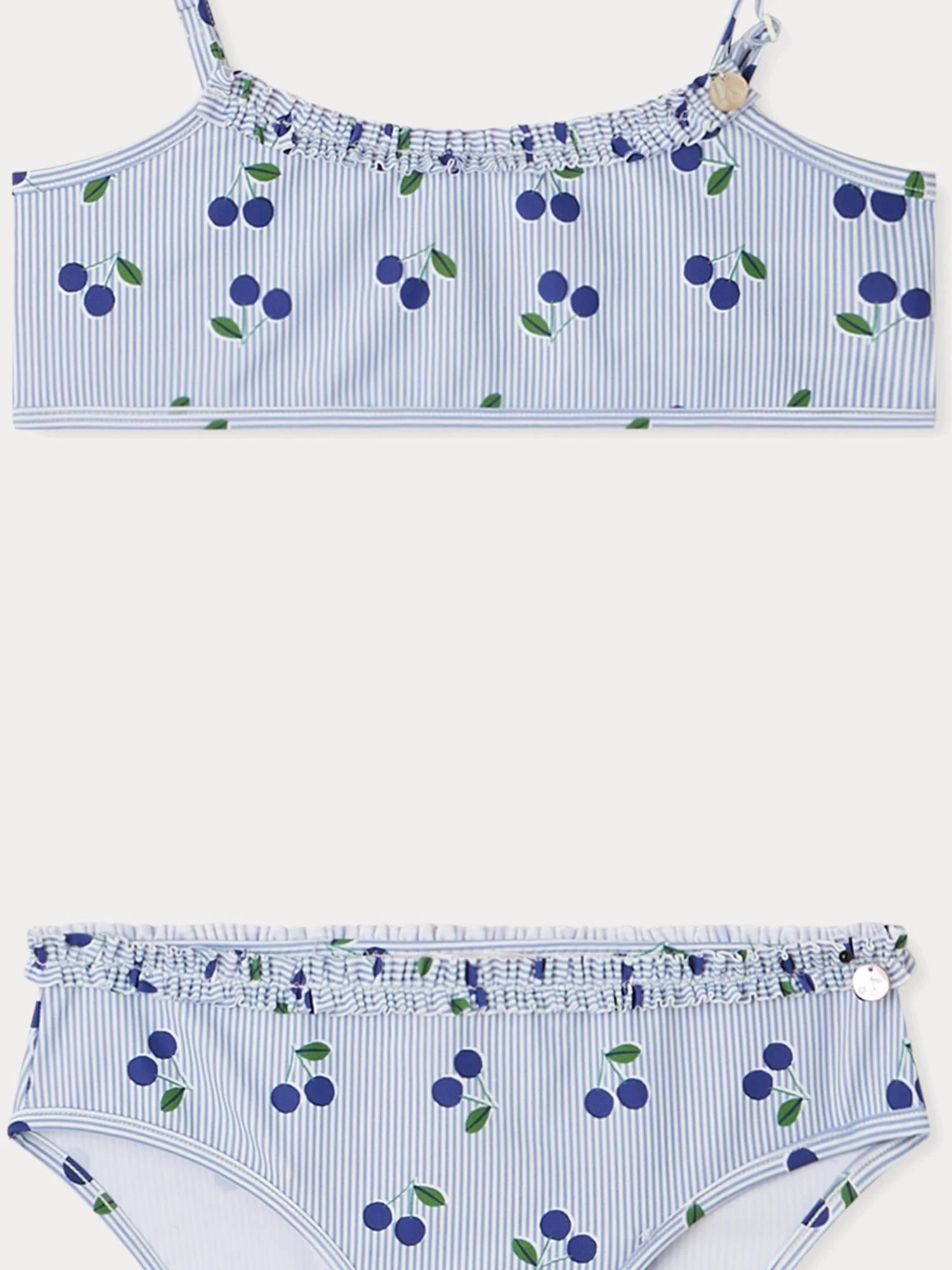 Les cerises emblématiques sont mises à l’honneur sur le maillot de bain pour fille Amari. Ce modèle deux pièces arbore des rayures verticales et est agrémenté de volant à l’encolure et à la taille.