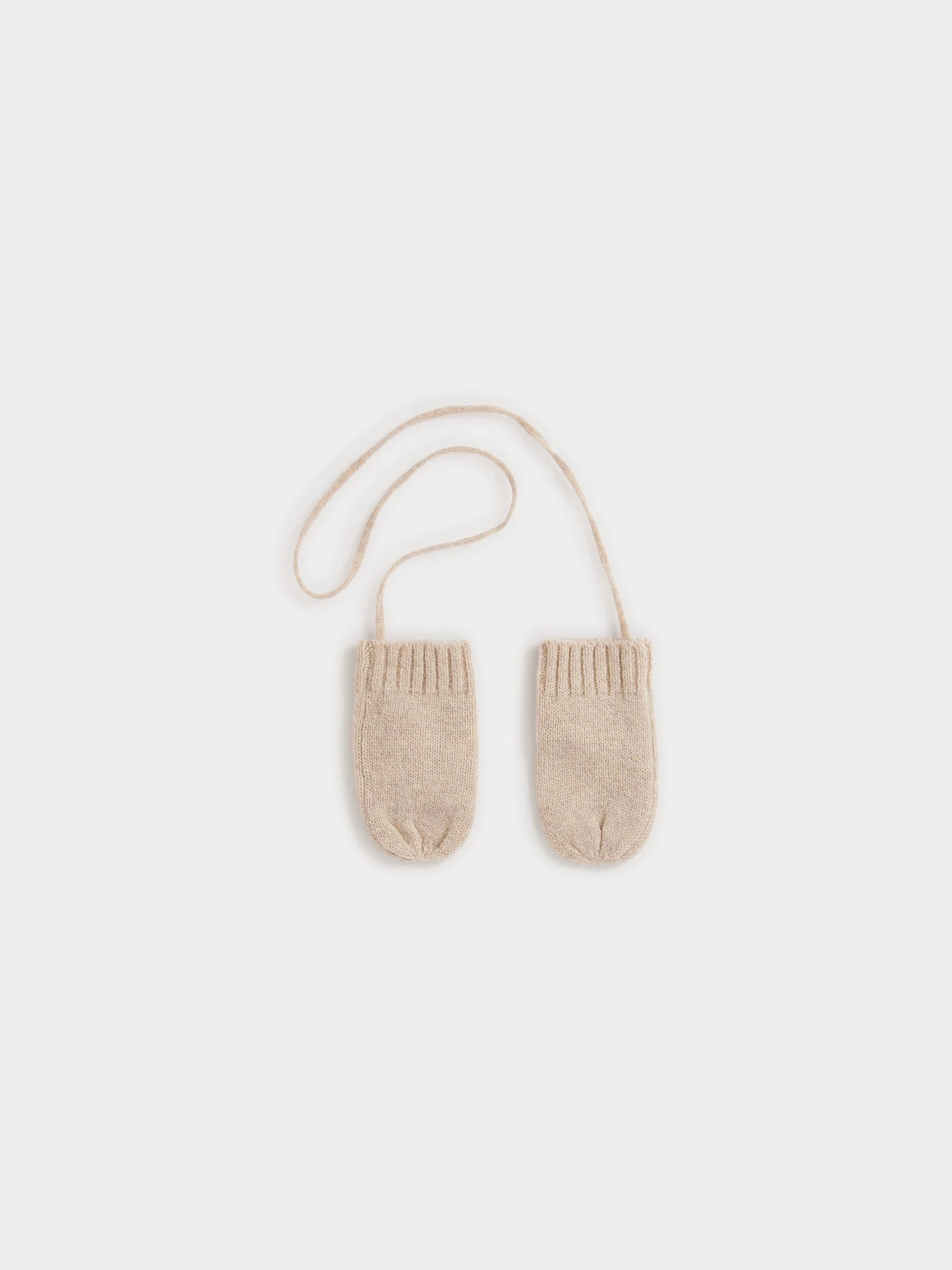En laine unie, ces moufles sans pouces gardent les mains de bébé au chaud. Un lien permet de les maintenir ensemble et d’éviter de les perdre.