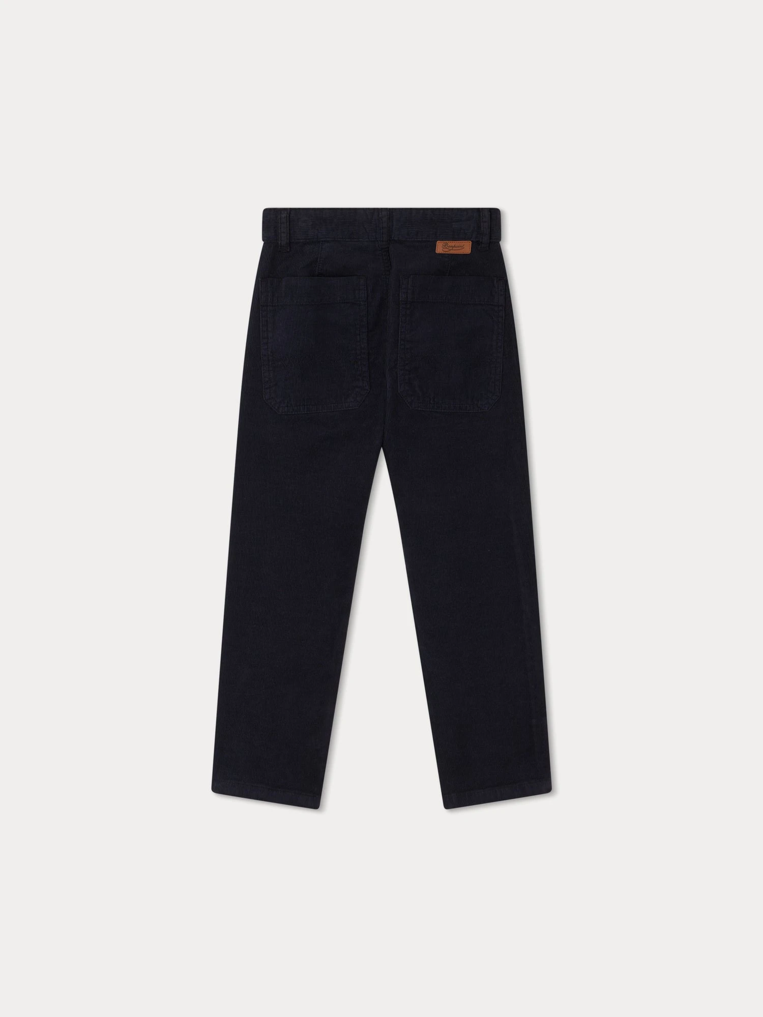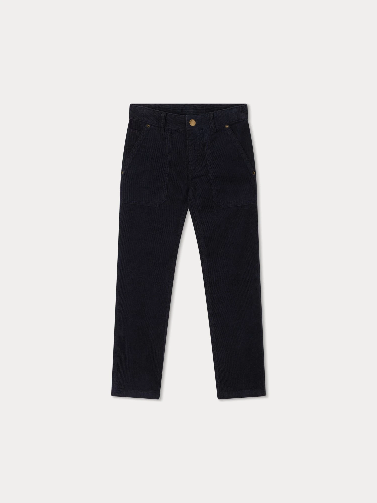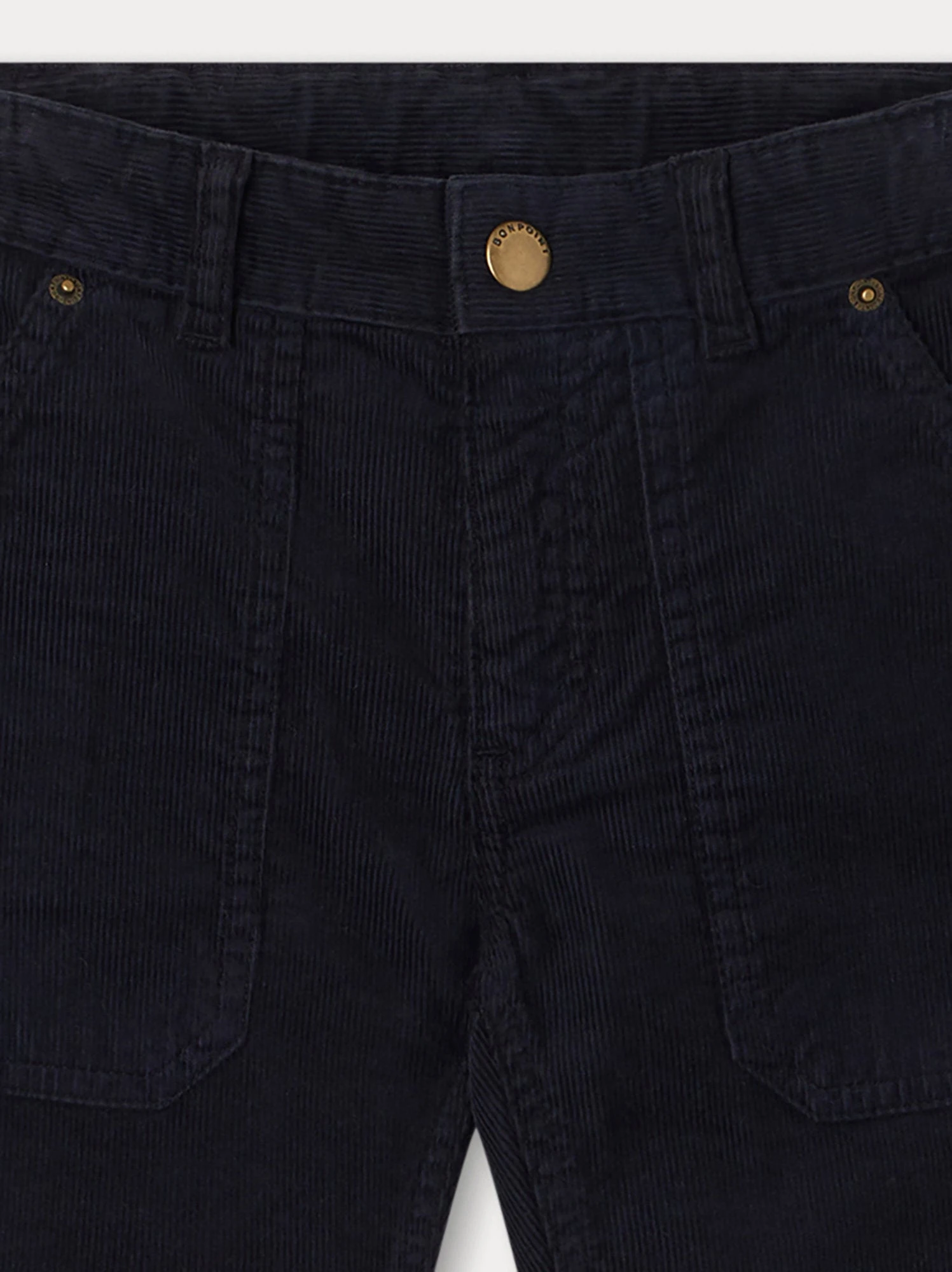 Le pantalon Malone pour garçon revisite le velours avec ses fines côtes raffinées. Ses deux poches plaquées devant se finissent par des rivets métalliques.