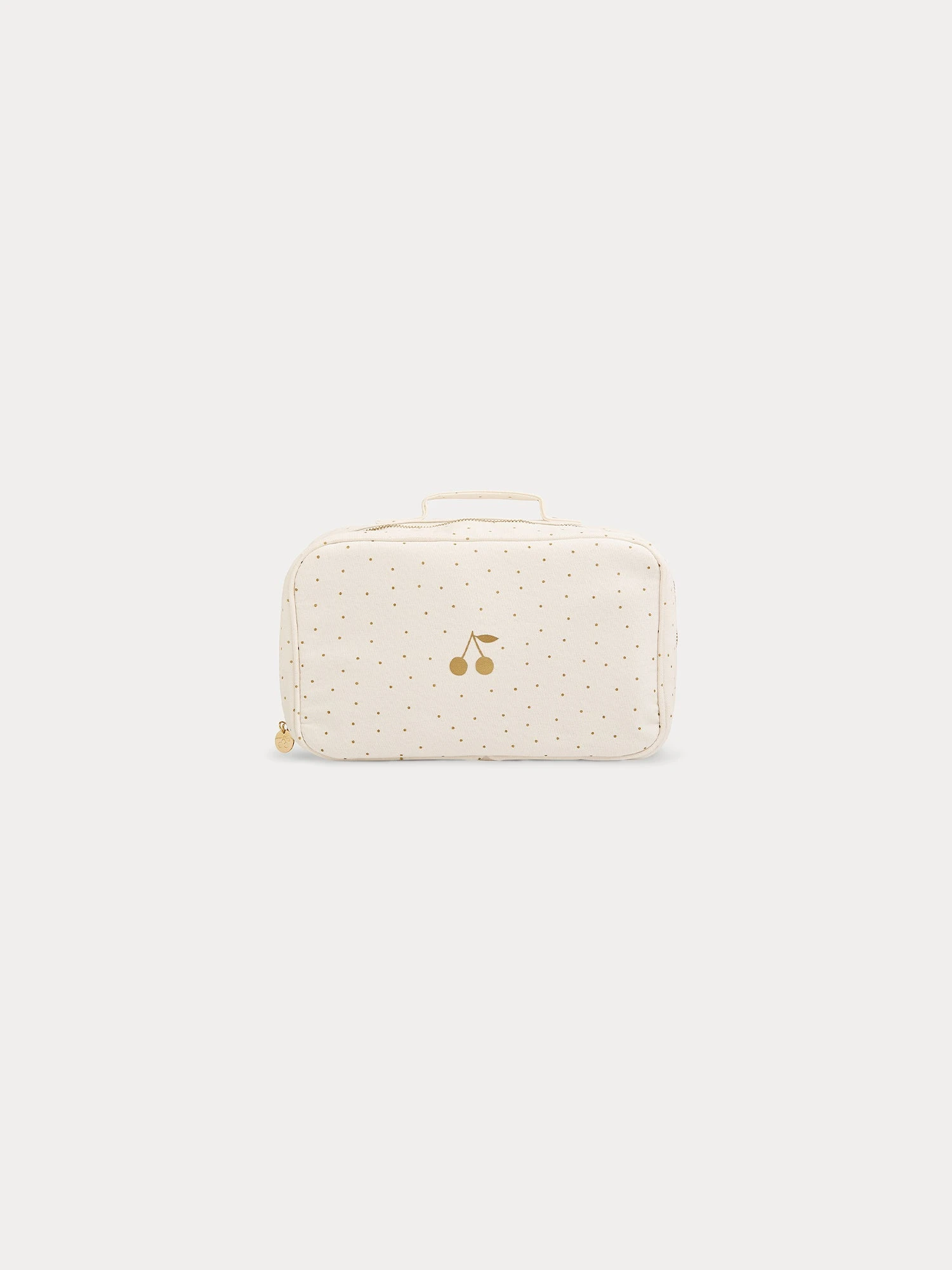 La cerise Bonpoint est à l’honneur sur cette petite valise pour bébé : imprimée devant et embossée sur la tirette métallique. Cet accessoire est réalisé dans un coton enduit à pois.