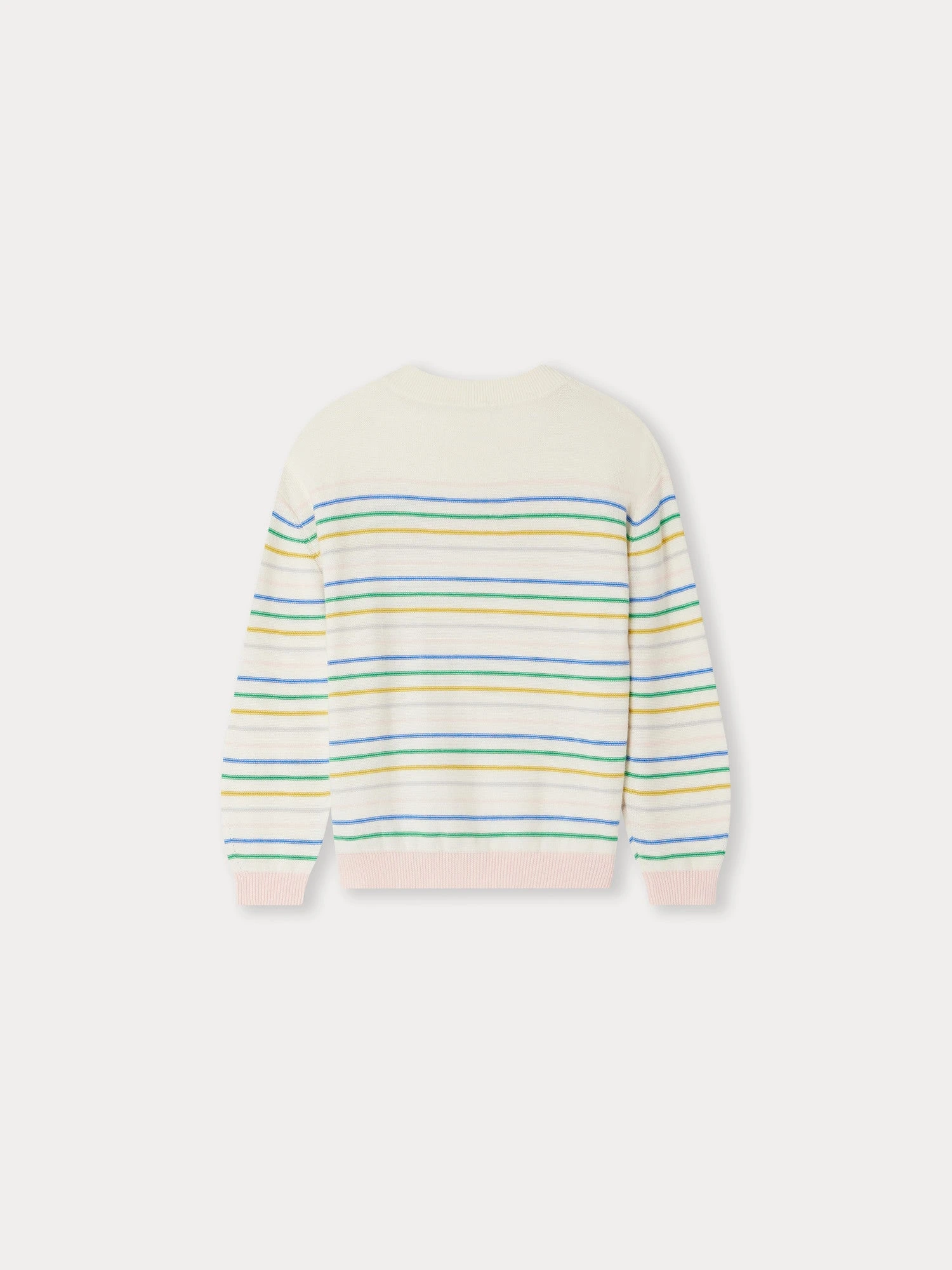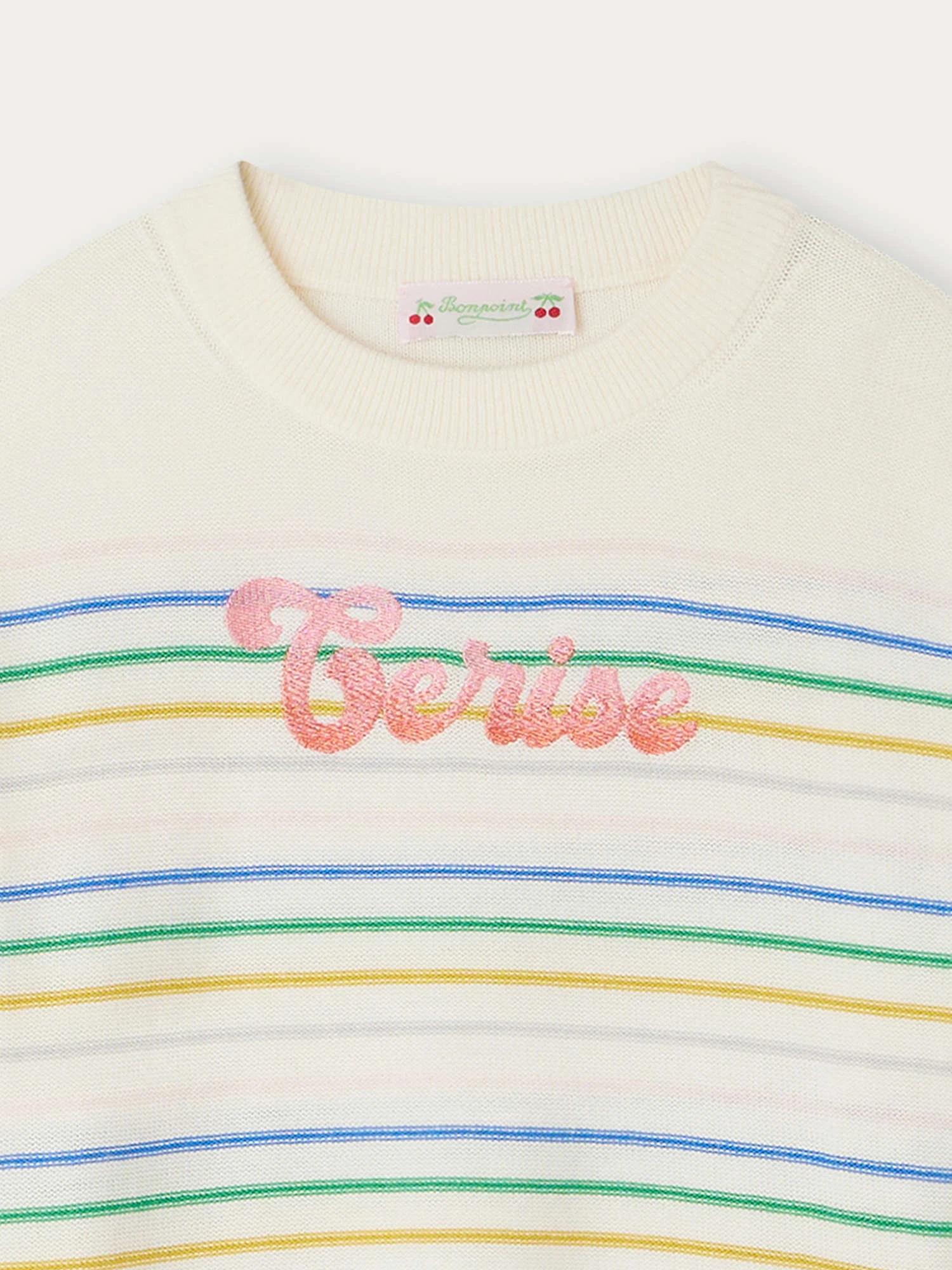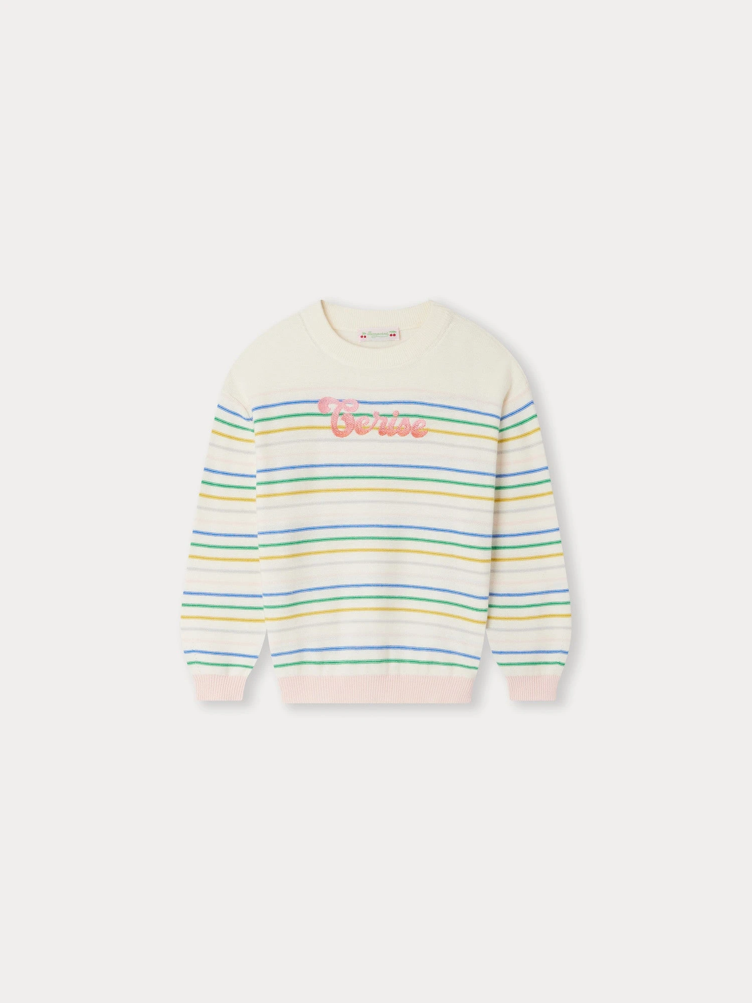 Le pull Anumati illumine le dressing des filles avec son motif à rayures multicolores, confectionné principalement en coton biologique. Son originalité est sublimée par l’inscription « Cerise » finement brodée sur le devant.