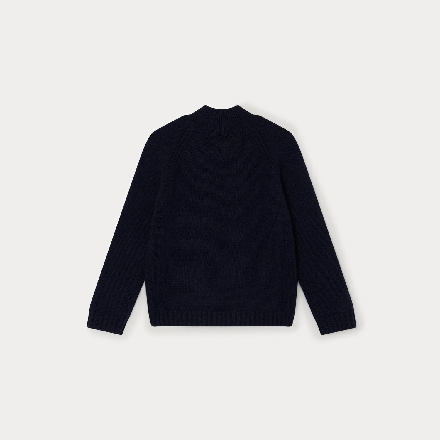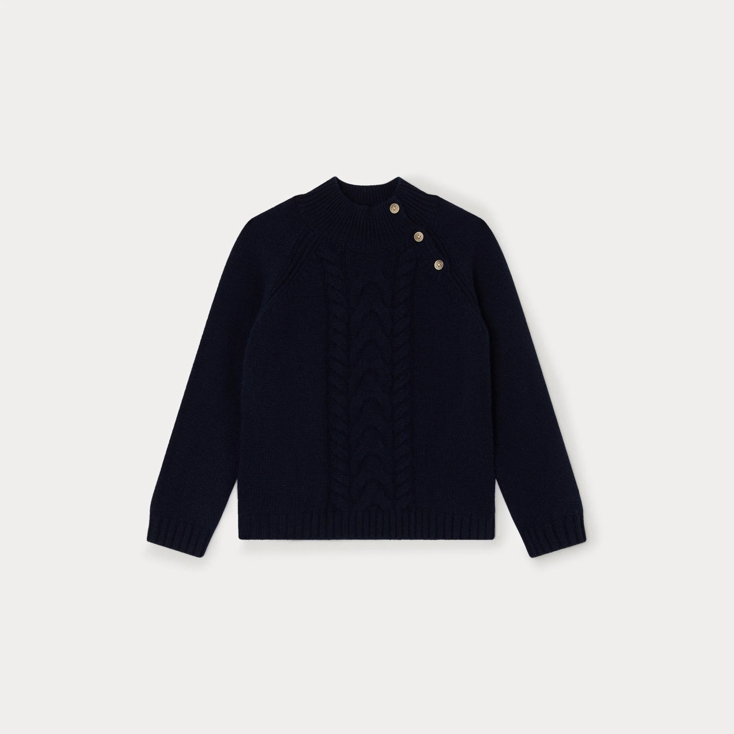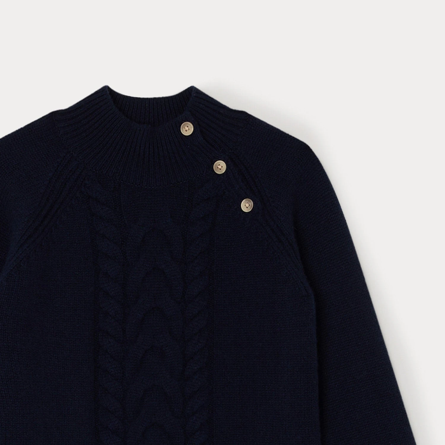 En cachemire d’un coloris intense, le pull raglan Tyoto s’orne d’une large torsade en relief à l’avant. Son col montant bien chaud en côtes 1/1 se boutonne sur l’épaule.