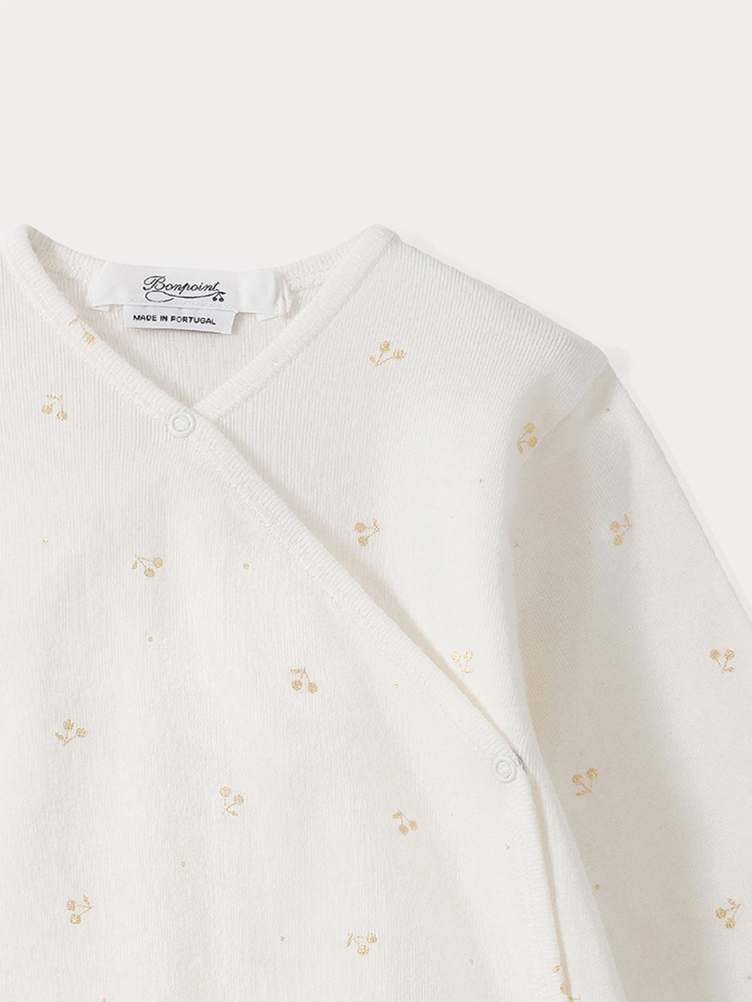 Ce pyjama pour bébé est coupé dans un coton bio et imprimé des cerises emblématiques Bonpoint. Son ouverture croisée à pressions est à la fois pratique et raffinée.